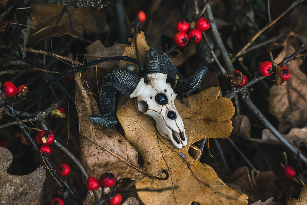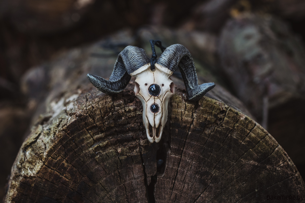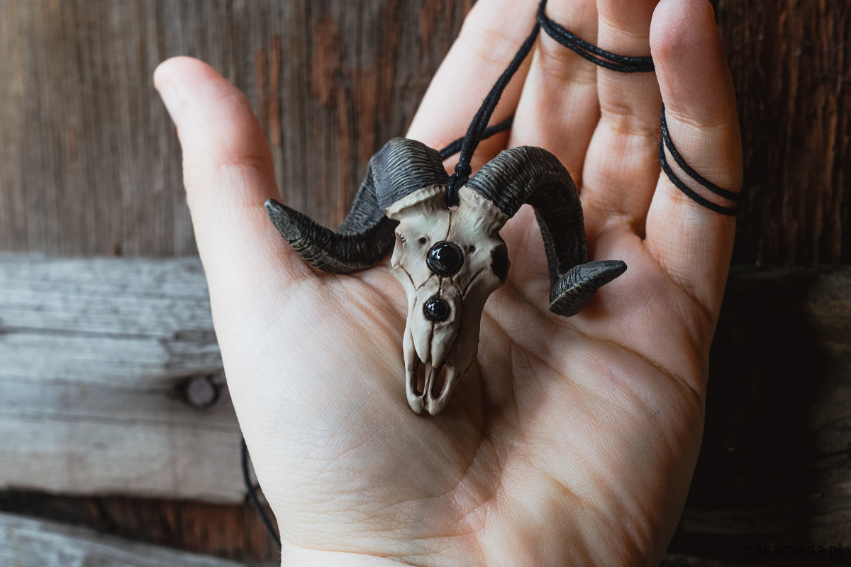 Stylowy dużu wisiorek w mrocznej estetyce w kształcie czaszki barana z czarnymi szklanymi kaboszonami. Będzie idealnym dodatkiem do stylizacji miejskiej czarownicy lub miłośnika stylu gotyckiego.