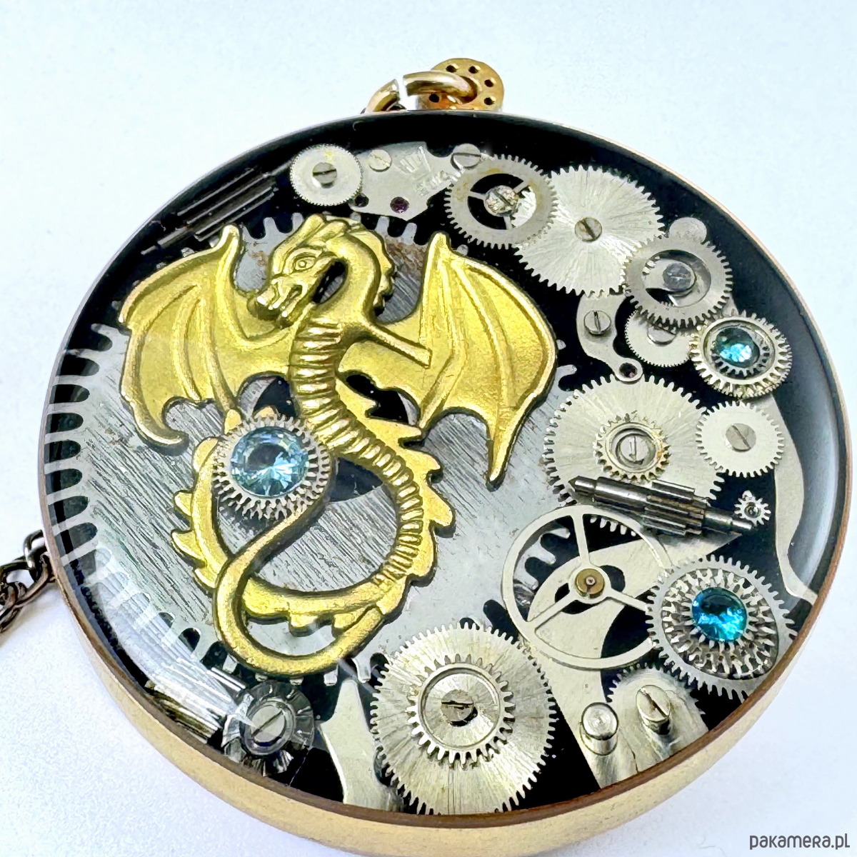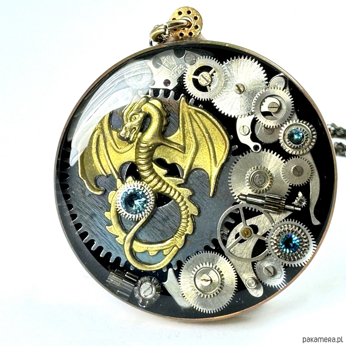 - Materiał: trybiki i elementy ze starego mechanizmu zegarka, smok w kolorze złotym, kamienie naturalne, srebrne trybiki