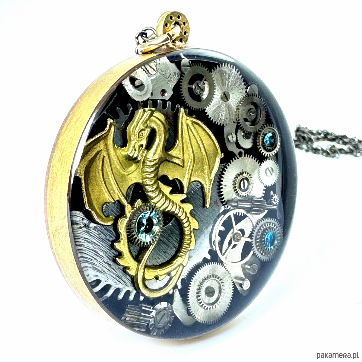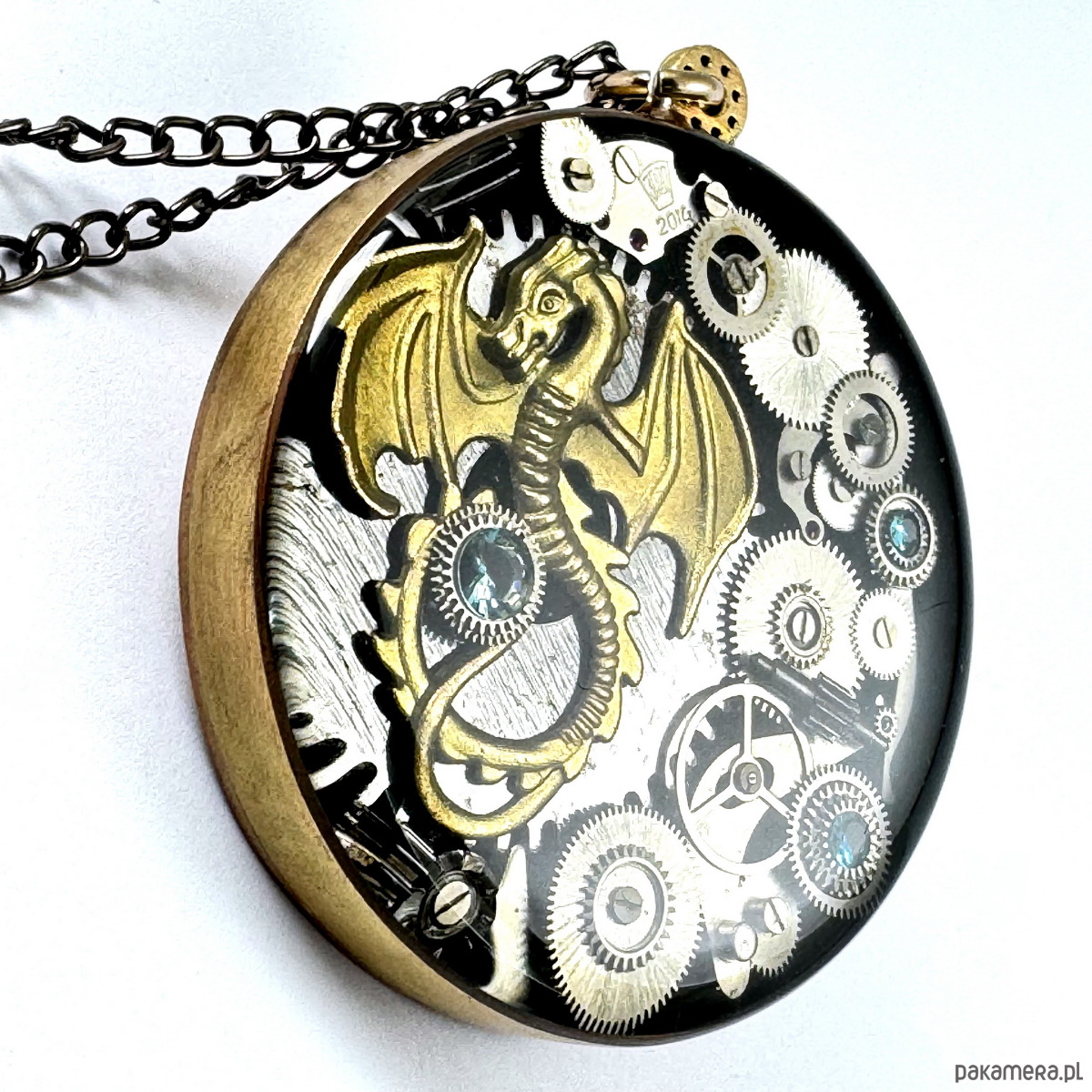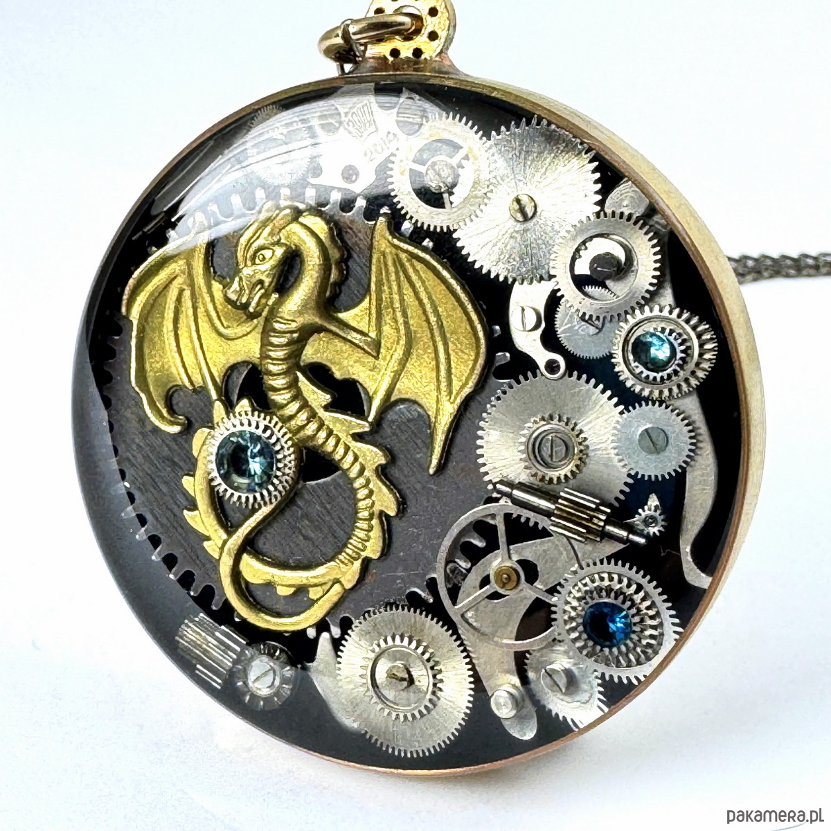 - Materiał: trybiki i elementy ze starego mechanizmu zegarka, smok w kolorze złotym, kamienie naturalne, srebrne trybiki