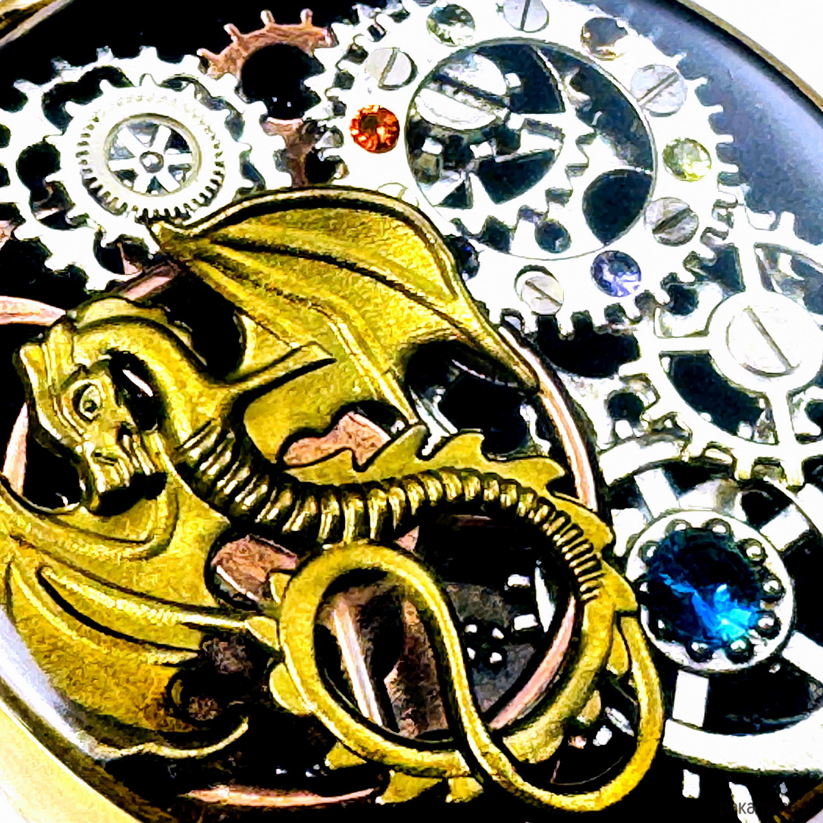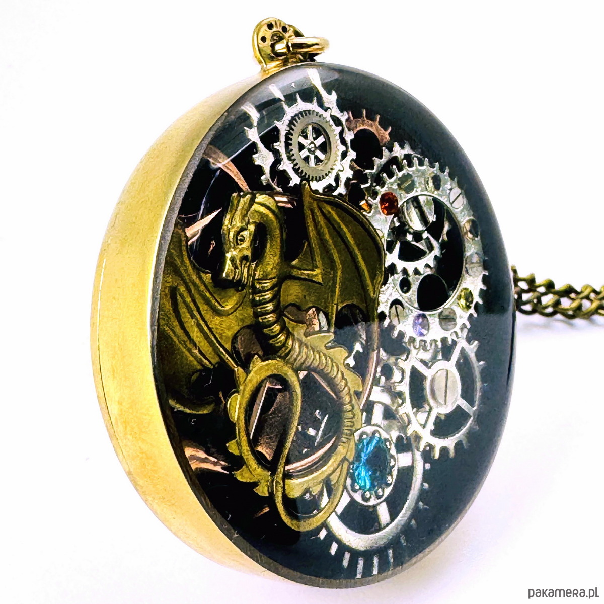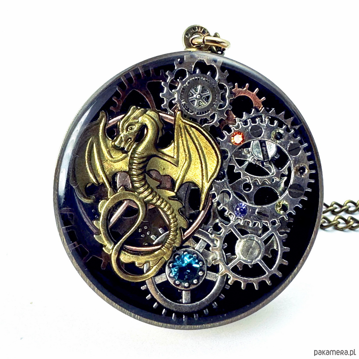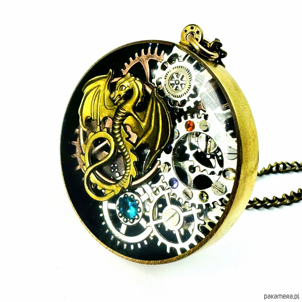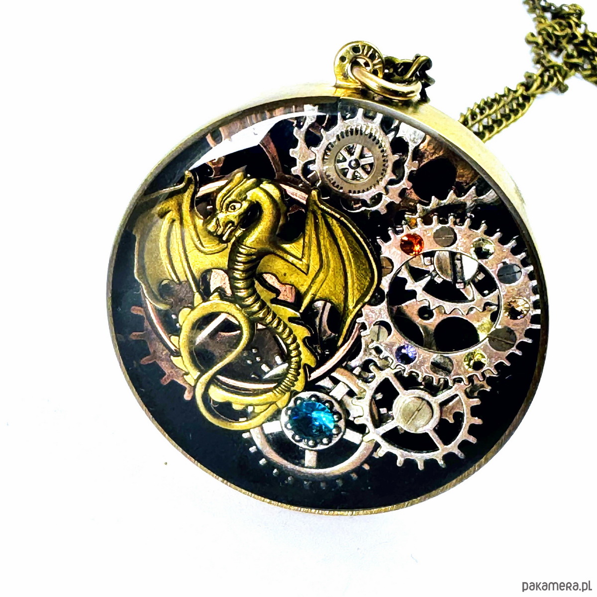 - Materiał: trybiki i elementy ze starego mechanizmu zegarka, złoty smok dumnie prężący się wśród trybików, piękne duże skrzydła z detalami wskazują na jego siłę i moc. Całość zatopiona jest w ręcznie kutą obręcz z czystego mosiądzu, a elementy w środku zatopione w sposób trójwymiarowy, bardzo przestrzenny.