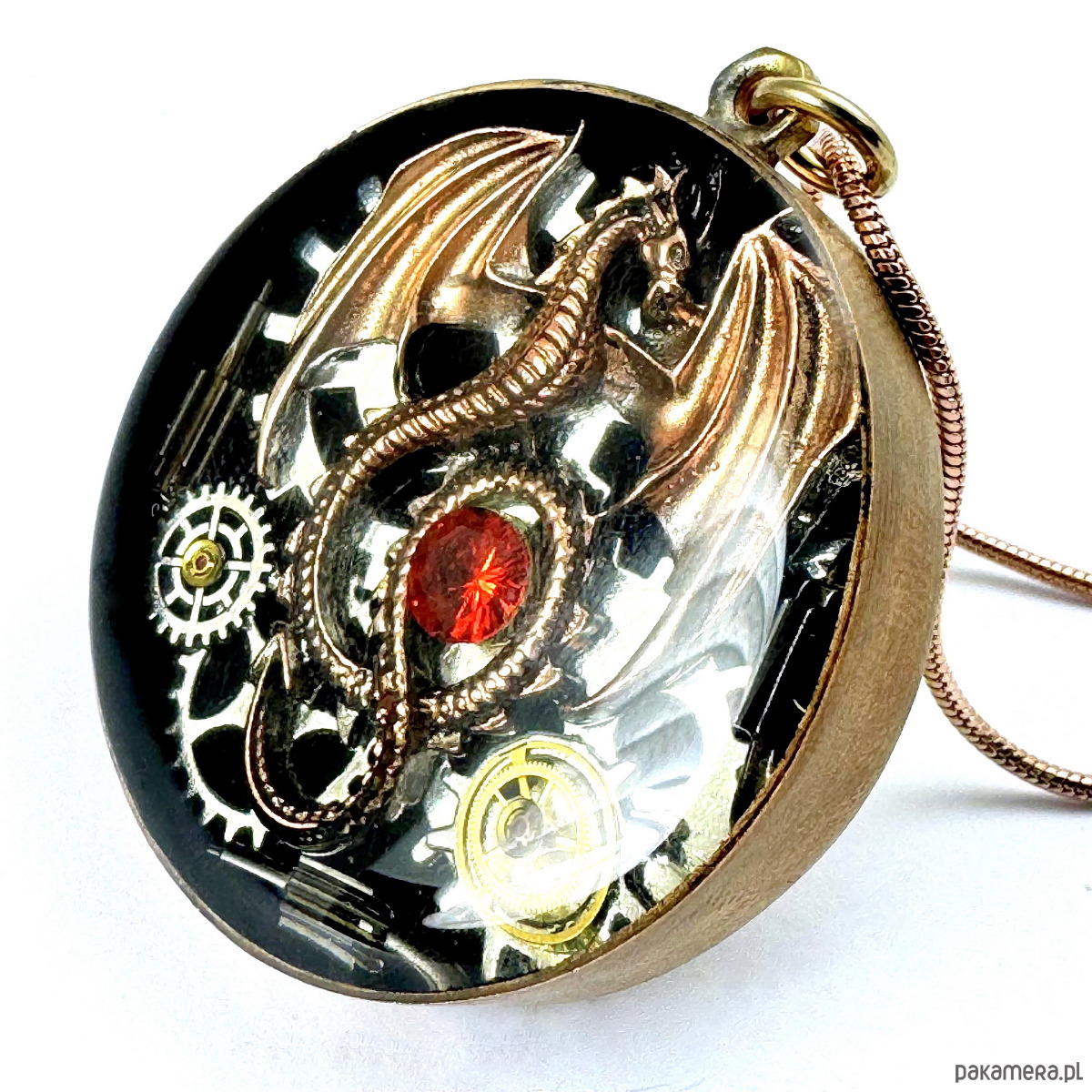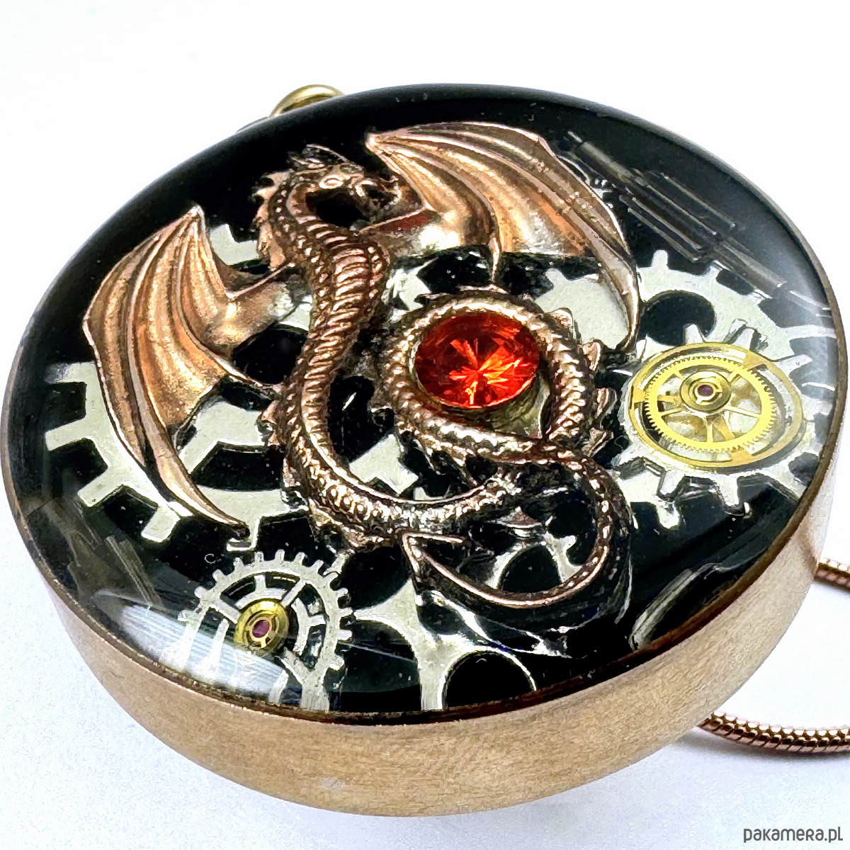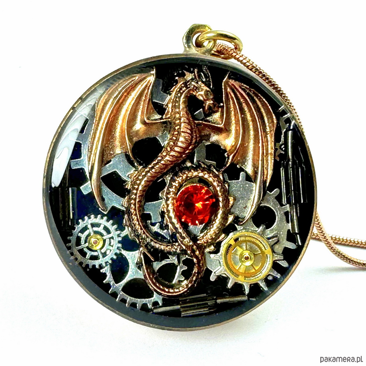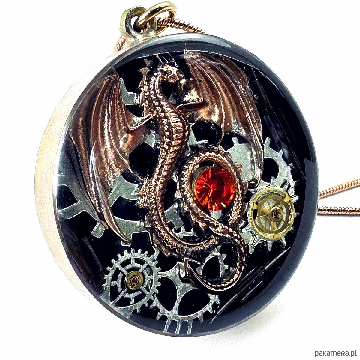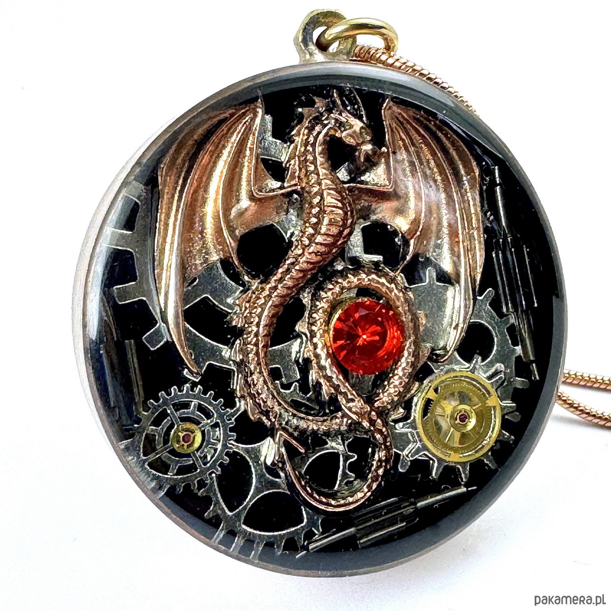 - Materiał: trybiki i elementy ze starego mechanizmu zegarka, smok w kolorze miedziano-złotym, kamienie naturalne, srebrne trybiki