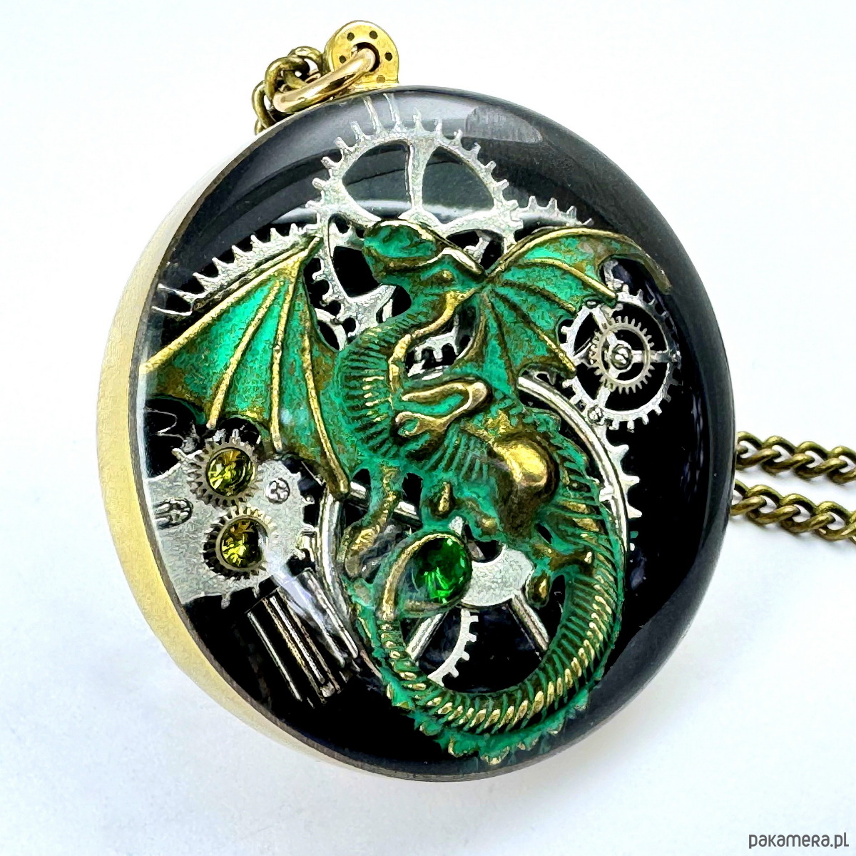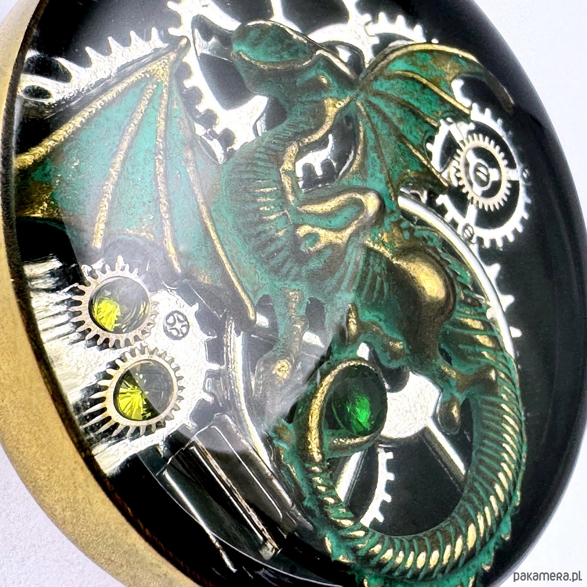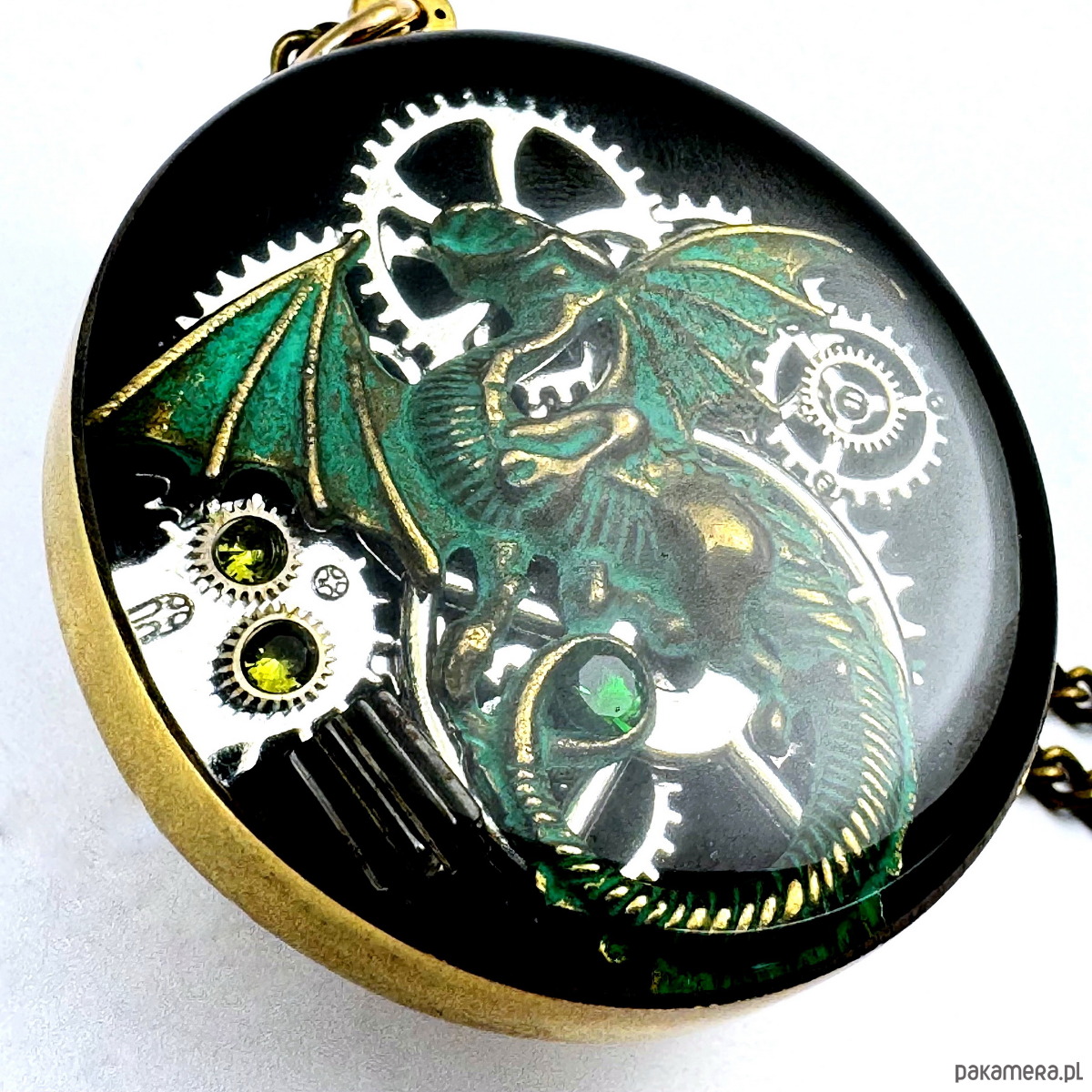 - Materiał: trybiki i elementy ze starego mechanizmu zegarka, Zielony smok ze złotymi przebłyskami na skrzydłach prężący się wśród trybików. Mięsisty, strukturalny ogon wijący się na dole przykuwa uwagę. Całość zatopiona jest w ręcznie kutą obręcz z czystego mosiądzu. Elementy w środku zatopione w sposób trójwymiarowy, bardzo przestrzenny nadają niesamowitej głębi.