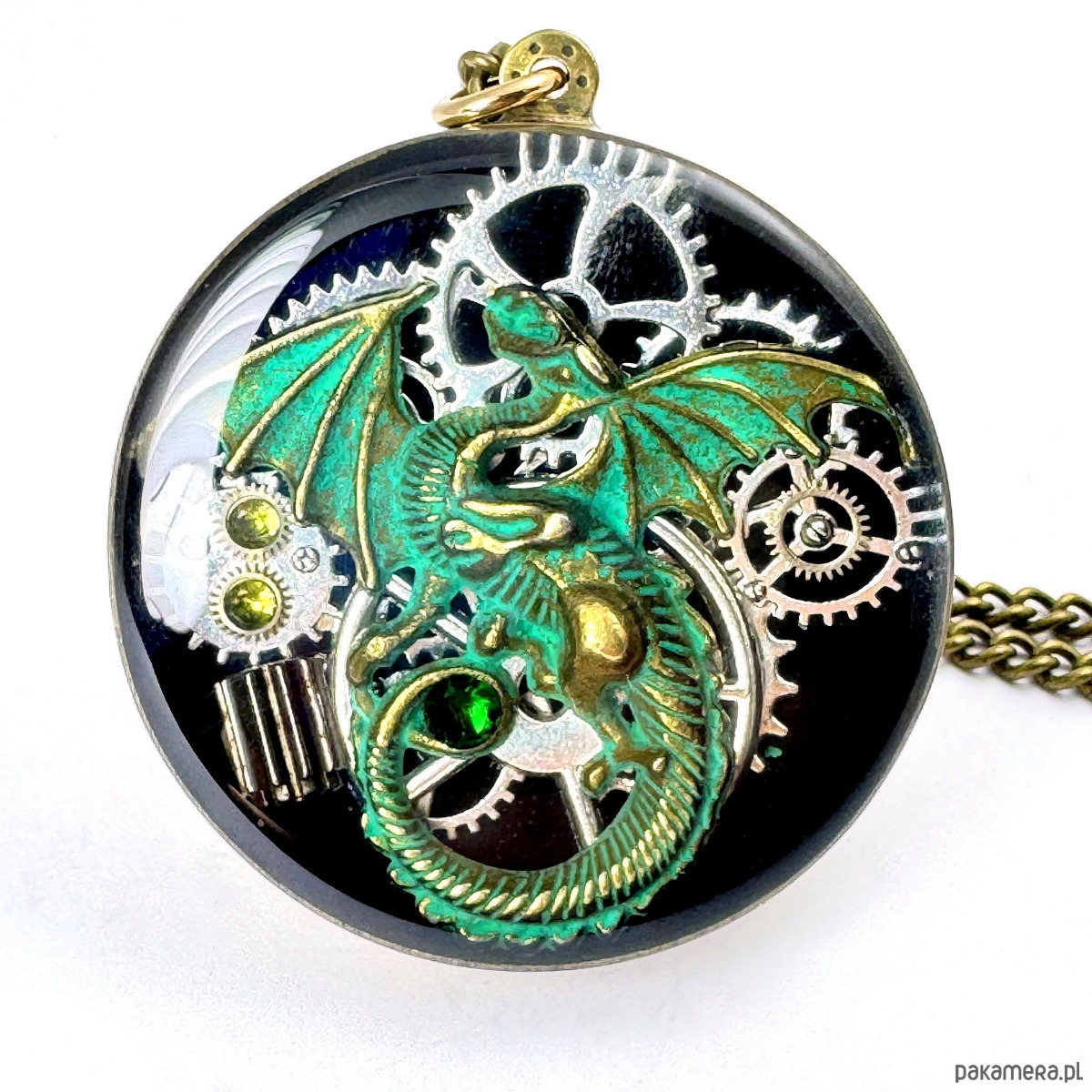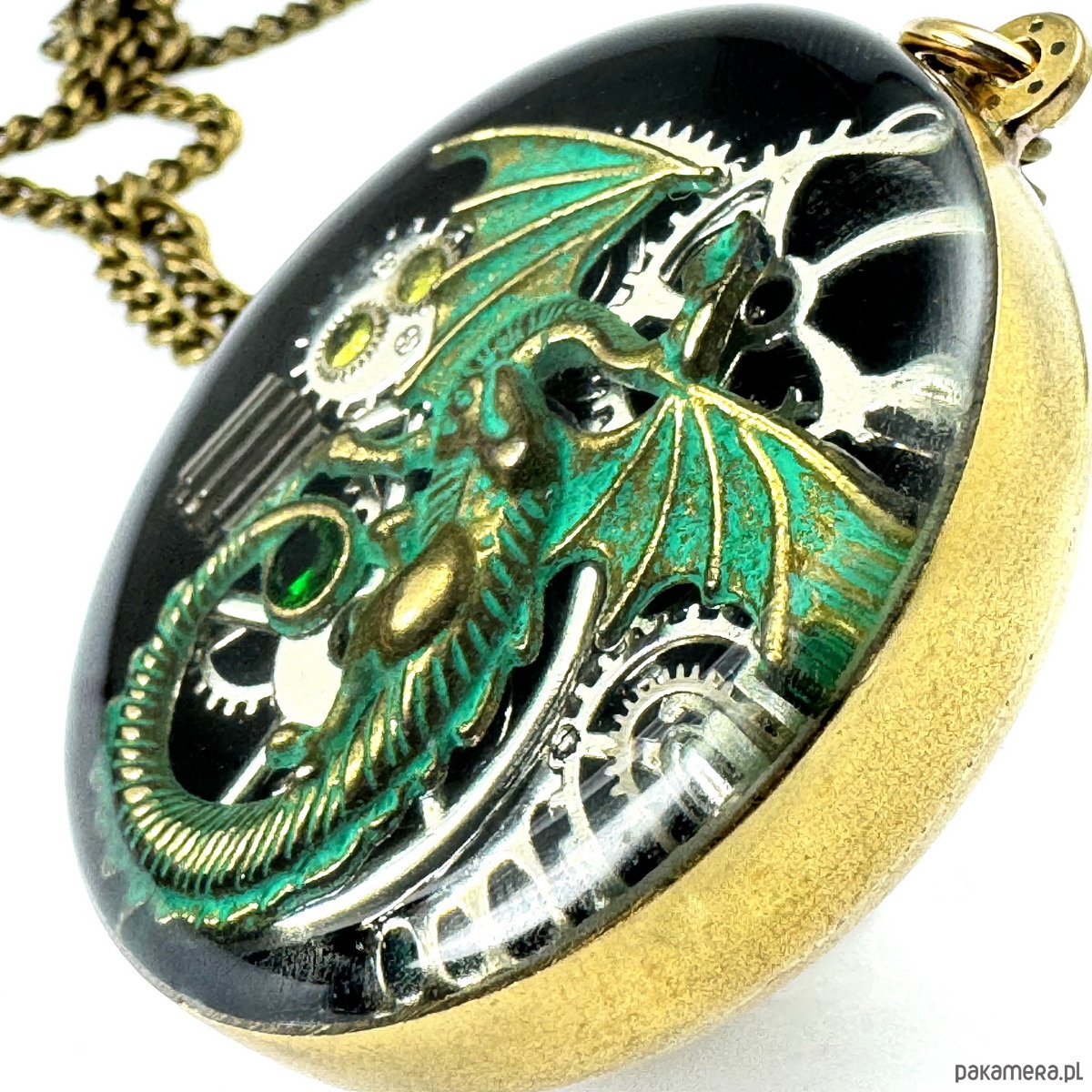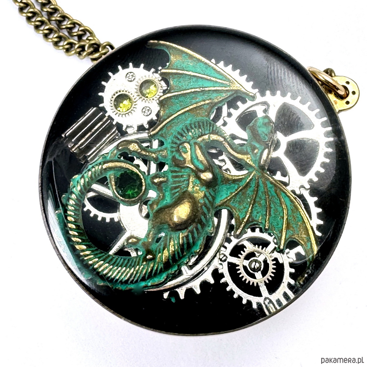 - Materiał: trybiki i elementy ze starego mechanizmu zegarka, Zielony smok ze złotymi przebłyskami na skrzydłach prężący się wśród trybików. Mięsisty, strukturalny ogon wijący się na dole przykuwa uwagę. Całość zatopiona jest w ręcznie kutą obręcz z czystego mosiądzu. Elementy w środku zatopione w sposób trójwymiarowy, bardzo przestrzenny nadają niesamowitej głębi.