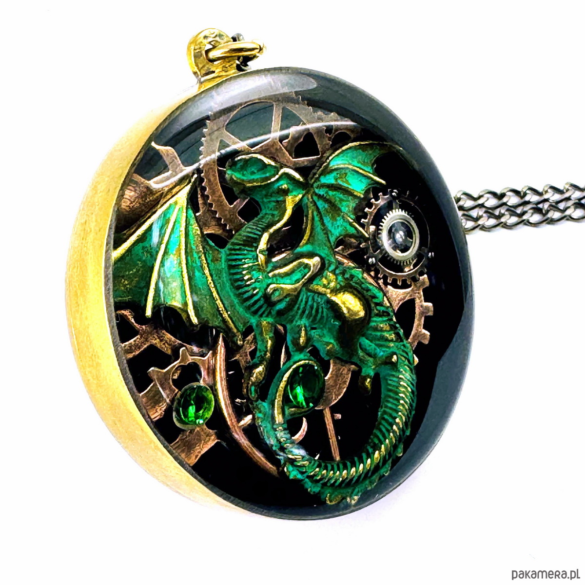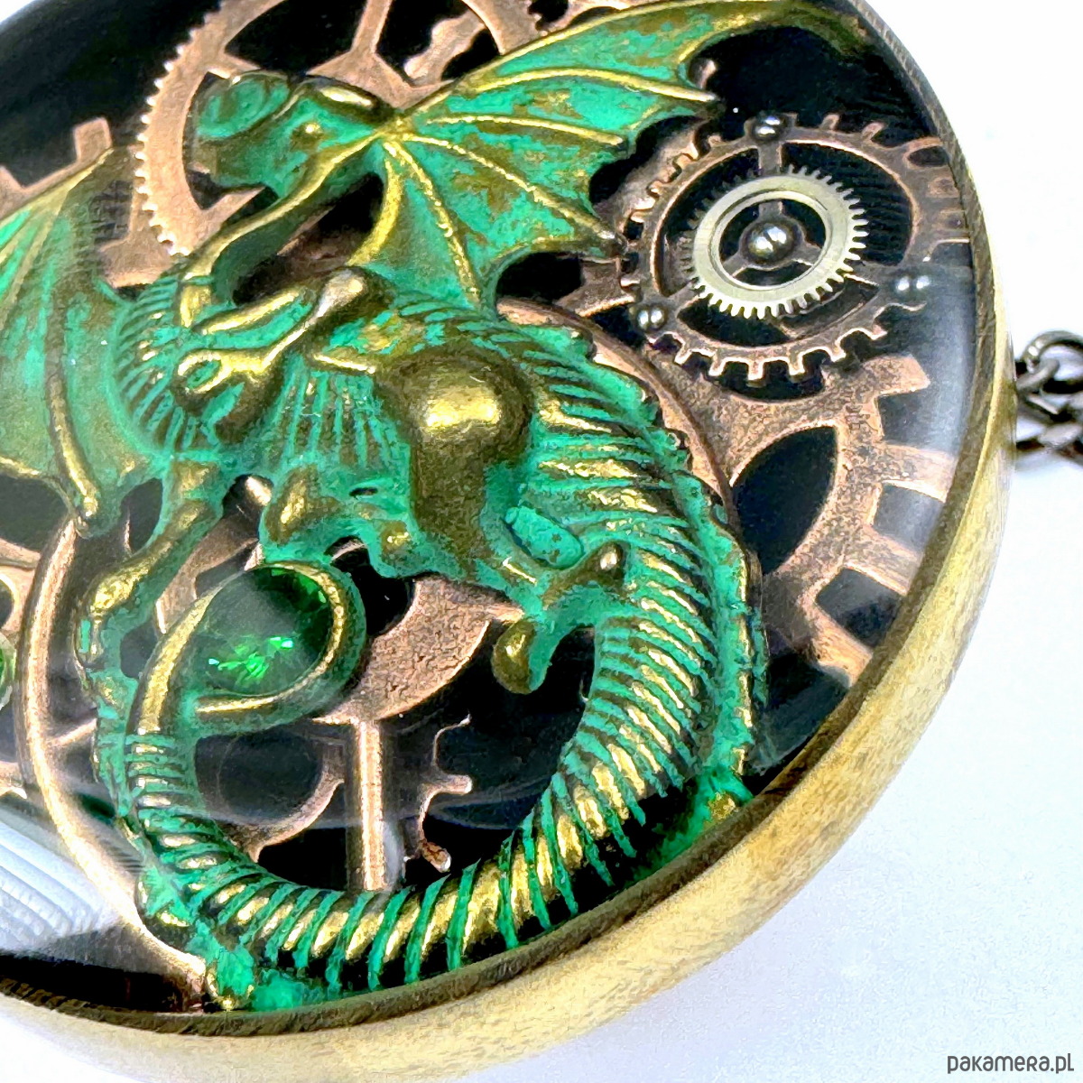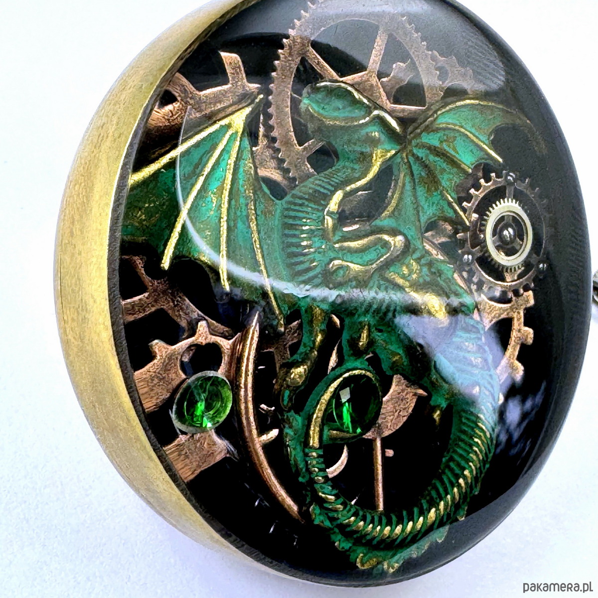 - Materiał: trybiki i elementy ze starego mechanizmu zegarka, złoty smok dumnie prężący się wśród trybików, piękne duże skrzydła z detalami wskazują na jego siłę i moc. Całość zatopiona jest w ręcznie kutą obręcz z czystego mosiądzu, a elementy w środku zatopione w sposób trójwymiarowy, bardzo przestrzenny.