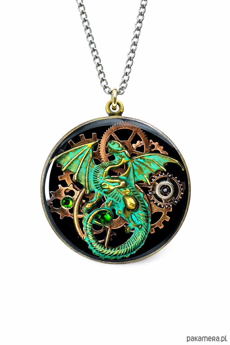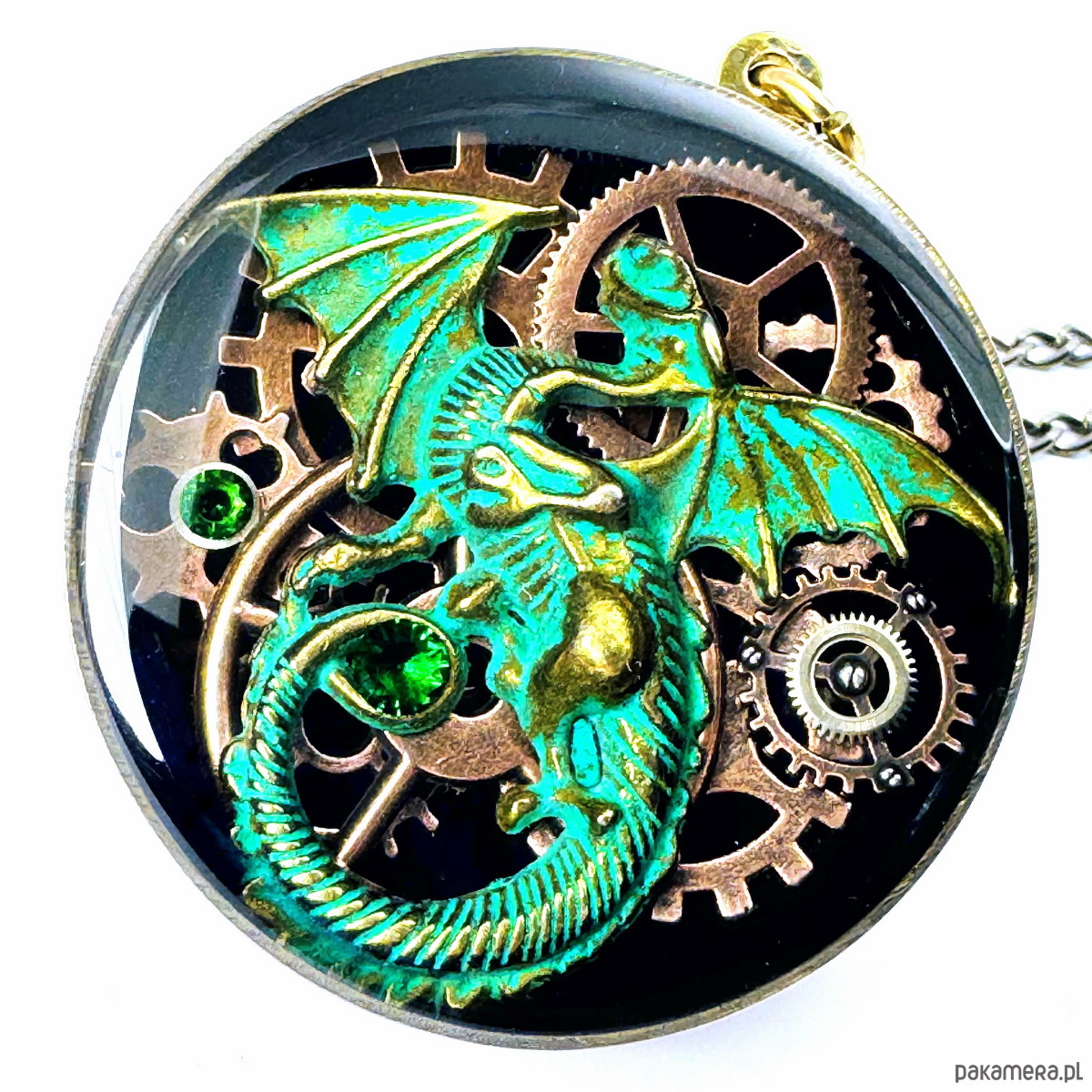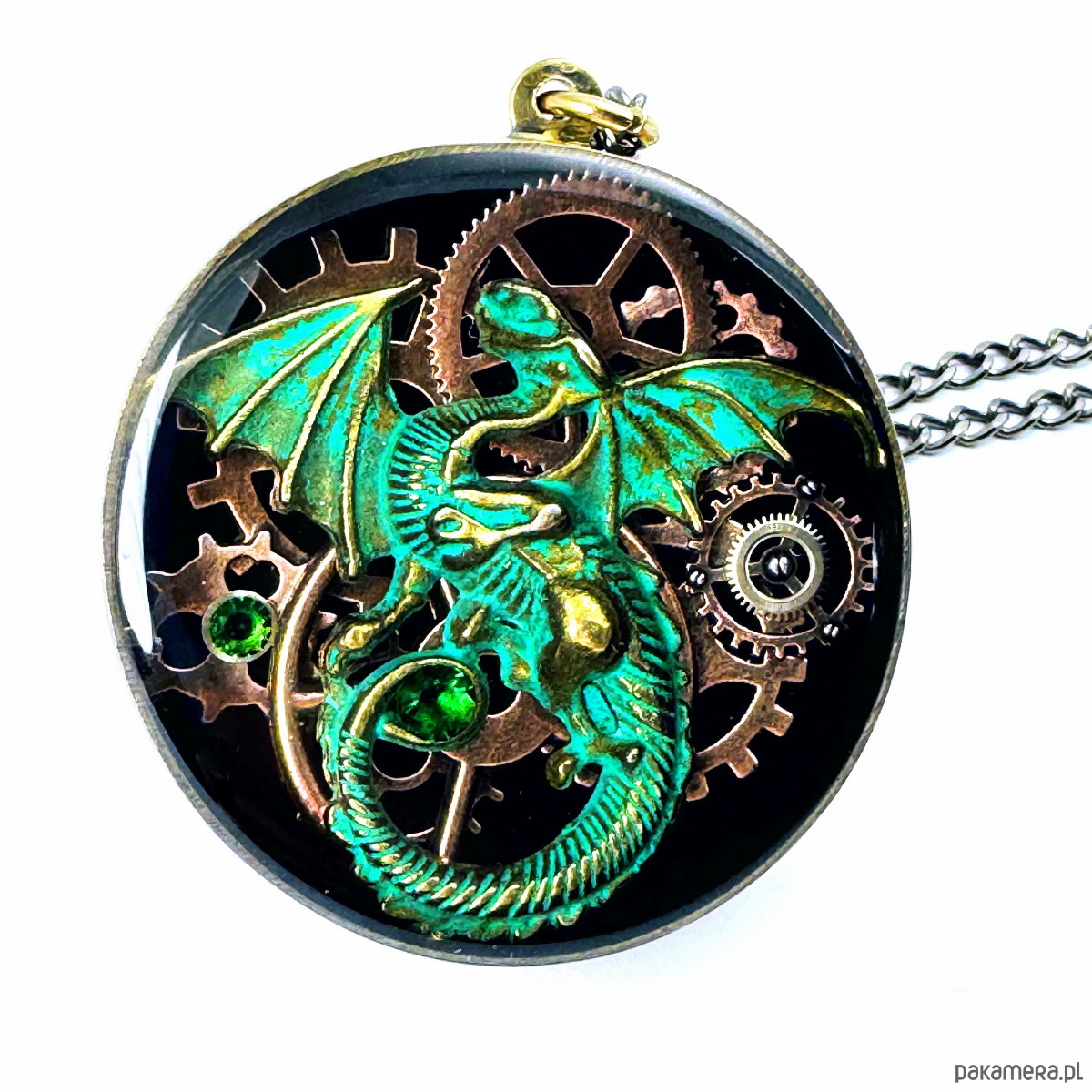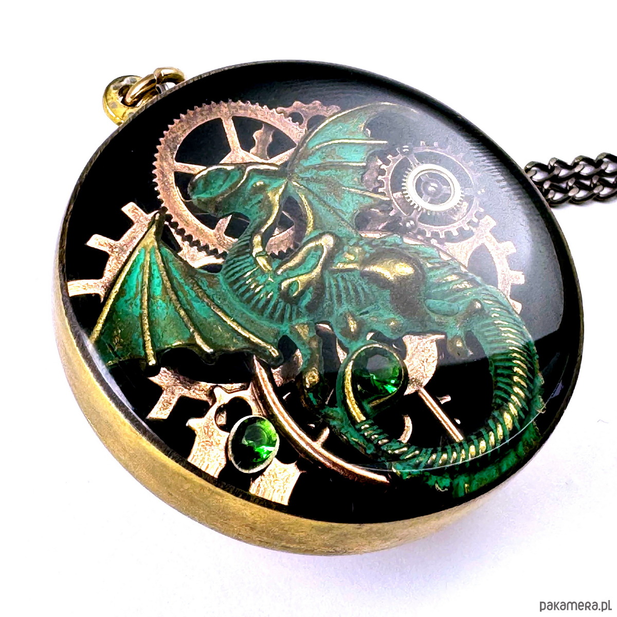 - Materiał: trybiki i elementy ze starego mechanizmu zegarka, złoty smok dumnie prężący się wśród trybików, piękne duże skrzydła z detalami wskazują na jego siłę i moc. Całość zatopiona jest w ręcznie kutą obręcz z czystego mosiądzu, a elementy w środku zatopione w sposób trójwymiarowy, bardzo przestrzenny.