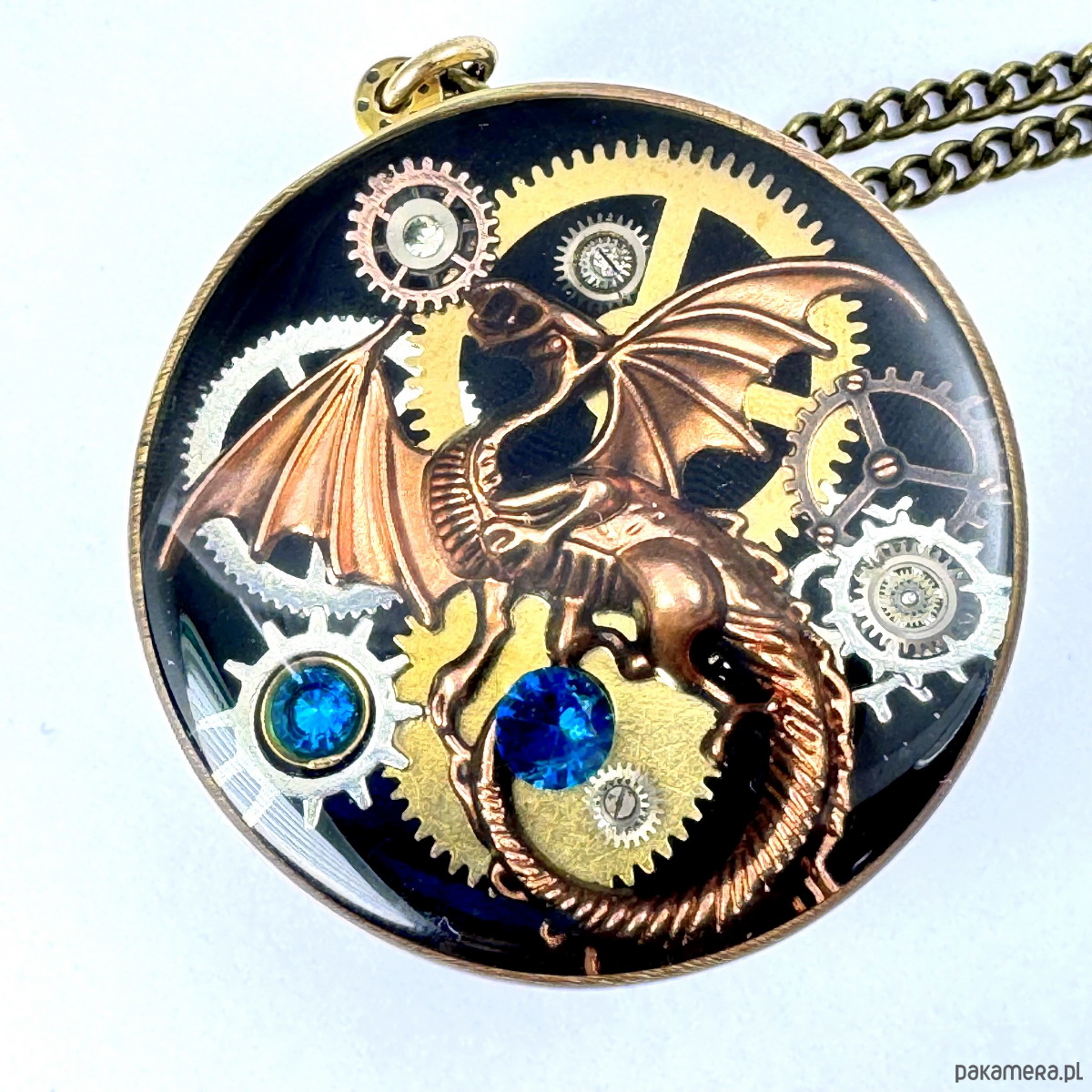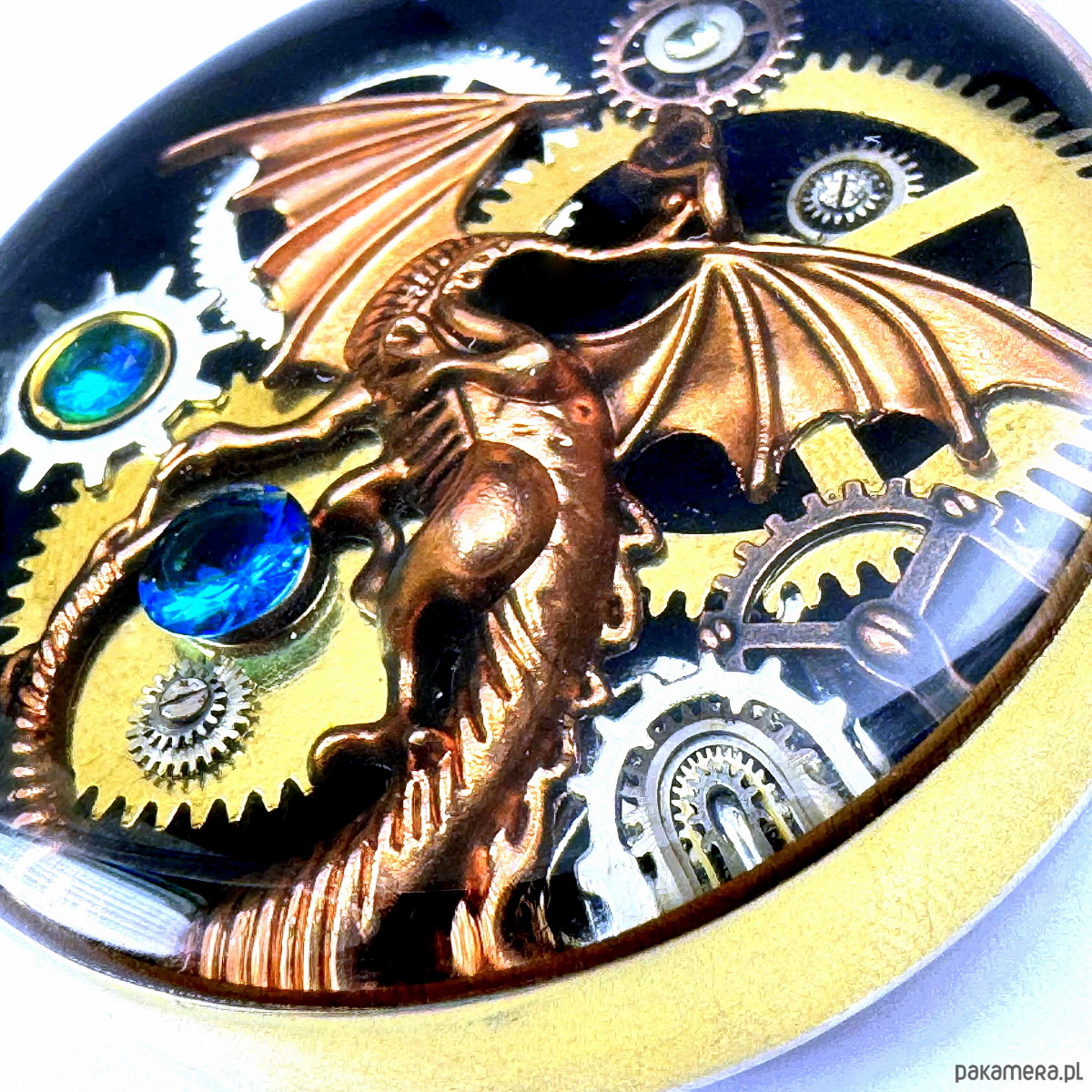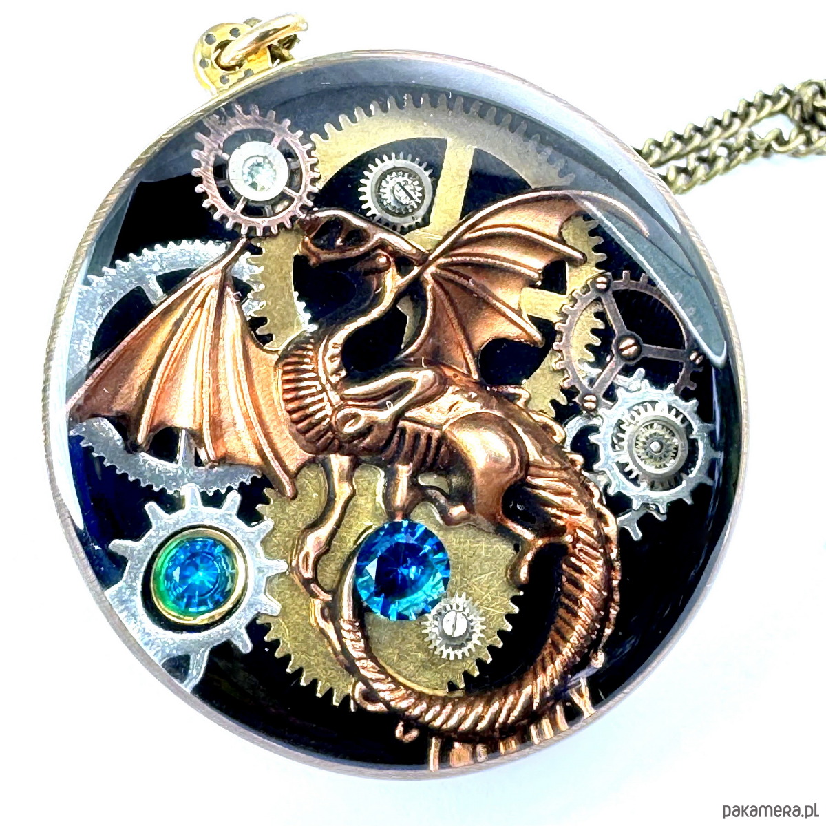 - Materiał: trybiki i elementy ze starego mechanizmu zegarka, smok w kolorze mosiężnym, kamienie naturalne