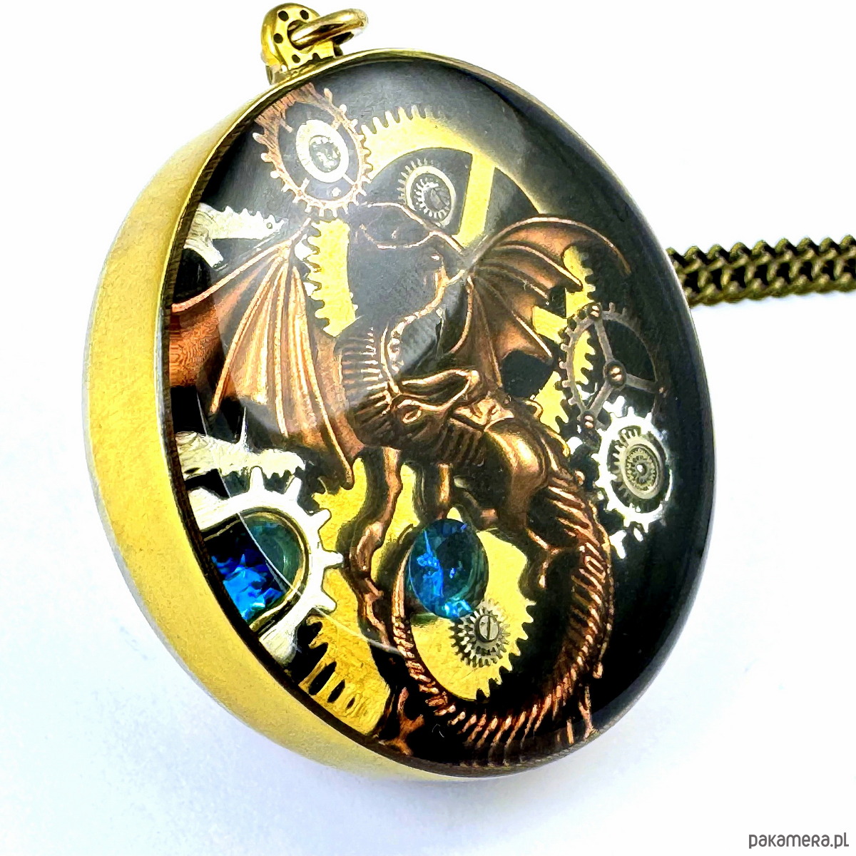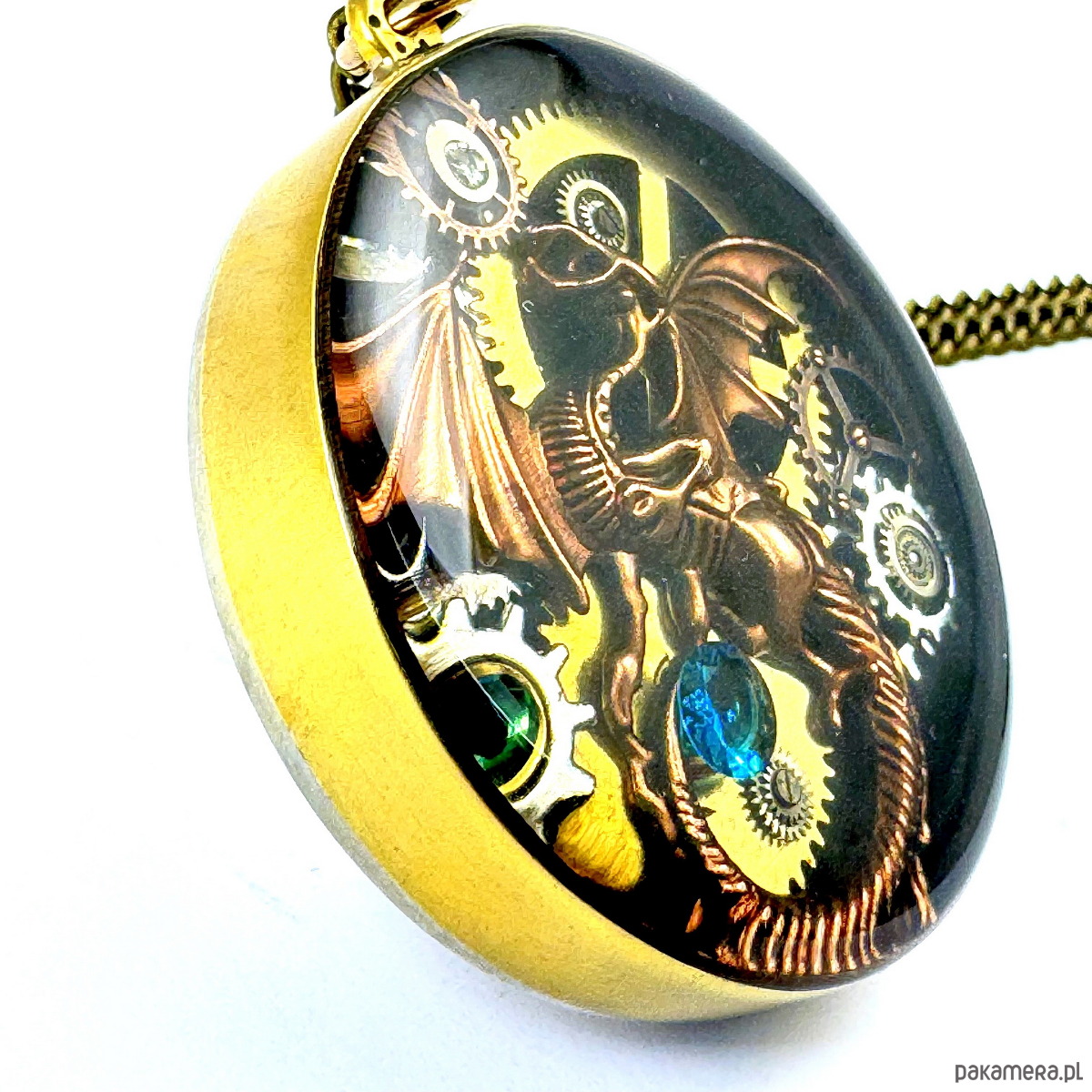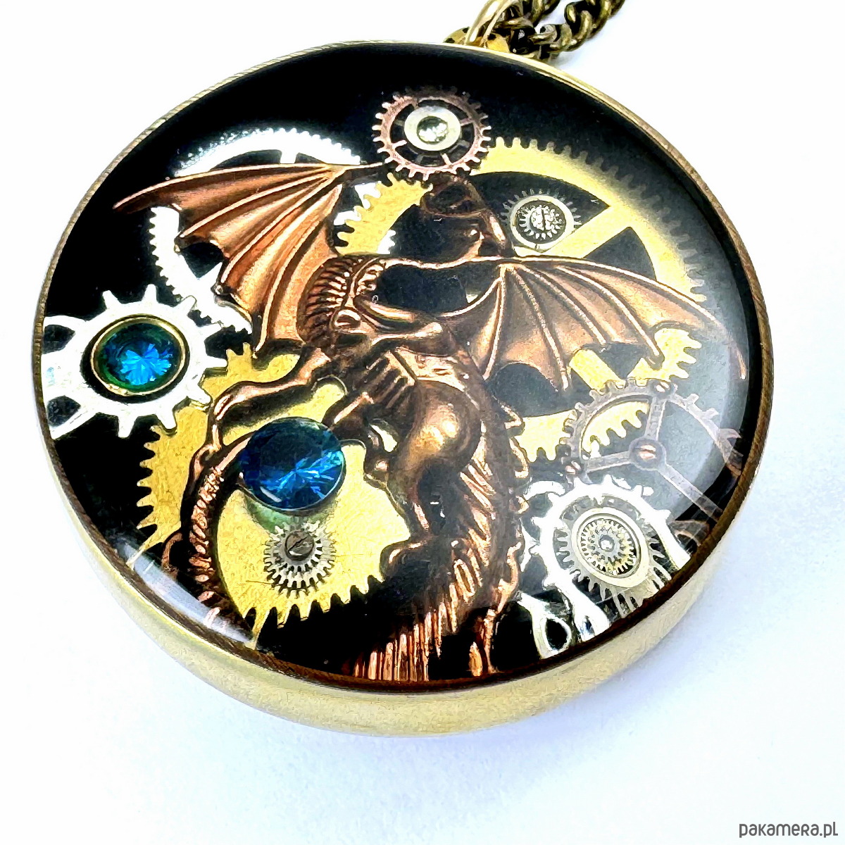 - Materiał: trybiki i elementy ze starego mechanizmu zegarka, smok w kolorze mosiężnym, kamienie naturalne