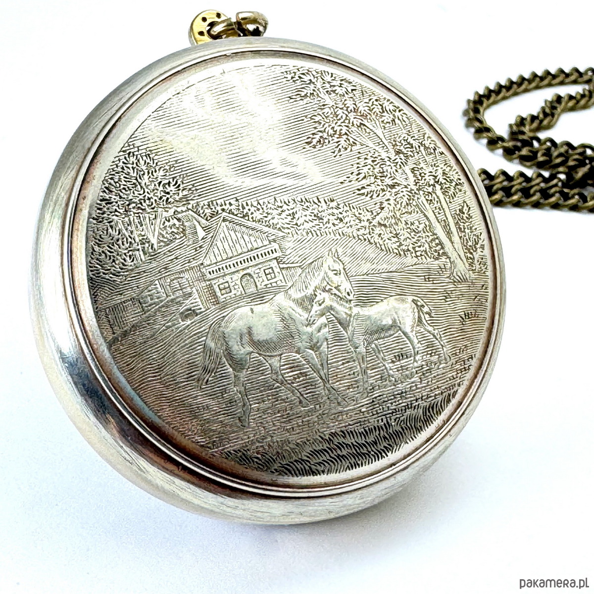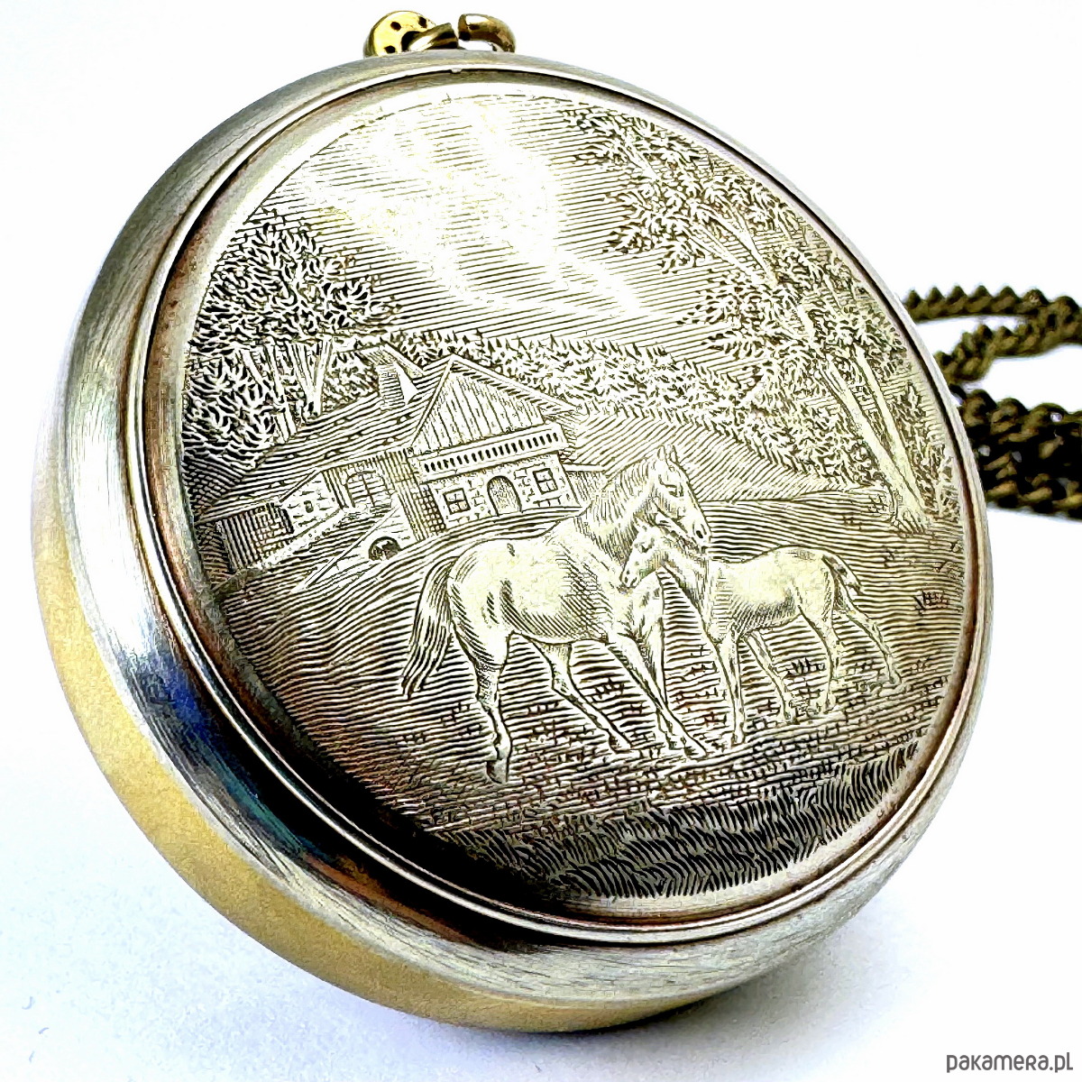 Wisiorek z serii upcyklingowej, mosiężna wykonana ręcznie wykuta obręcz. Wyjątkowy tył zegara prezentuje unikatową, starą kopertę zegarka srebrzoną z emblematem koników. Gratka dla osób ceniących klasykę piękna.
