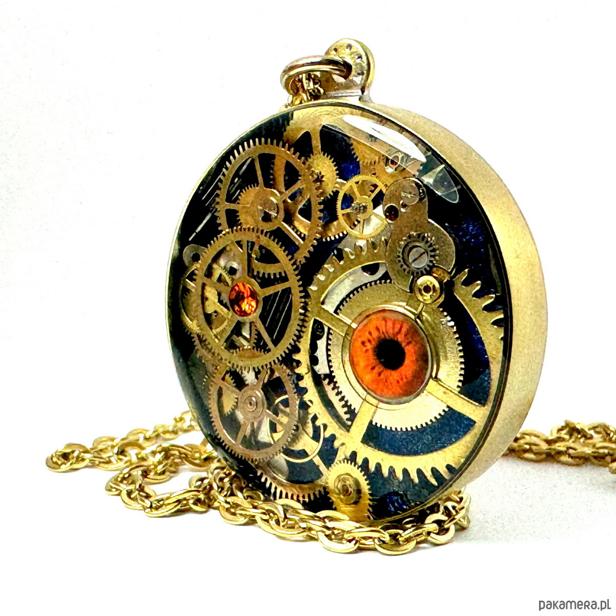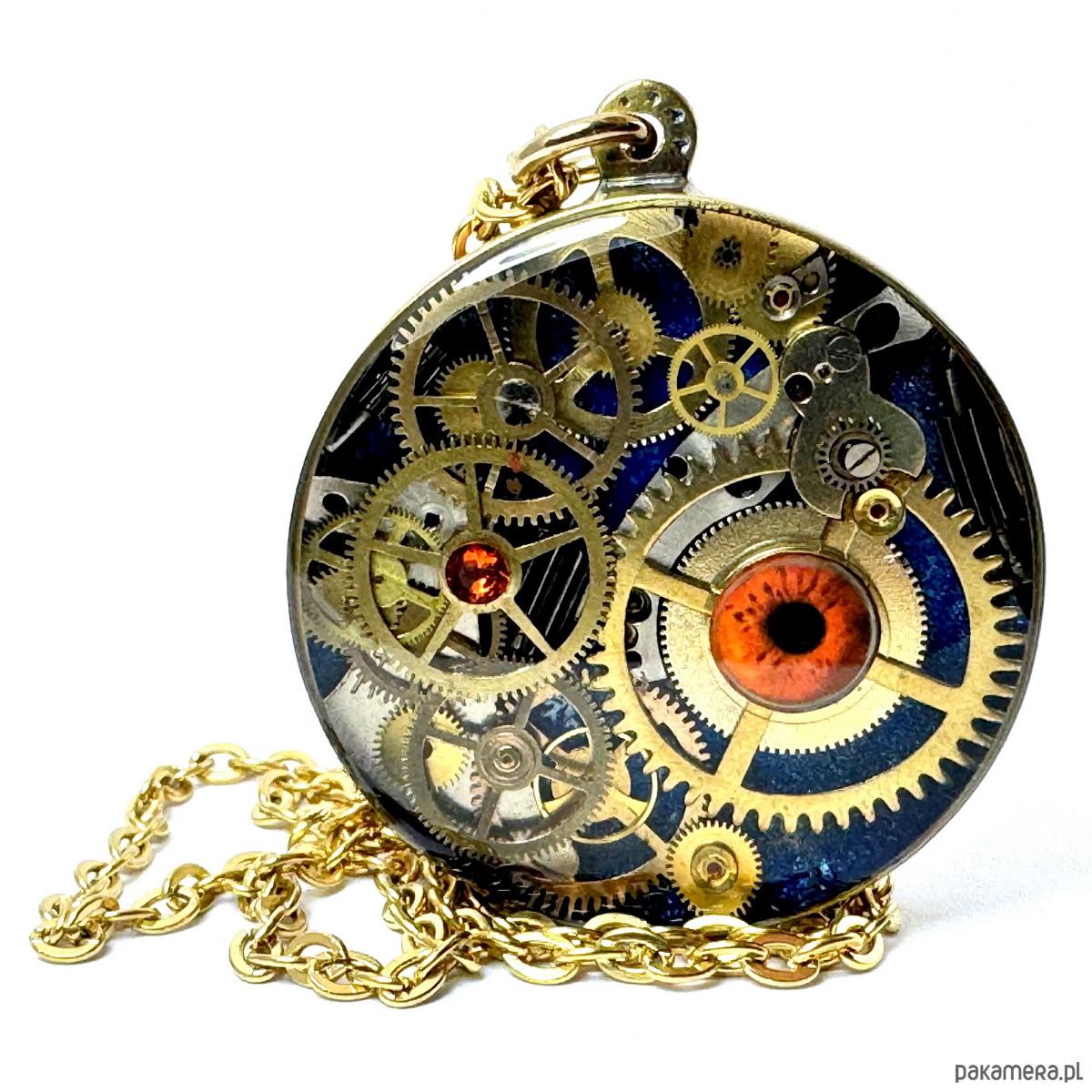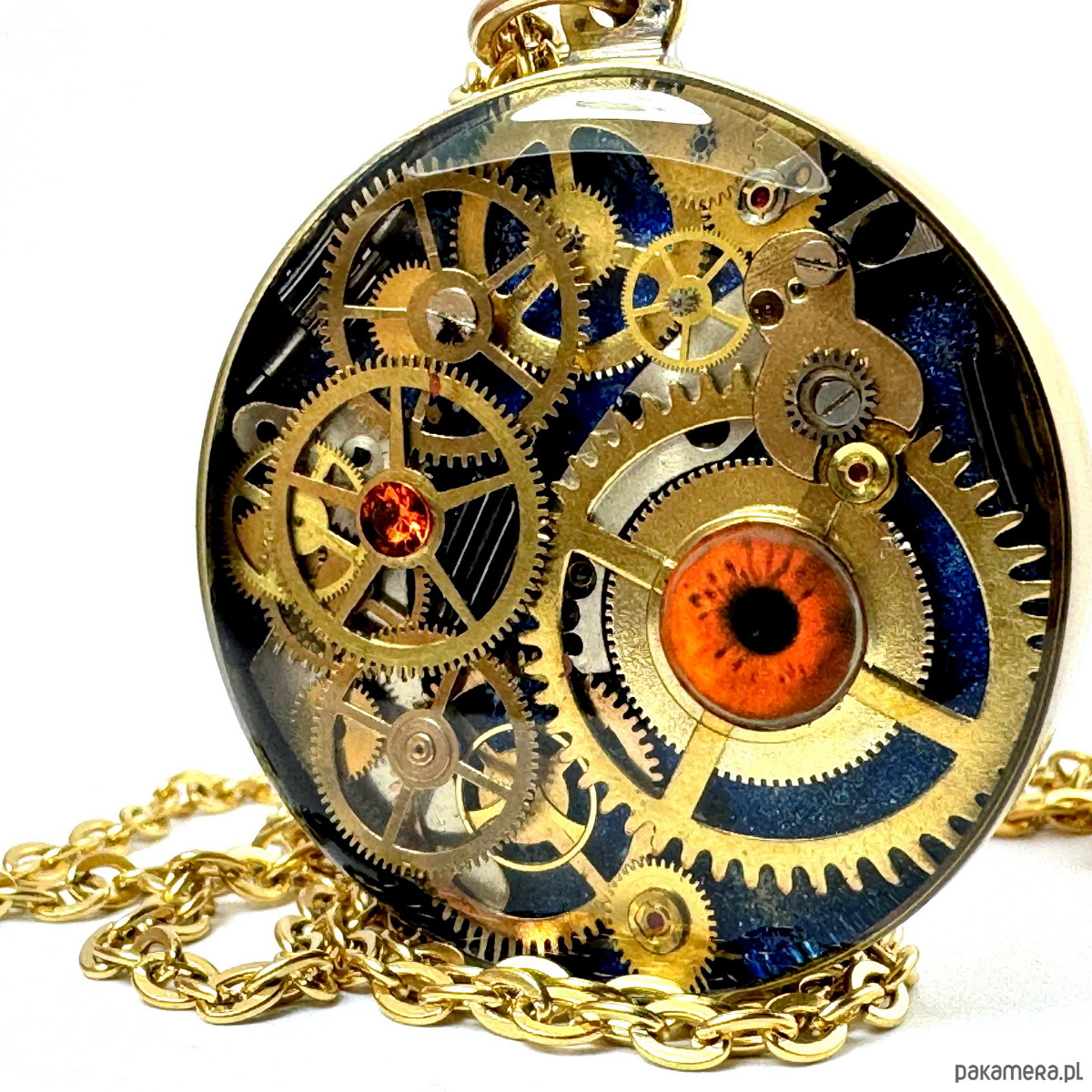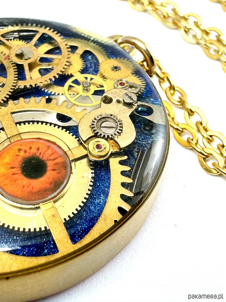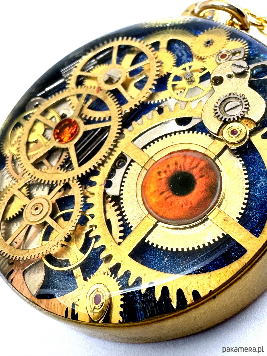 - Materiał: trybiki i elementy ze starego mechanizmu zegarka ułożone w trójwymiarową mozaikę. Całość zatopiona jest w ręcznie kutą obręcz, z czystego mosiądzu. Granatowe, głębokie tło i karmelowo-brązowe oko patrzące na wskroś Twych myśli.