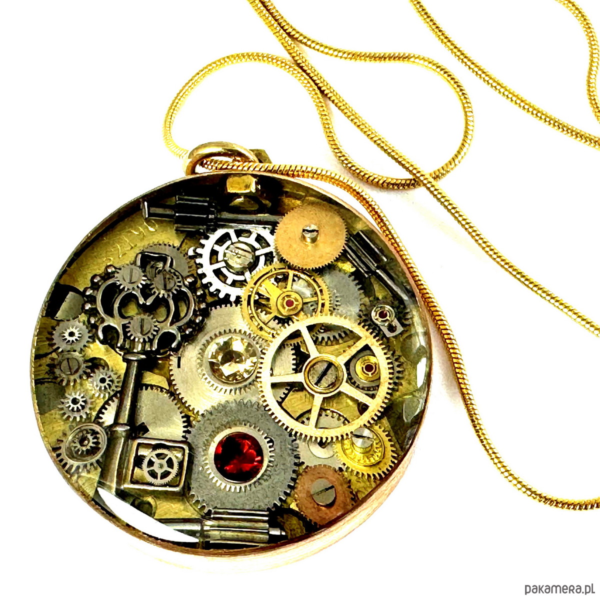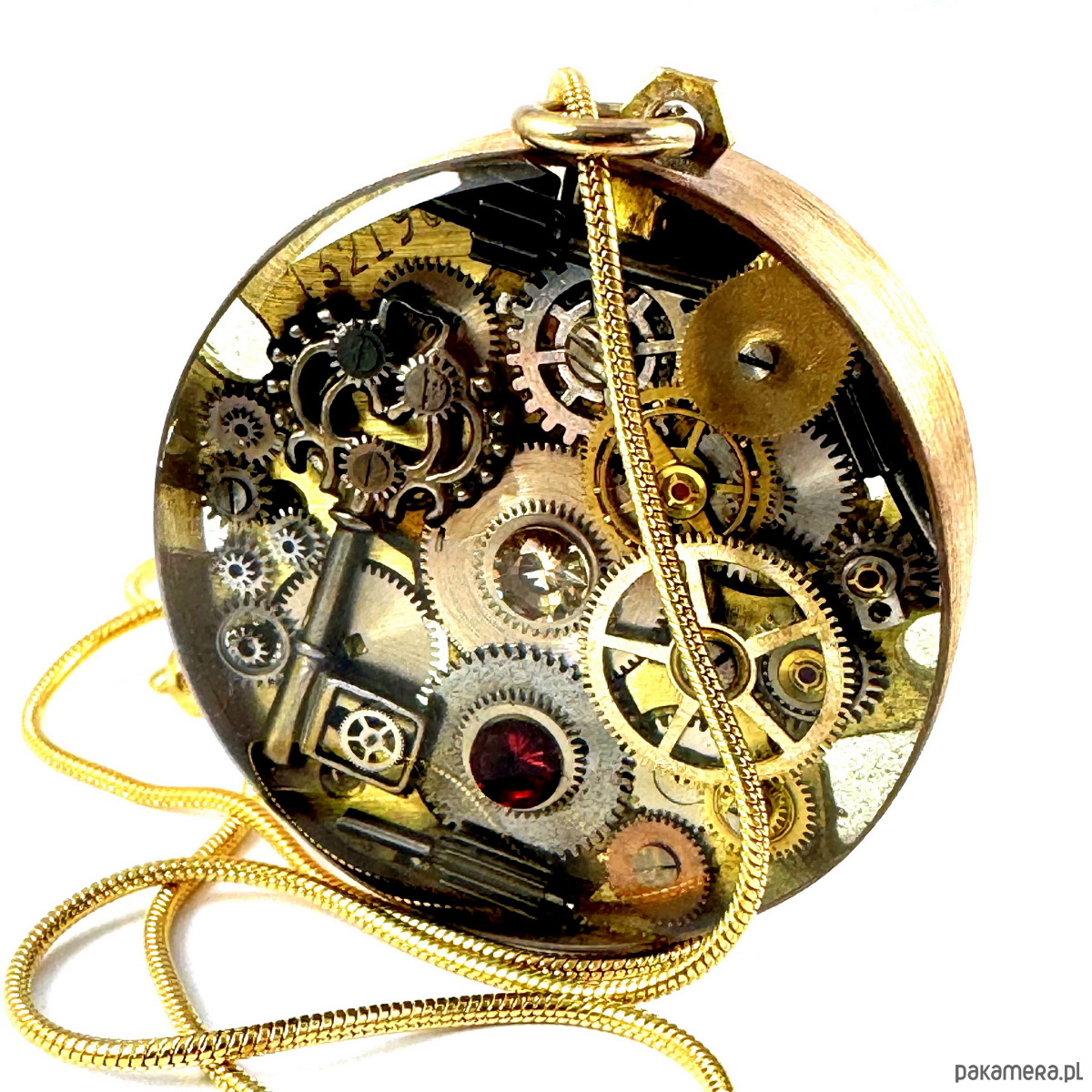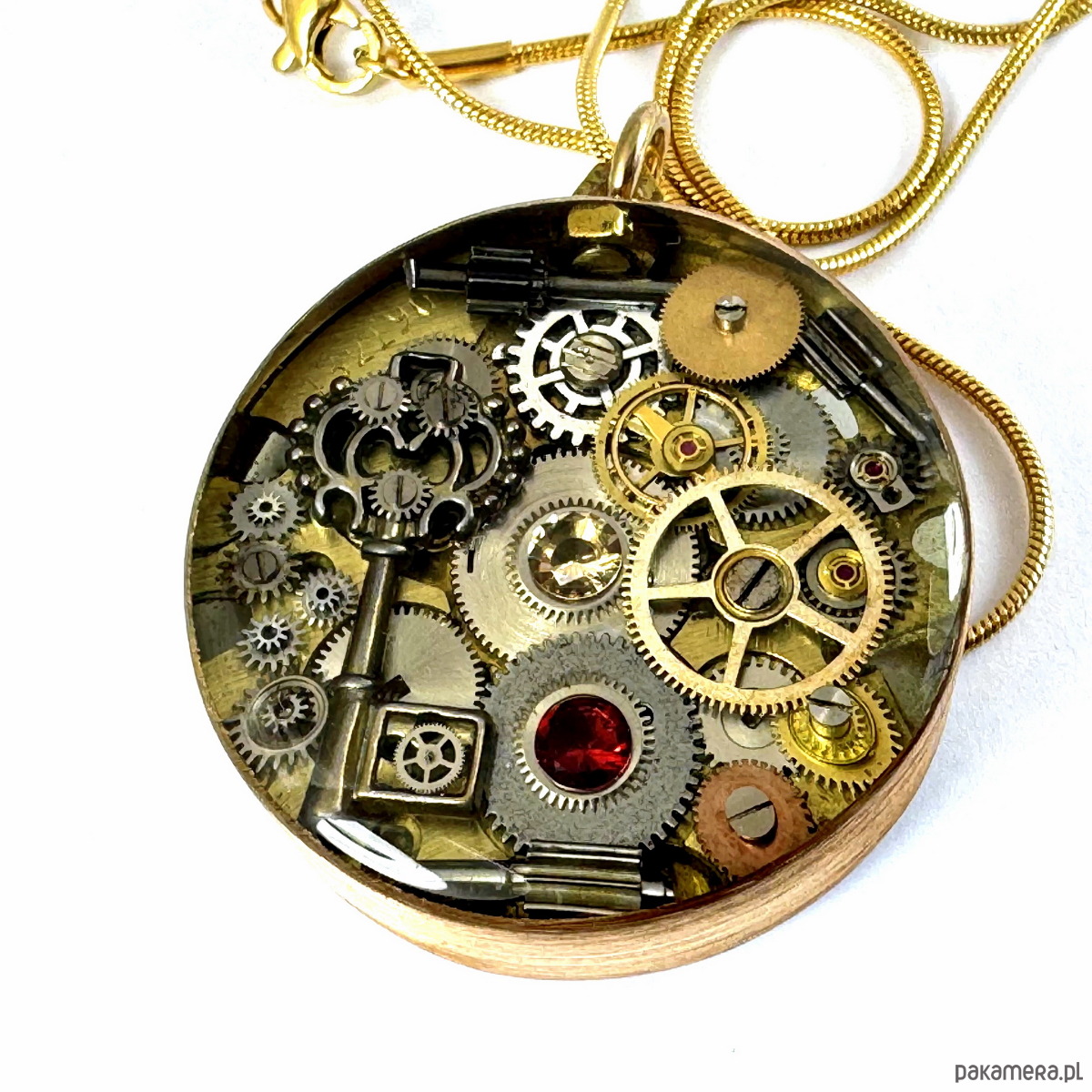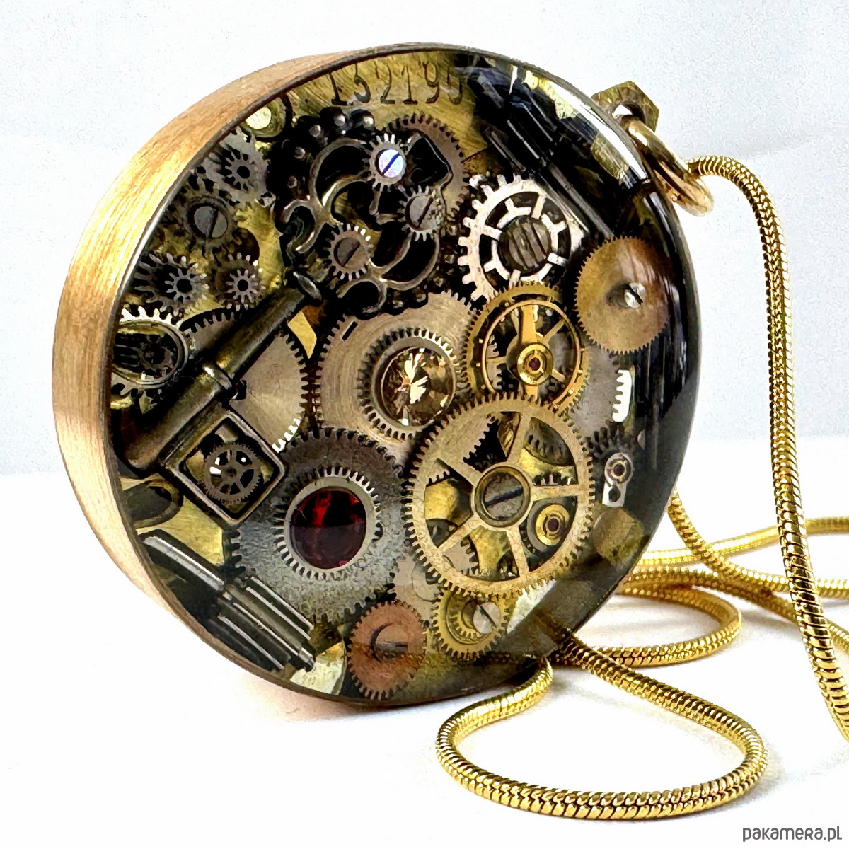 - Materiał: trybiki i elementy ze starego mechanizmu zegarka, przepiękny KLUCZ mieniący się trybikami, z cyrkoniami mieniącymi się to tu, to tam... Tło zegarka stanowi baza antycznego mechanizmu a na nim misternie ułożone są w trójwymiarową mozaikę trybiki zegarka. Całość zatopiona jest w ręcznie kutą obręcz z czystego mosiądzu. To dwa wisiory w jedynym (Tył równie ciekawy).