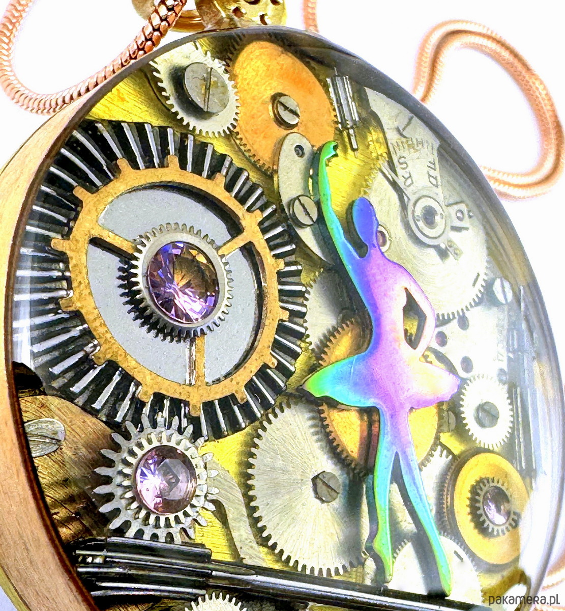 - Materiał: trybiki i elementy ze starego mechanizmu zegarka, delikatna tancerka w lekkiej pozie, miękko płynąca pomiędzy drobinami czasu...