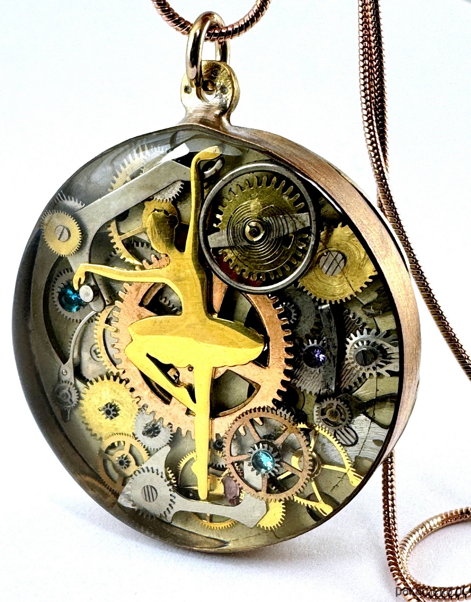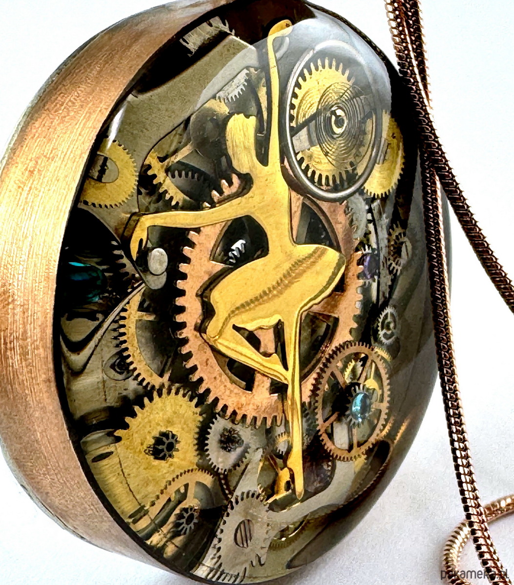 - Materiał: trybiki i elementy ze starego mechanizmu zegarka, delikatna tancerka w lekkiej pozie, miękko płynąca pomiędzy drobinami czasu...
