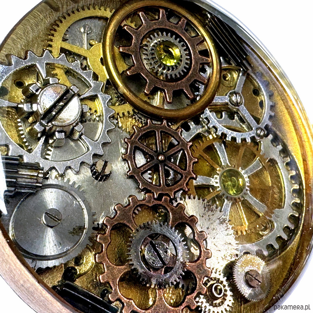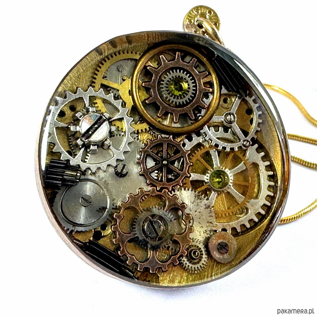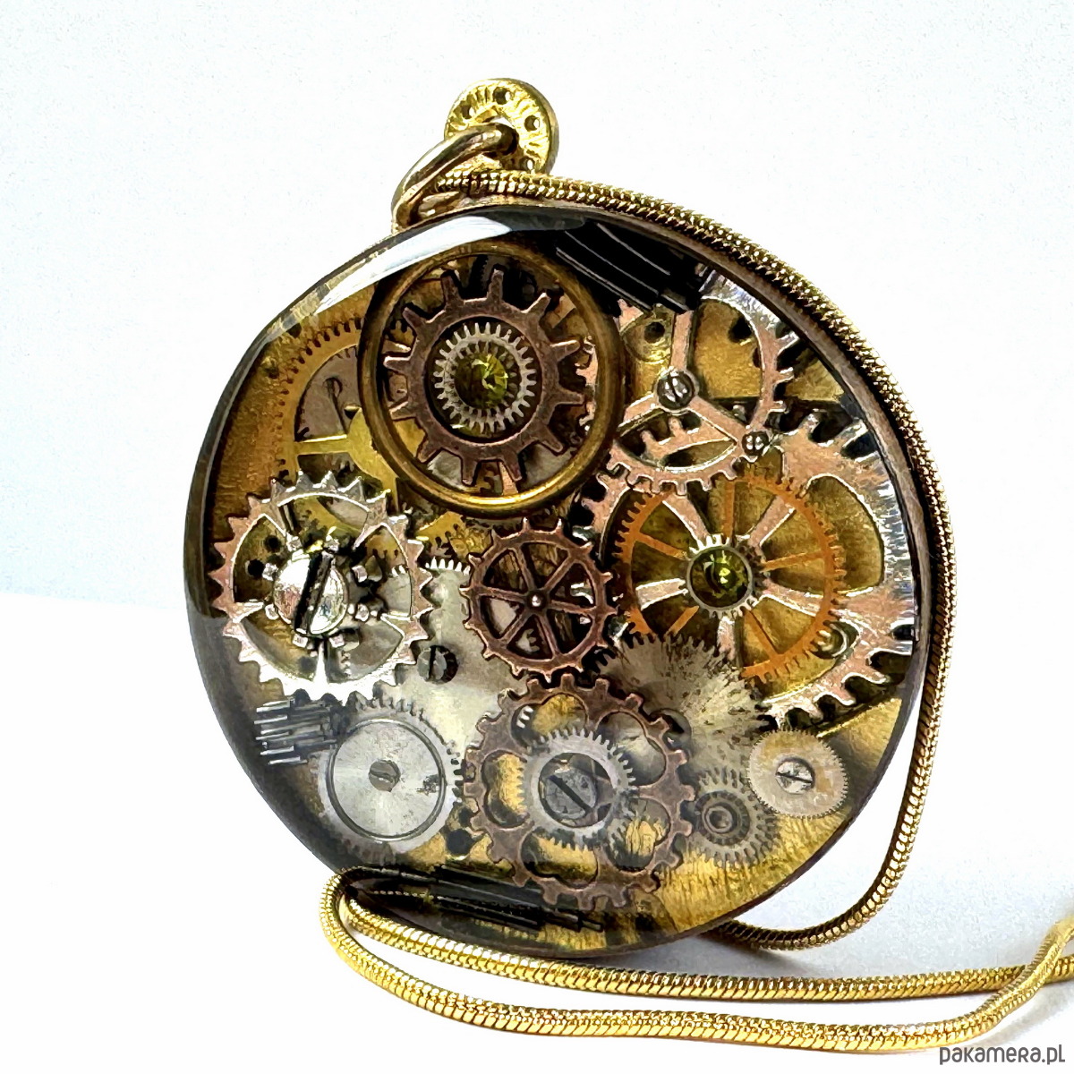 Materiał: trybiki i elementy ze starego mechanizmu zegarka, przepiękny KLUCZ mieniący się trybikami, z cyrkoniami mieniącymi się to tu, to tam... Tło zegarka stanowi baza antycznego mechanizmu a na nim misternie ułożone są w trójwymiarową mozaikę trybiki zegarka. Całość zatopiona jest w ręcznie kutą obręcz z czystego mosiądzu. To dwa wisiory w jedynym (Tył równie ciekawy).