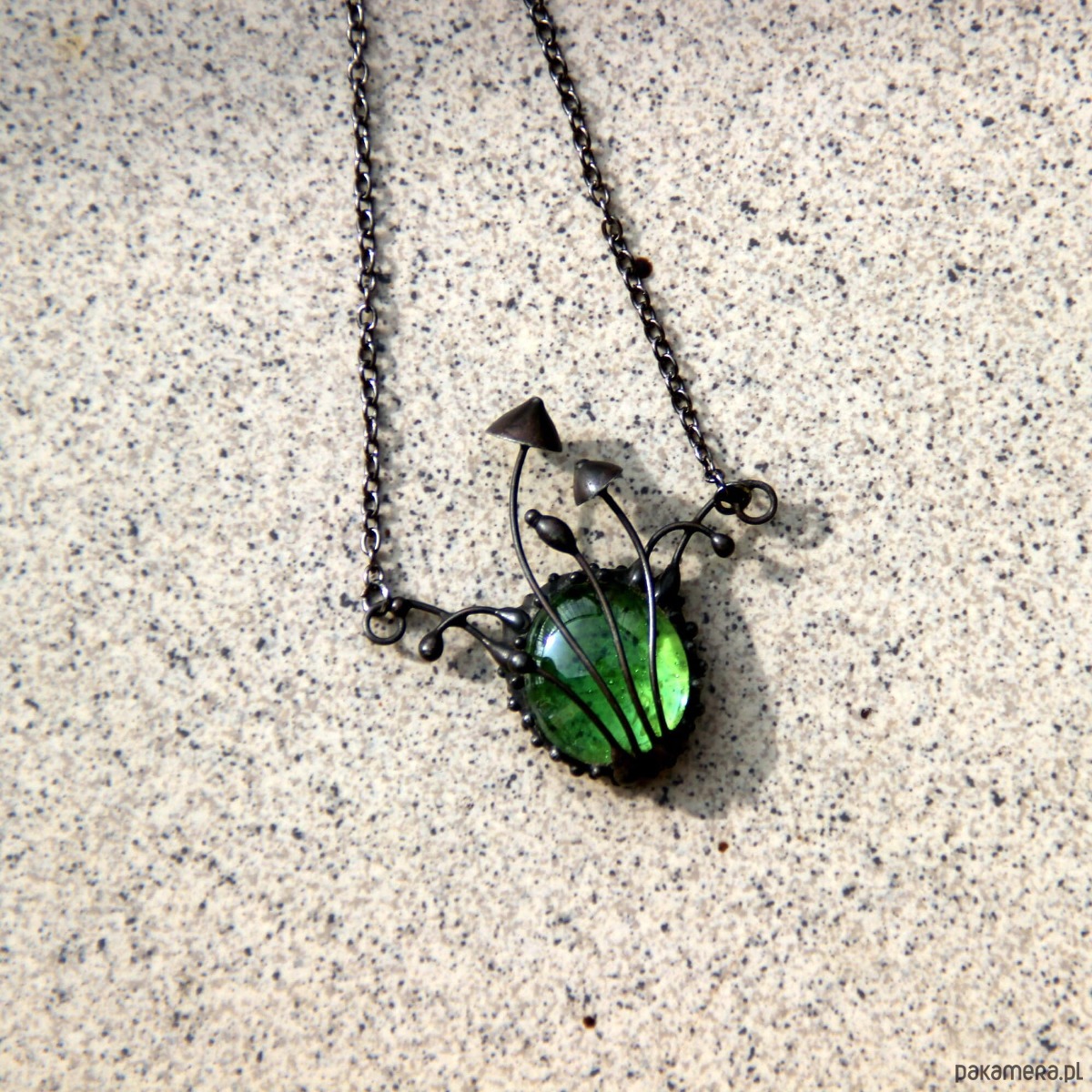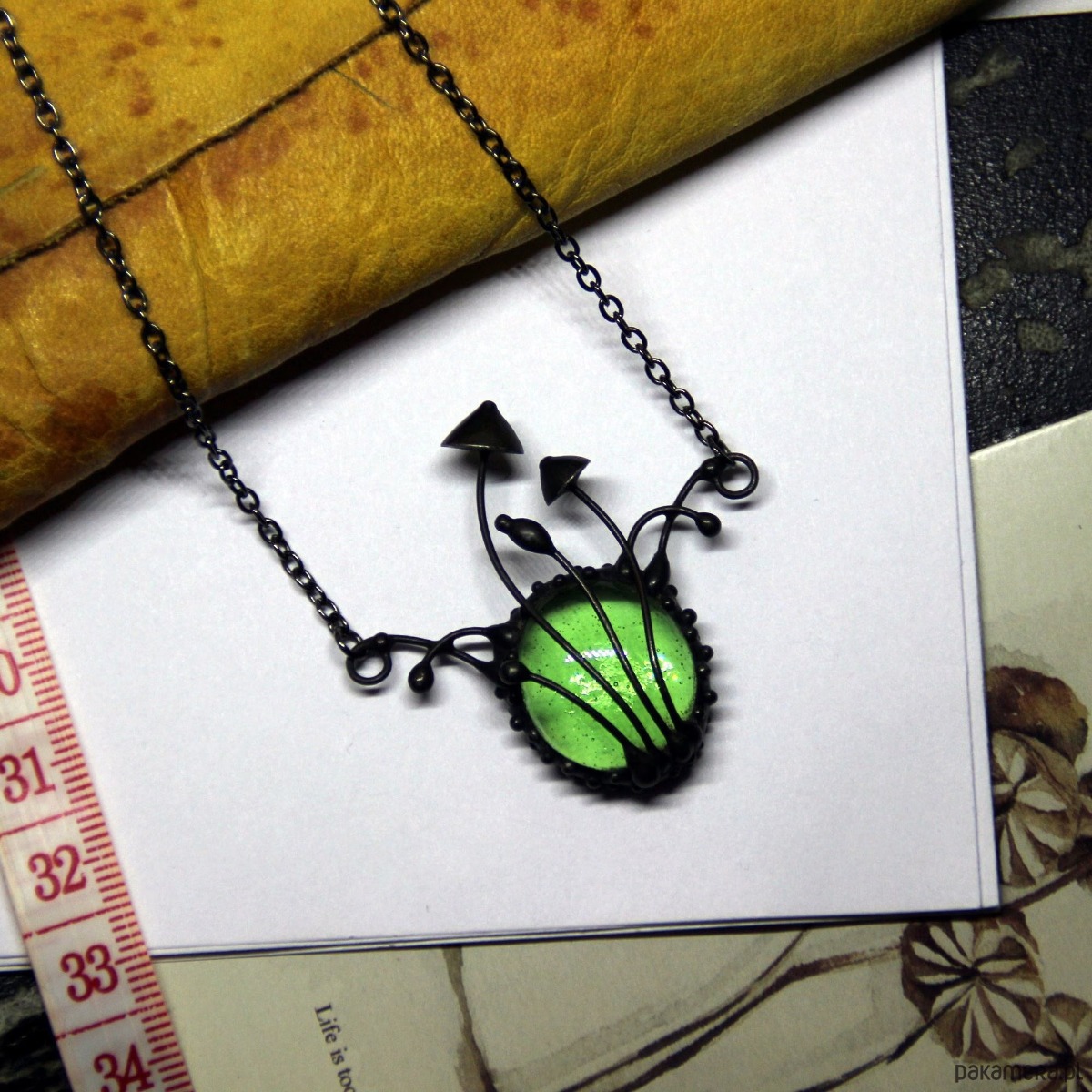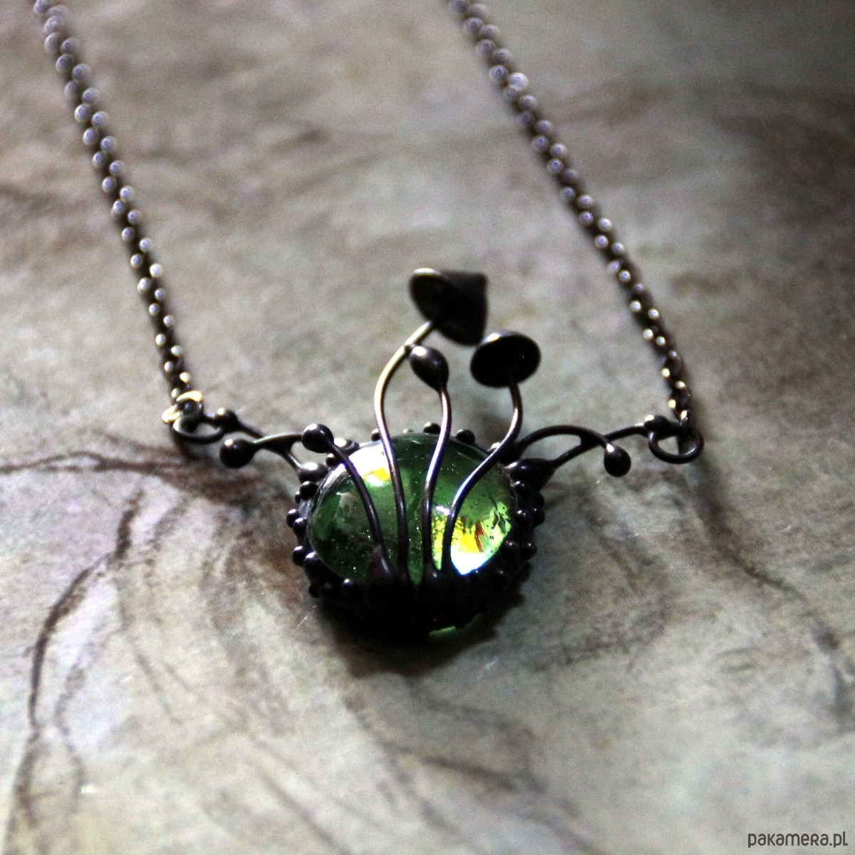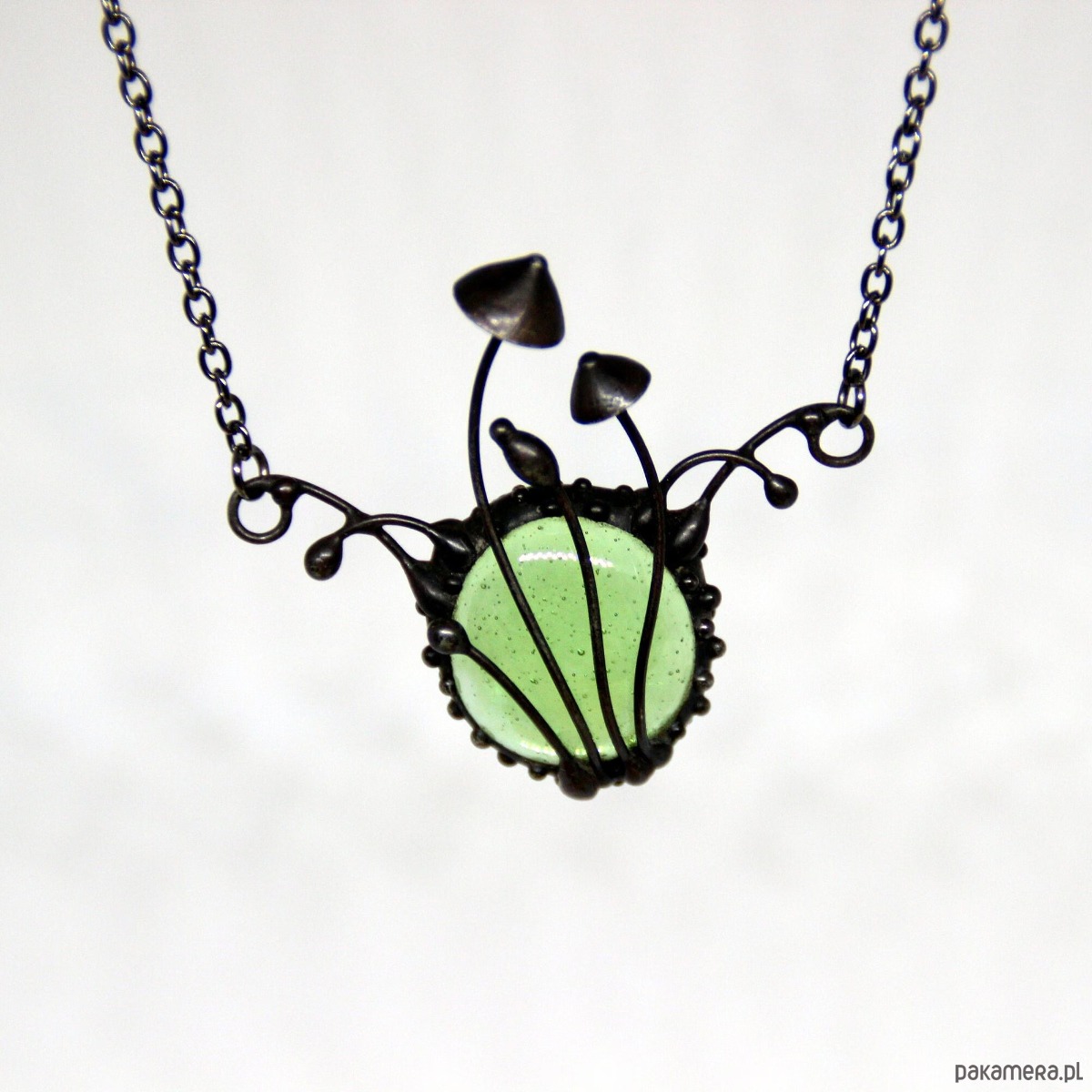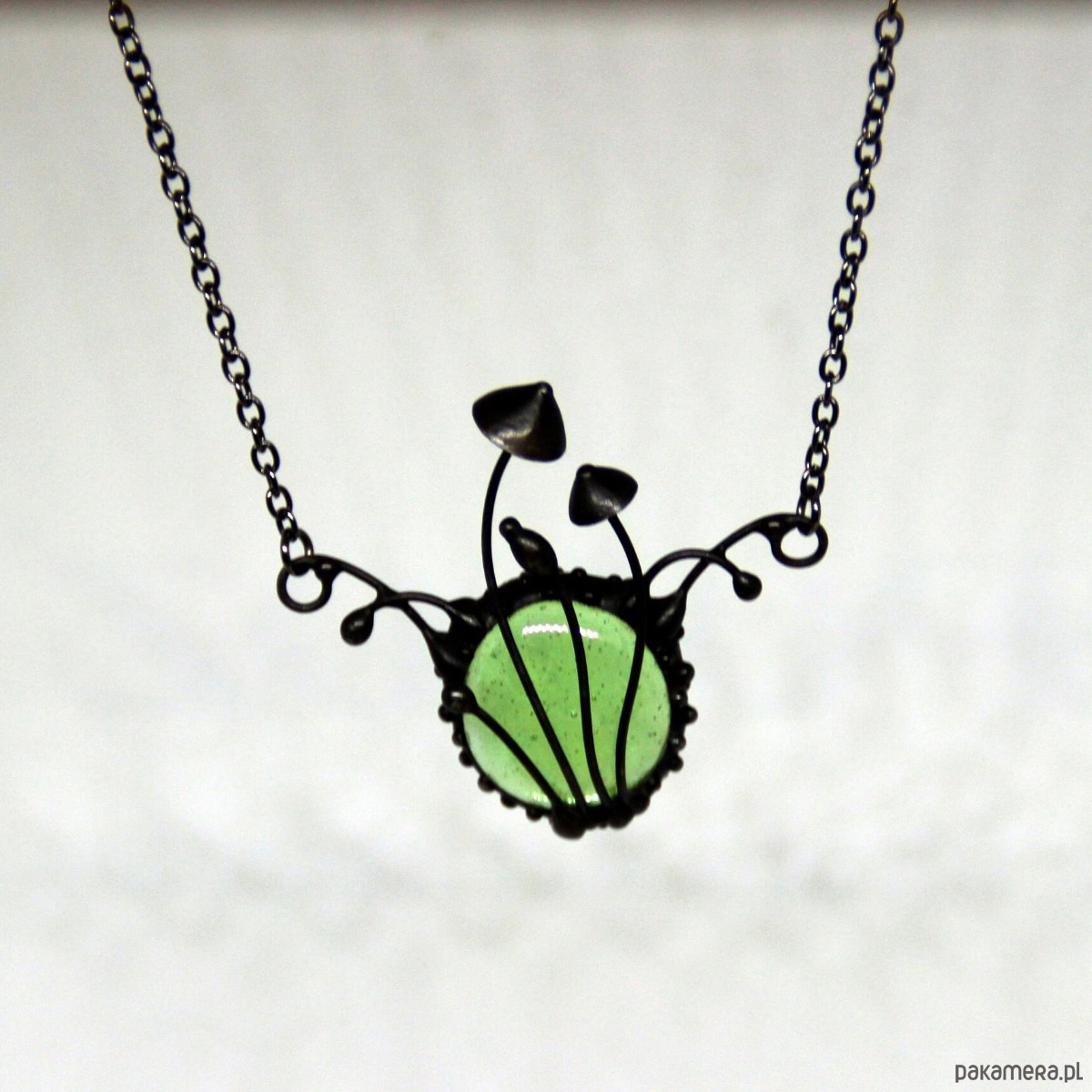 Wisiorek z motywem magicznych grzybów, wykonany ręcznie z miedzi, stali, cyny i zielonego szkła. Pokryty czarną patyną i zabezpieczony środkiem przeciwutleniającym. Naszyjnik jest lekki i niezwykły. Pomimo tego jest solidny. Wszystkie elementy są wykonane ręcznie, co zapewnia indywidualność każdego produktu wytworzonego w warsztacie Yadovito. Stop cyny i miedzi jest polerowany roztworem wykończeniowym, aby nadać biżuterii szlachetny wygląd, a jednocześnie zapobiec utlenianiu się metalu. Niezwykła i solidna biżuteria w stylu czarowniczym, o estetycznym wyglądzie. Rozmiar około 4,5/3,5 cm. Kolor czarny/zielony.