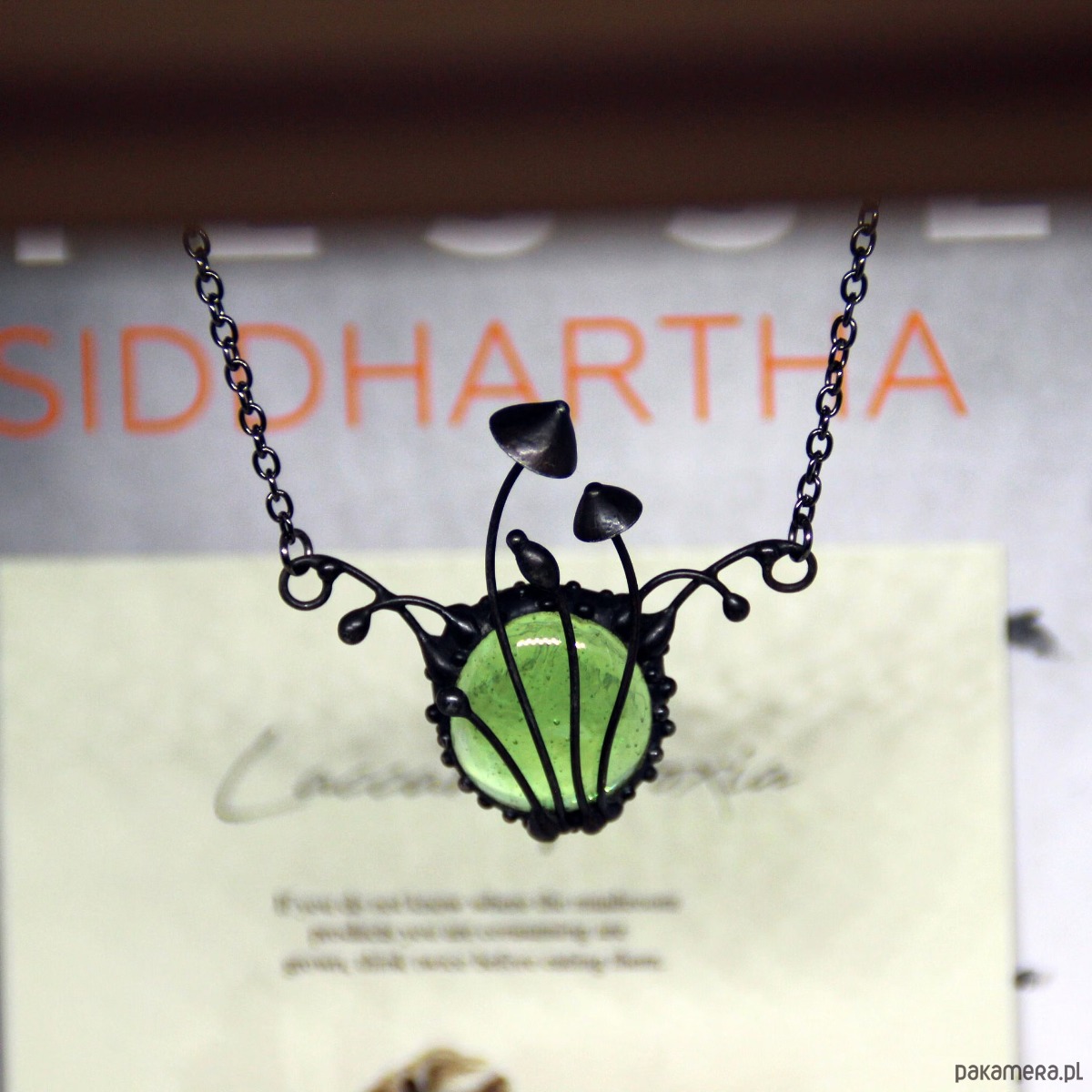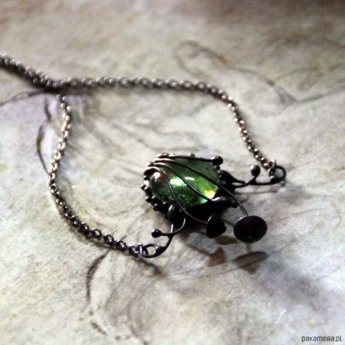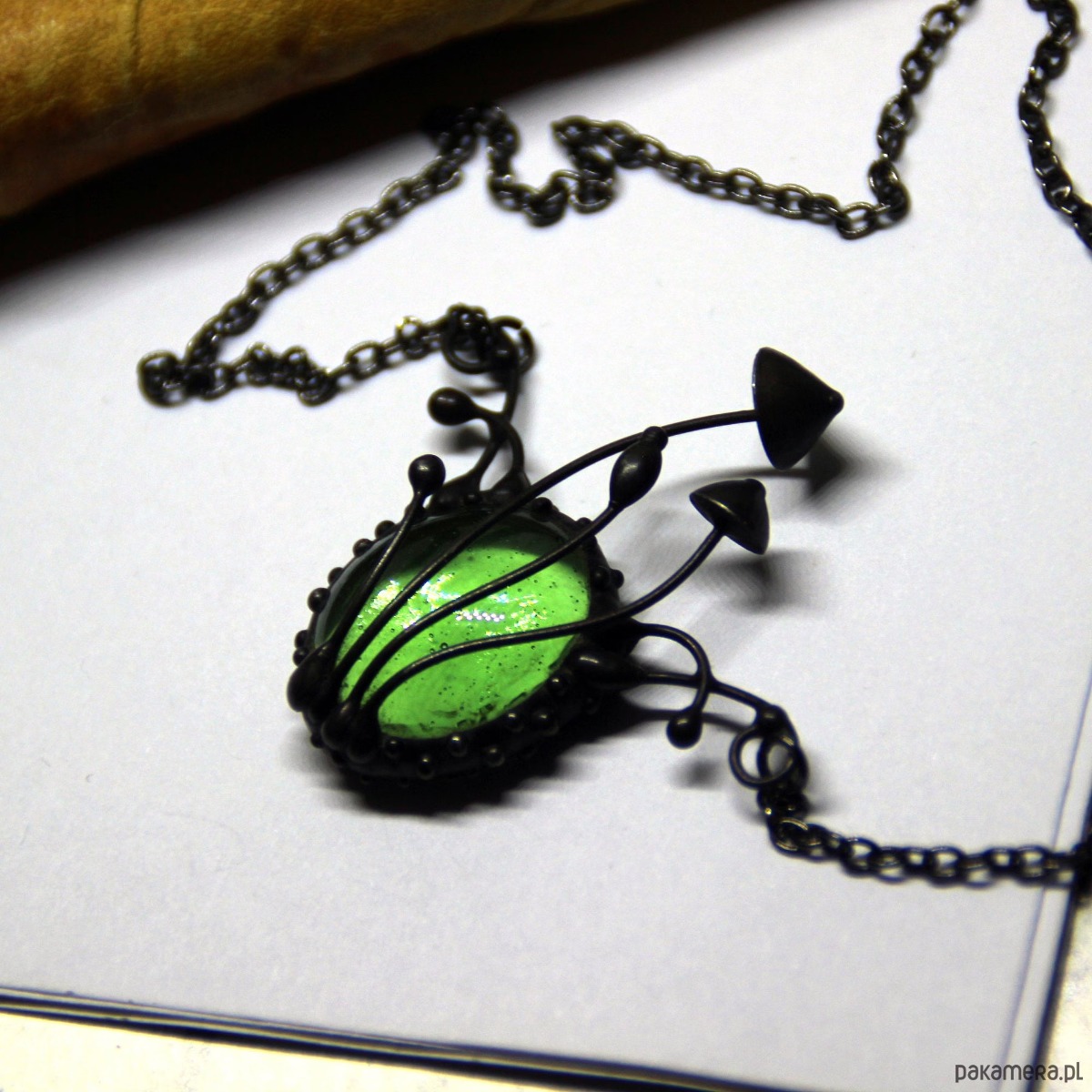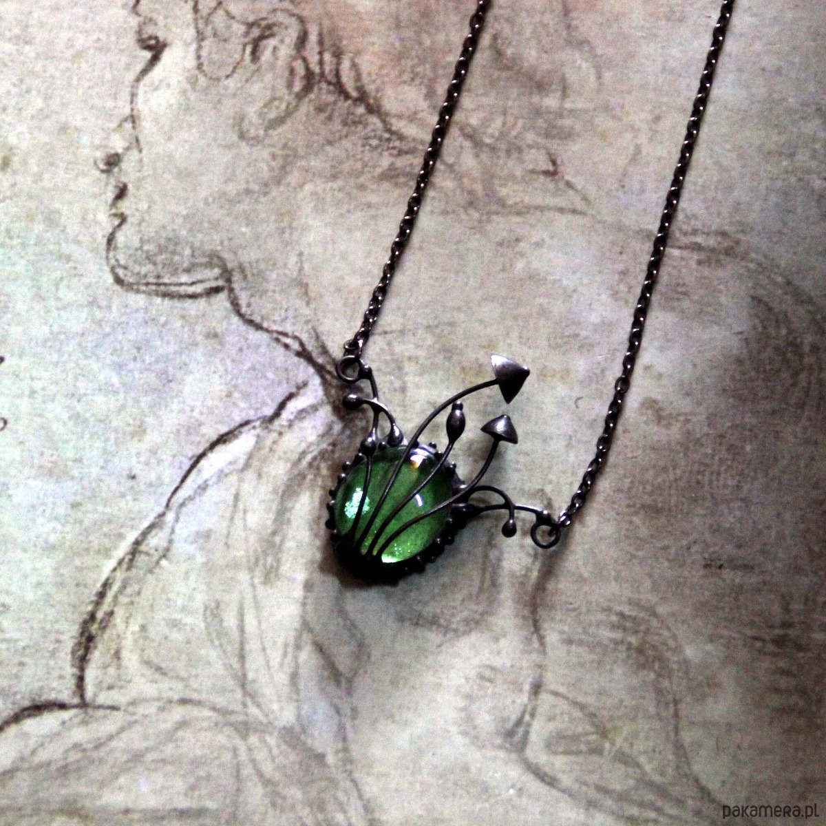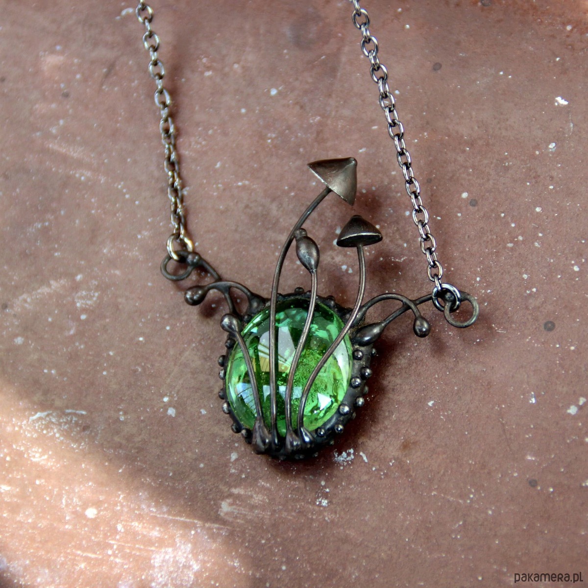 Wisior leśny z magicznymi grzybami z zielonym szkłem w stylu czarownicy