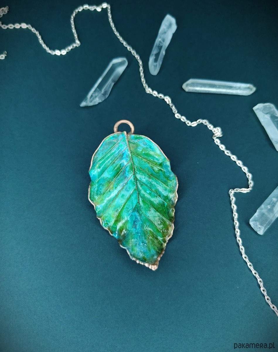 Miedziany Wisiorek Liść Buka z Zieloną Patyną- talizman mądrości, odwagi i nowych początków