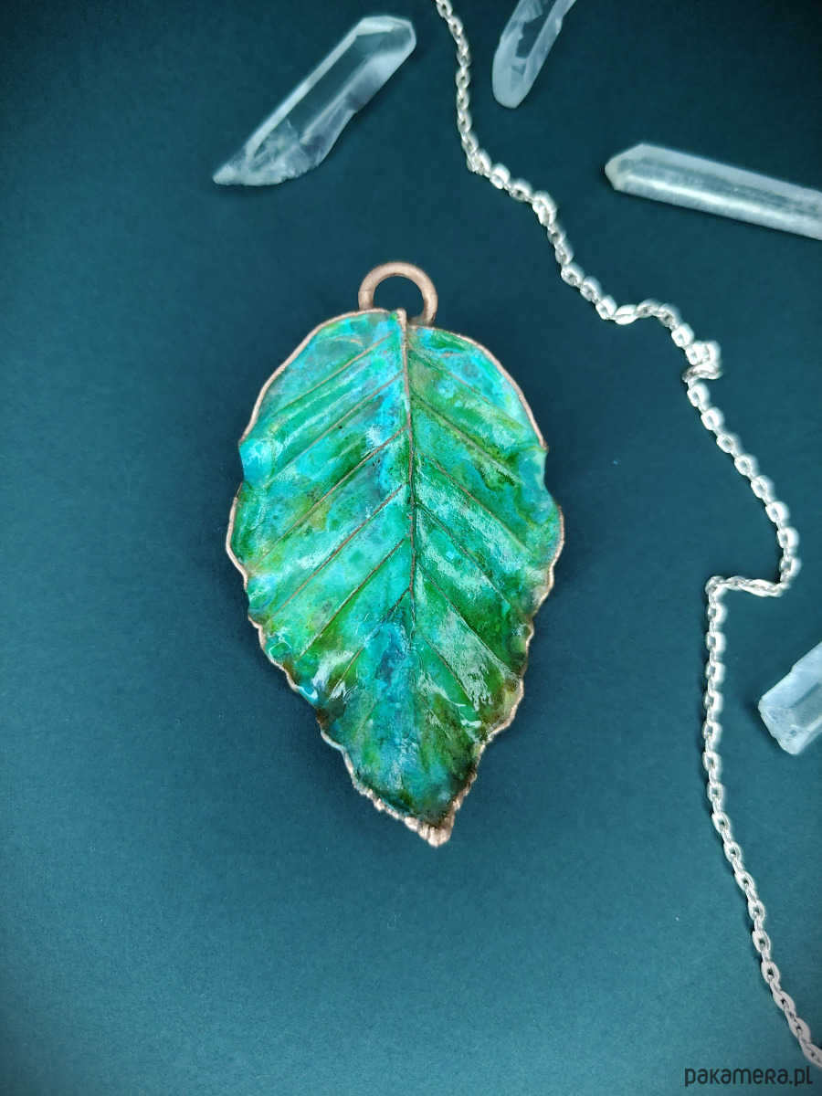Ten prawdziwy liść buka został utrwalony w miedzi, a następnie ozdobiony zieloną patyną, która podkreśla jego leśny charakter. Zieleń to kolor wzrostu, harmonii i świeżego początku.