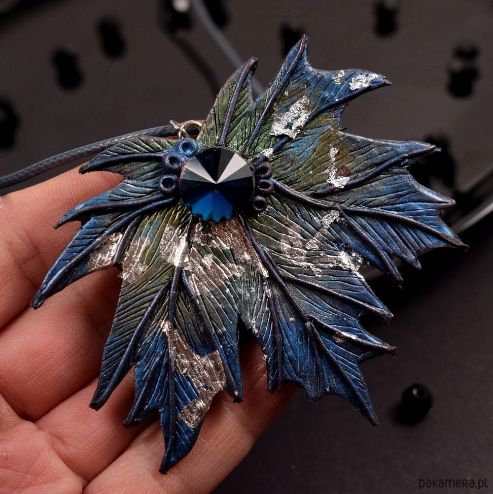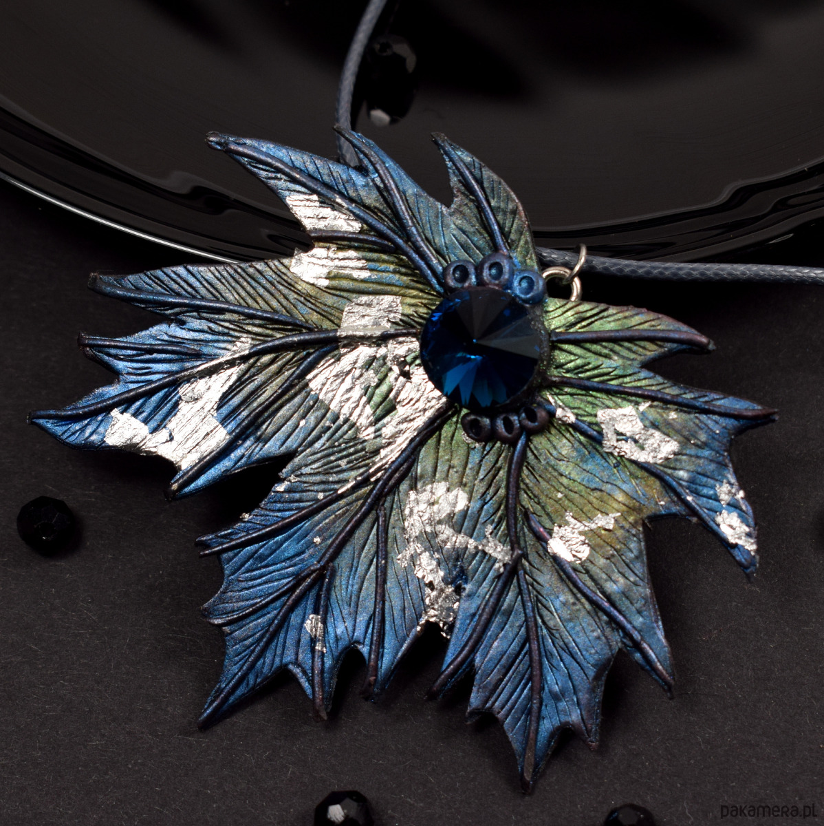 Wisior w formie liścia klonu, utrzymany w odcieniach srebrzystego błękitu i zieleni.