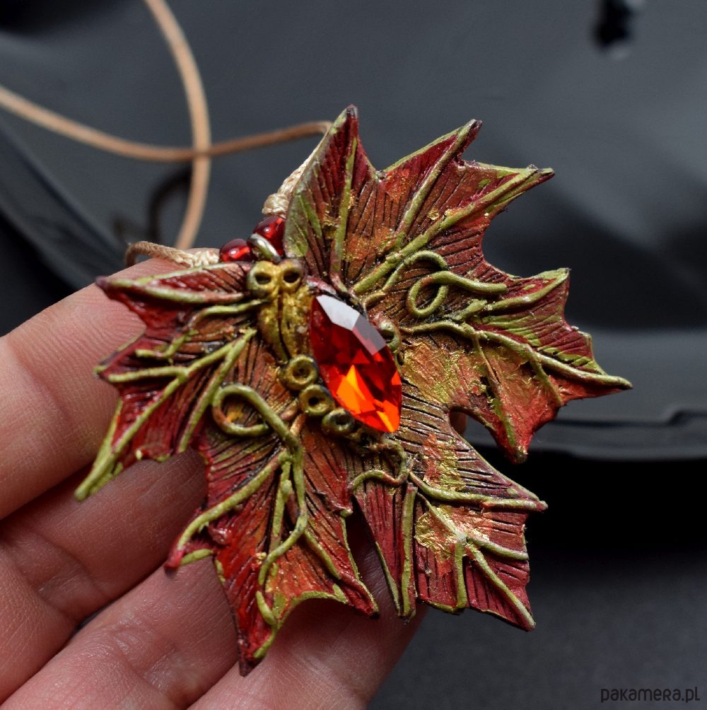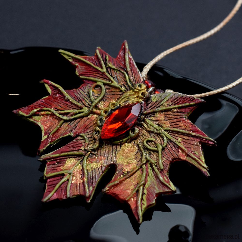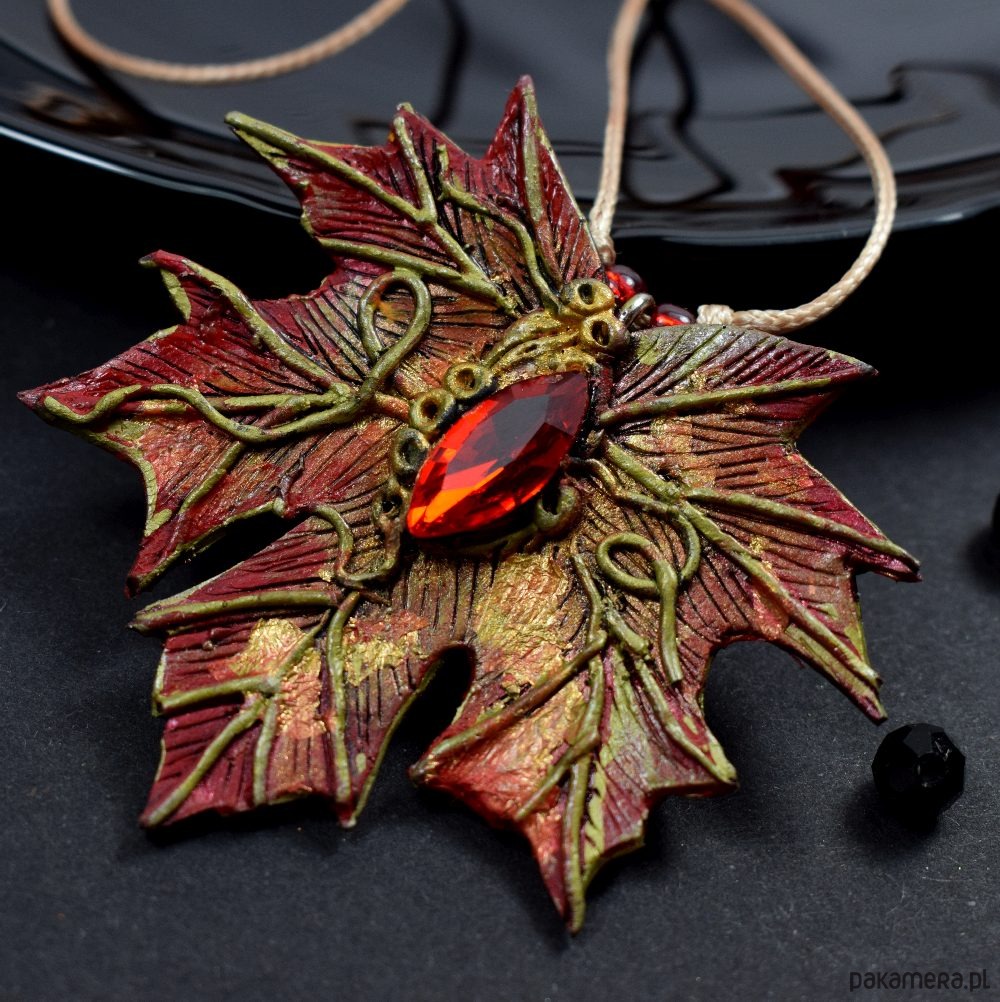 Wyjątkowy wisior w formie liścia klonu, utrzymany w odcieniach czerwieni, bordo i złota.
