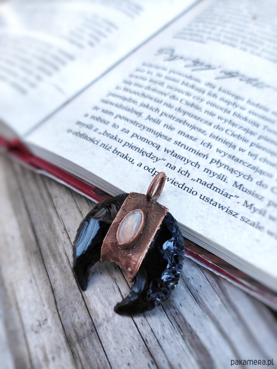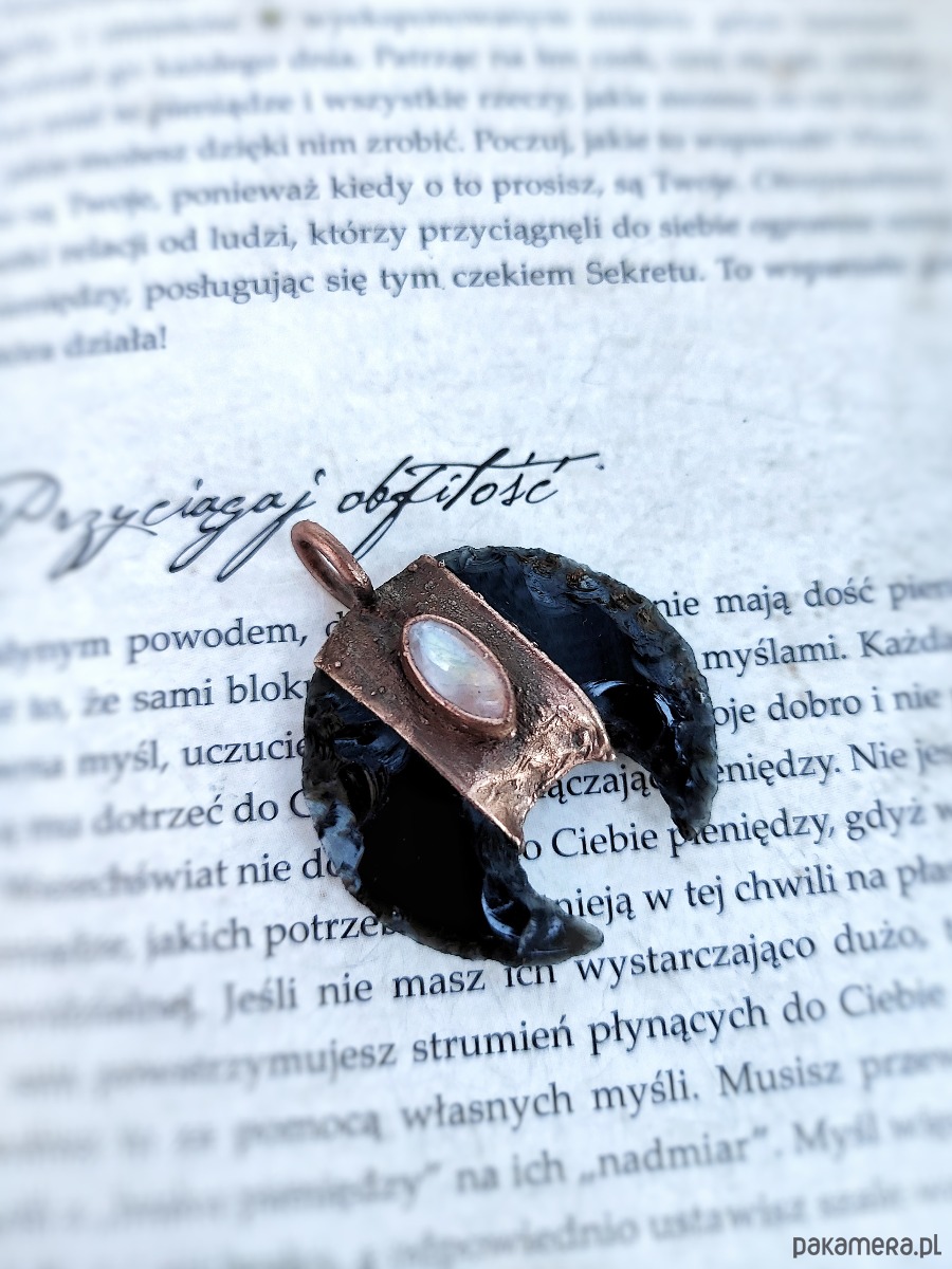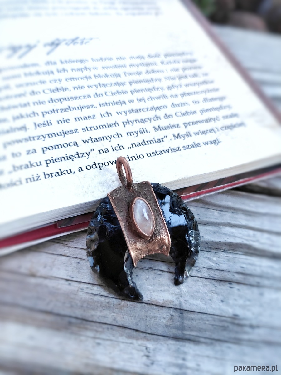 Odkryj niezwykłą harmonię natury i rzemiosła w wyjątkowym wisiorze, który zachwyca swoim symbolicznym kształtem i niepowtarzalnym pięknem. Ten unikalny wisiorek został wykonany z surowego obsydianu czarnego, ociosanego na kształt lunuli – starożytnego symbolu kobiecości, płodności i cykliczności życia. Centralnym punktem tego dzieła jest migoczący kamień księżycowy, osadzony w miedzianej oprawie, dodającej całości ciepła i szlachetności.