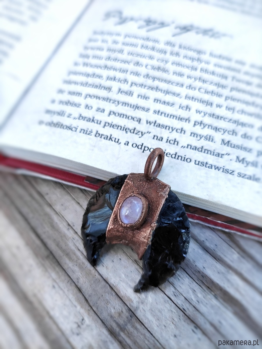 Wisior miedziany lunula obsydian moonstone IV