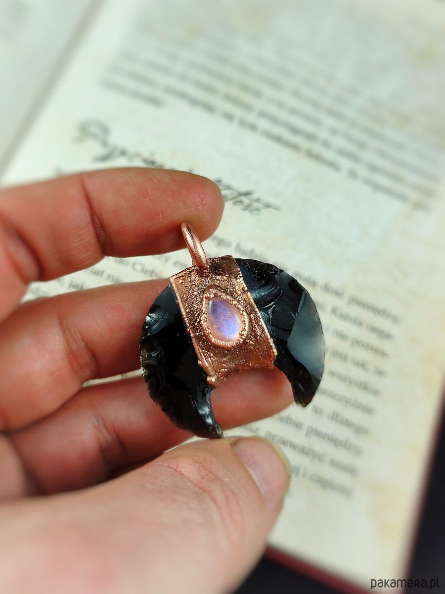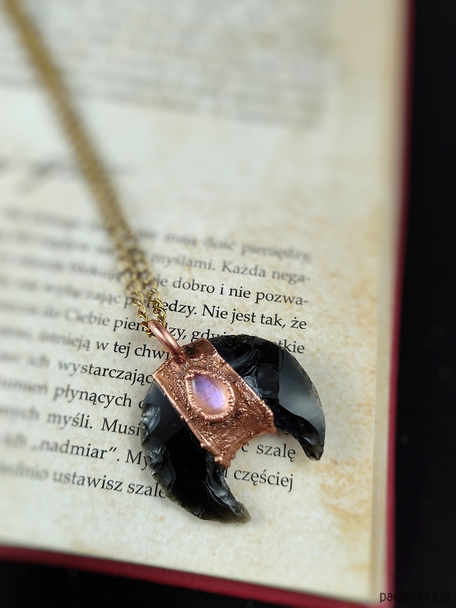 Odkryj niezwykłą harmonię natury i rzemiosła w wyjątkowym wisiorze, który zachwyca swoim symbolicznym kształtem i niepowtarzalnym pięknem. Ten unikalny wisiorek został wykonany z surowego obsydianu czarnego, ociosanego na kształt lunuli – starożytnego symbolu kobiecości, płodności i cykliczności życia. Centralnym punktem tego dzieła jest migoczący kamień księżycowy, osadzony w miedzianej oprawie, dodającej całości ciepła i szlachetności.