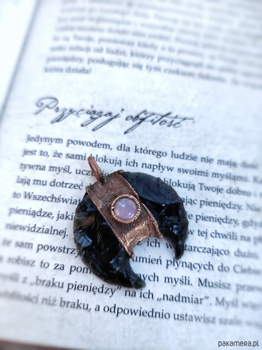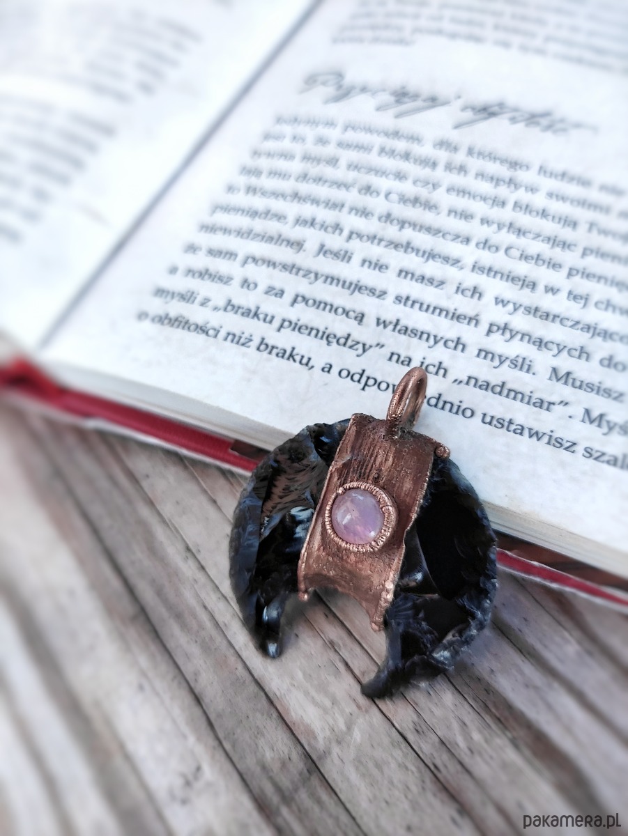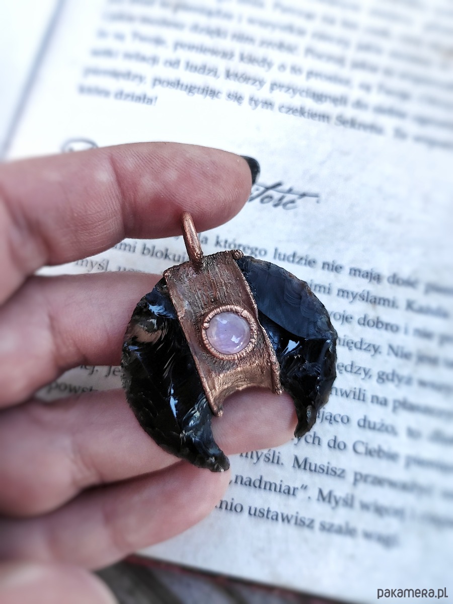 Miedź, uformowana za pomocą elektroformowania, otula kamienie niczym płaszcz ochronny. Uważa się, że ma ona zdolność wspierania przepływu energii i wzmacniania połączenia z naturą. Jej ciepły, miedziany blask idealnie współgra z głęboką czernią obsydianu i subtelnymi refleksami księżycowego kamienia.