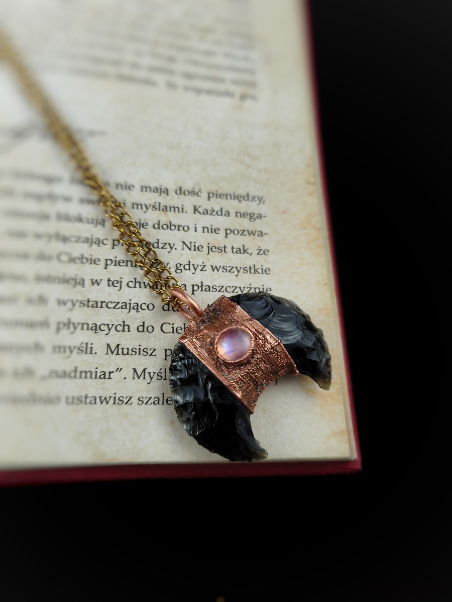 Miedź, uformowana za pomocą elektroformowania, otula kamienie niczym płaszcz ochronny. Uważa się, że ma ona zdolność wspierania przepływu energii i wzmacniania połączenia z naturą. Jej ciepły, miedziany blask idealnie współgra z głęboką czernią obsydianu i subtelnymi refleksami księżycowego kamienia.