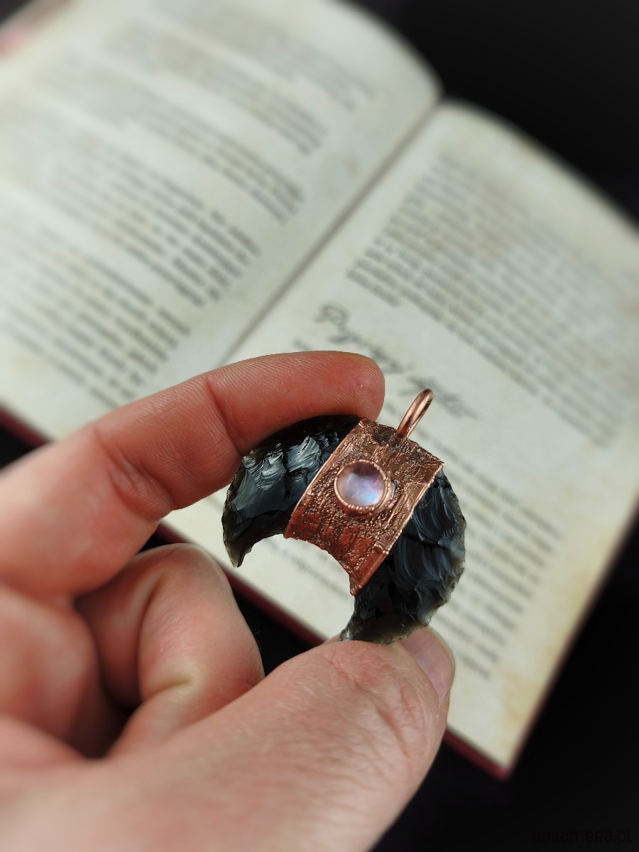 Odkryj niezwykłą harmonię natury i rzemiosła w wyjątkowym wisiorze, który zachwyca swoim symbolicznym kształtem i niepowtarzalnym pięknem. Ten unikalny wisiorek został wykonany z surowego obsydianu czarnego, ociosanego na kształt lunuli – starożytnego symbolu kobiecości, płodności i cykliczności życia. Centralnym punktem tego dzieła jest migoczący kamień księżycowy, osadzony w miedzianej oprawie, dodającej całości ciepła i szlachetności.