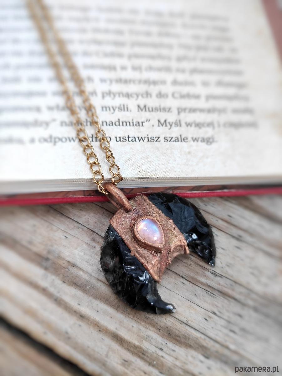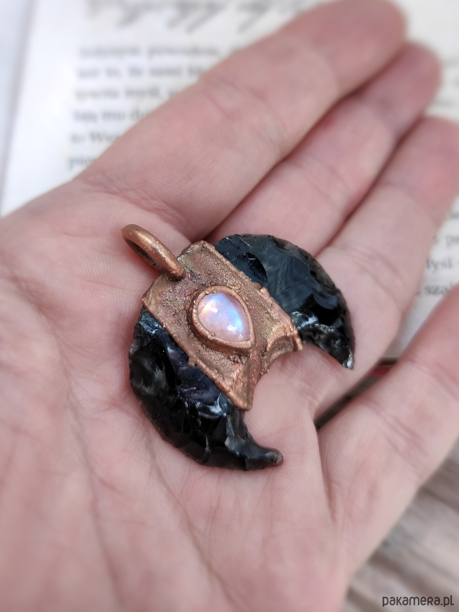Odkryj niezwykłą harmonię natury i rzemiosła w wyjątkowym wisiorze, który zachwyca swoim symbolicznym kształtem i niepowtarzalnym pięknem. Ten unikalny wisiorek został wykonany z surowego obsydianu czarnego, ociosanego na kształt lunuli – starożytnego symbolu kobiecości, płodności i cykliczności życia. Centralnym punktem tego dzieła jest migoczący kamień księżycowy, osadzony w miedzianej oprawie, dodającej całości ciepła i szlachetności.