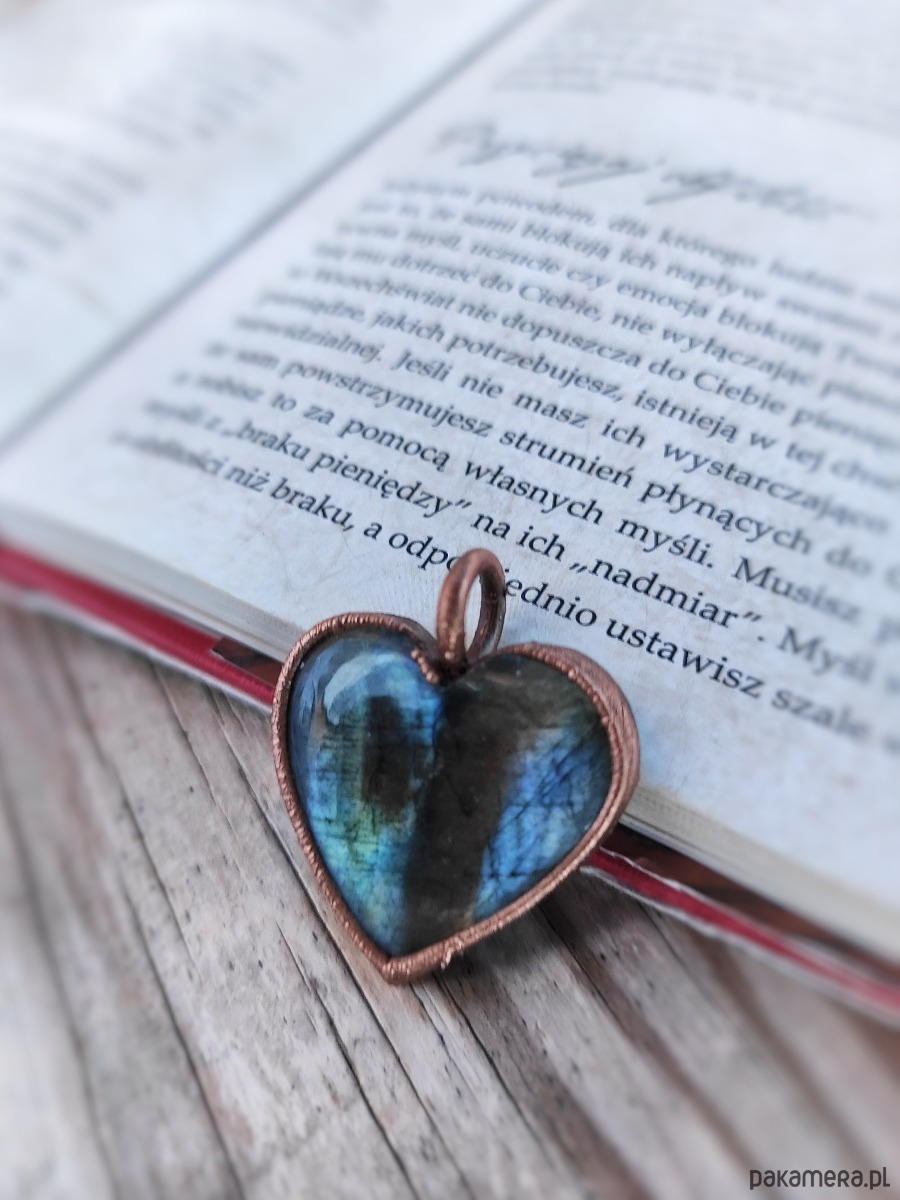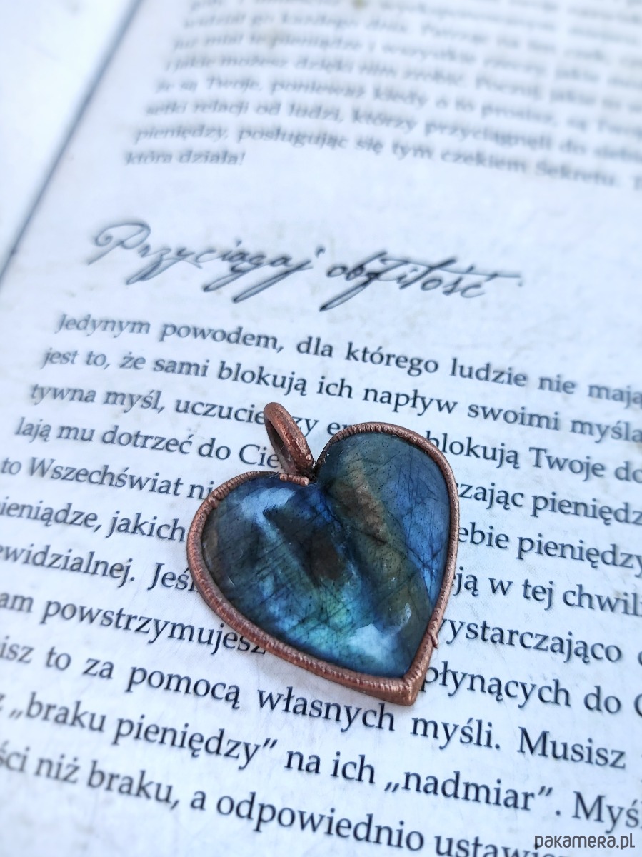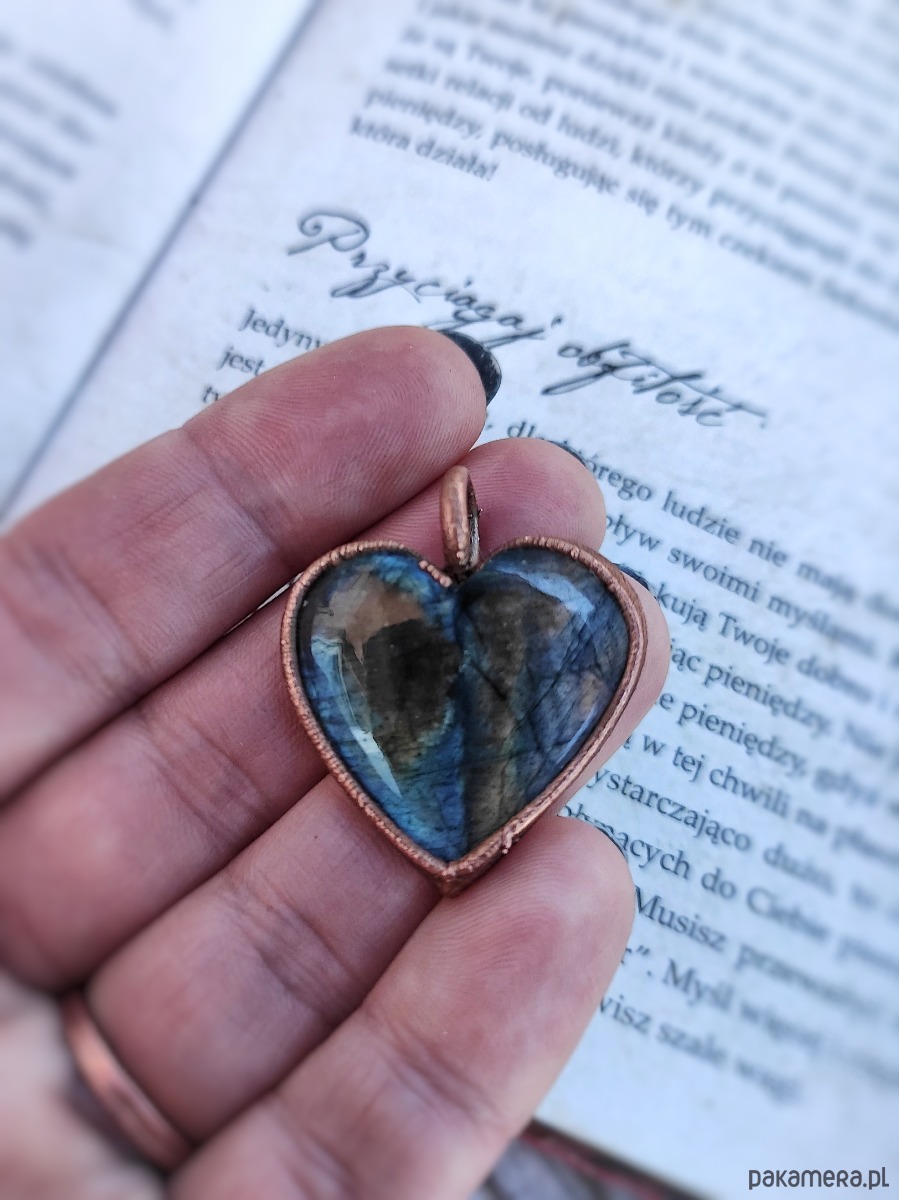 Wyjątkowe serduszko z labradorytu, które stało się pięknym wisiorkiem dzięki wykonanej przez nas oprawie miedzianej za pomocą procesu galwanizacji.