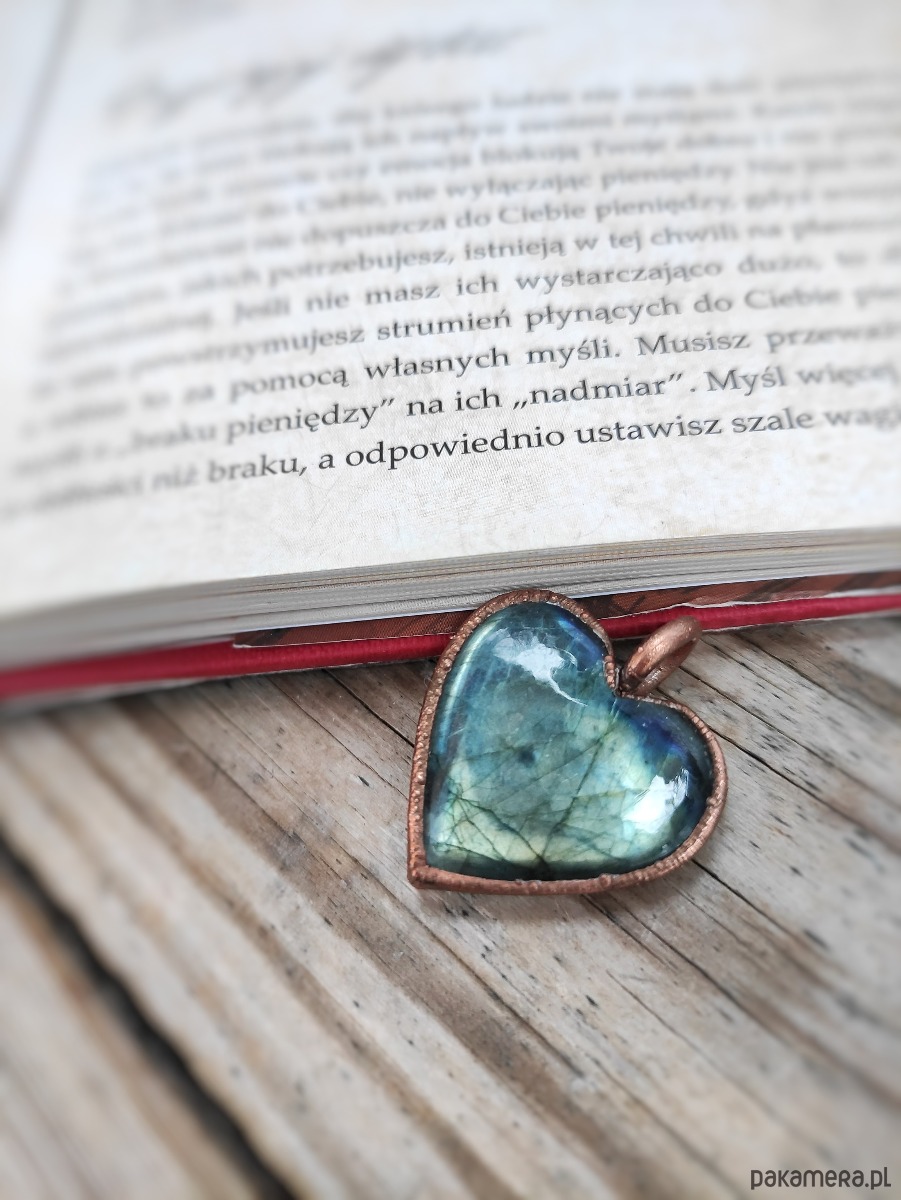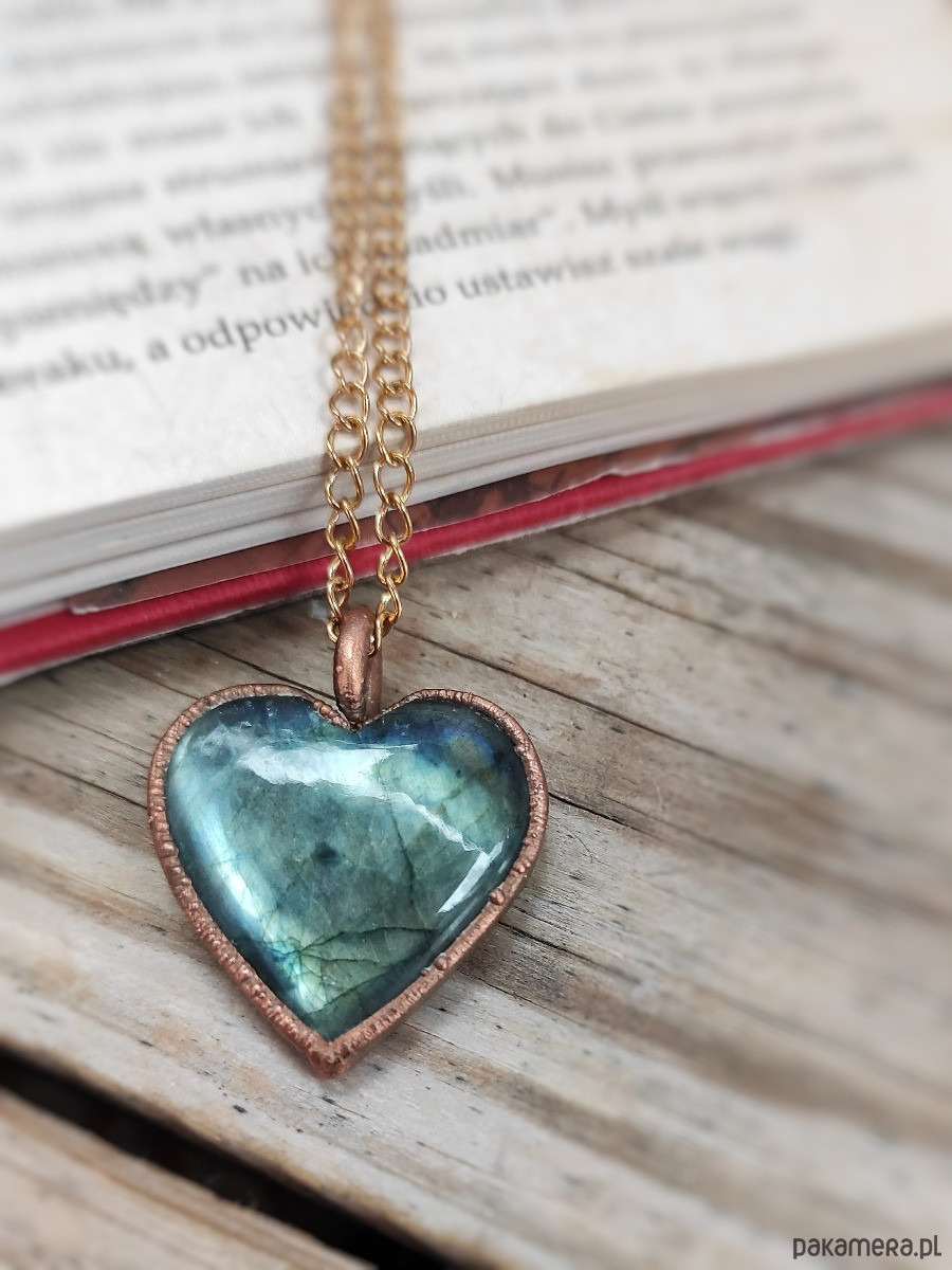 Wyjątkowe serduszko z labradorytu, które stało się pięknym wisiorkiem dzięki wykonanej przez nas oprawie miedzianej za pomocą procesu galwanizacji.