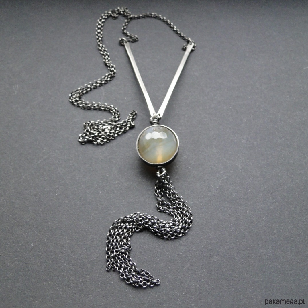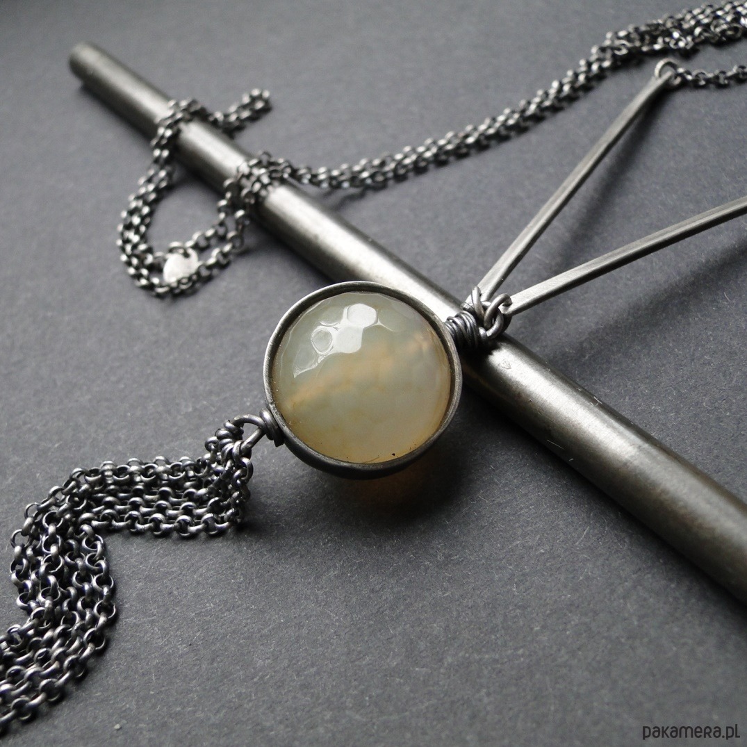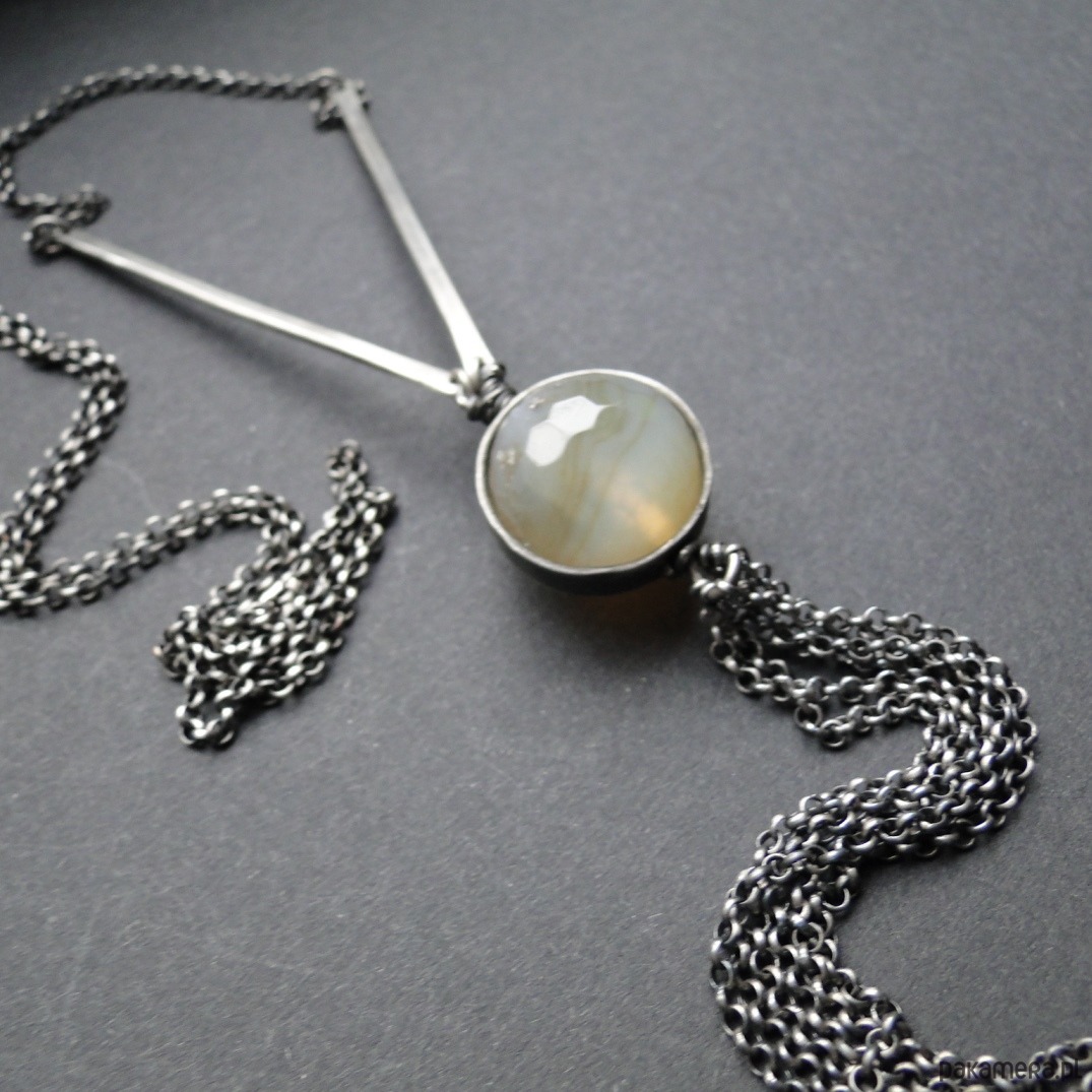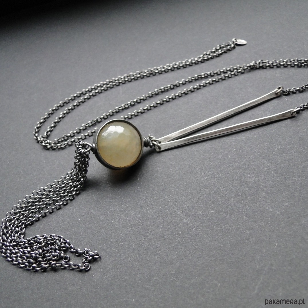 Surowy, prosty wisior w delikatnym, miodowym kolorze. Srebro pr. 930,oksydowane i szorowane. Naturalny agat śr. 18mm , fasetowany. Jego struktura przypomina plaster miodu. Agat oprawiłam w srebrną obręcz. Poniżej kamienia ozdobny chwost. Łańcuch ma 72 cm długości.