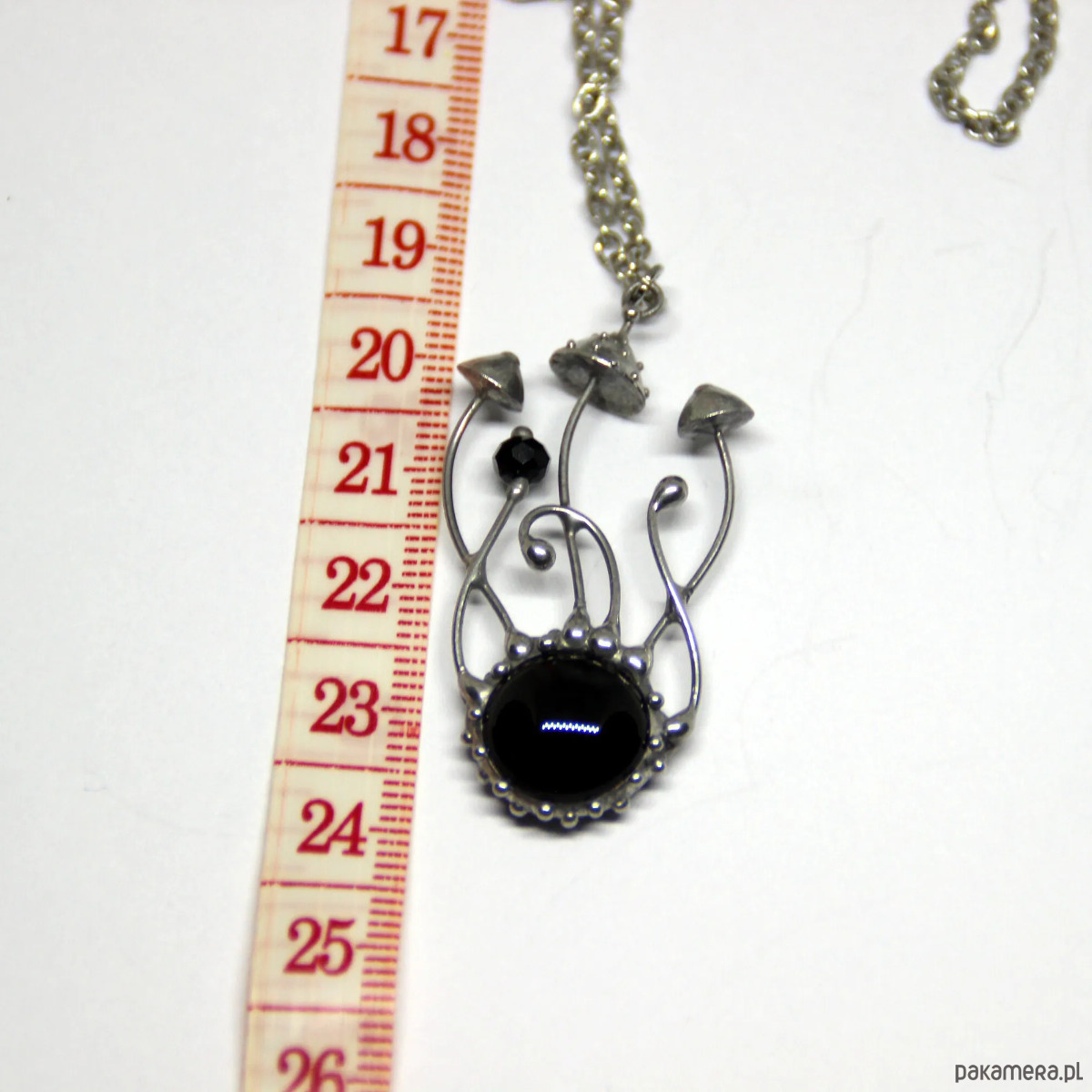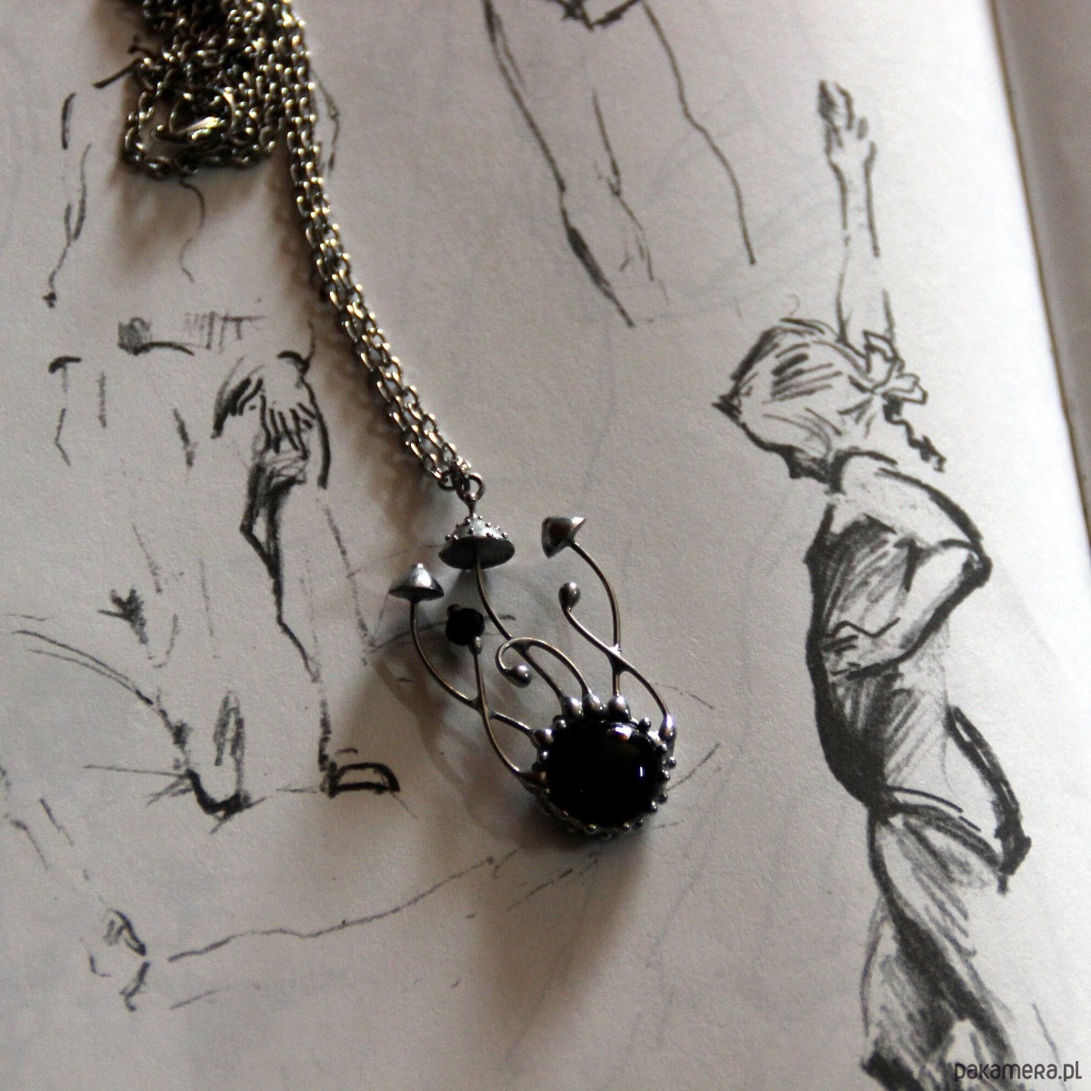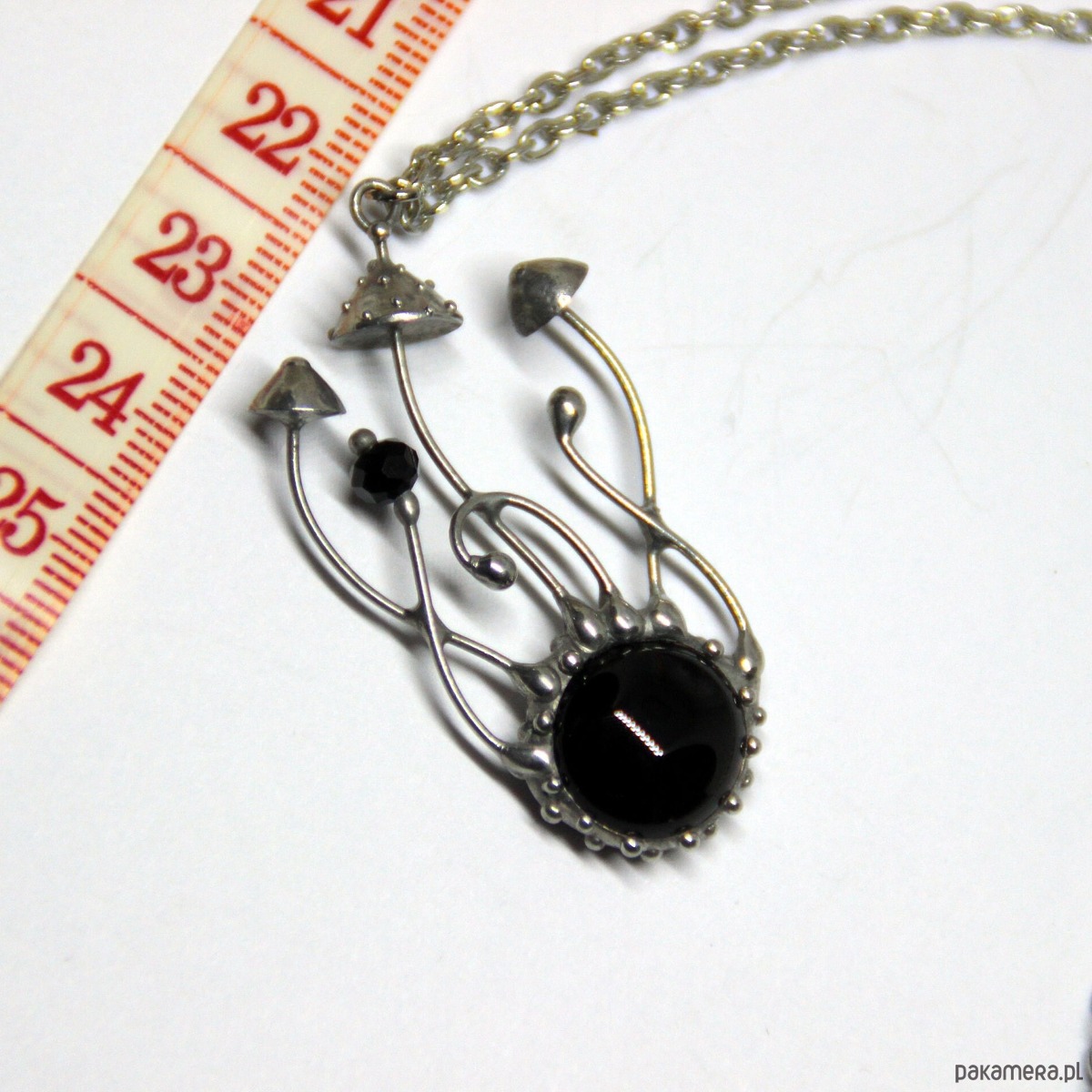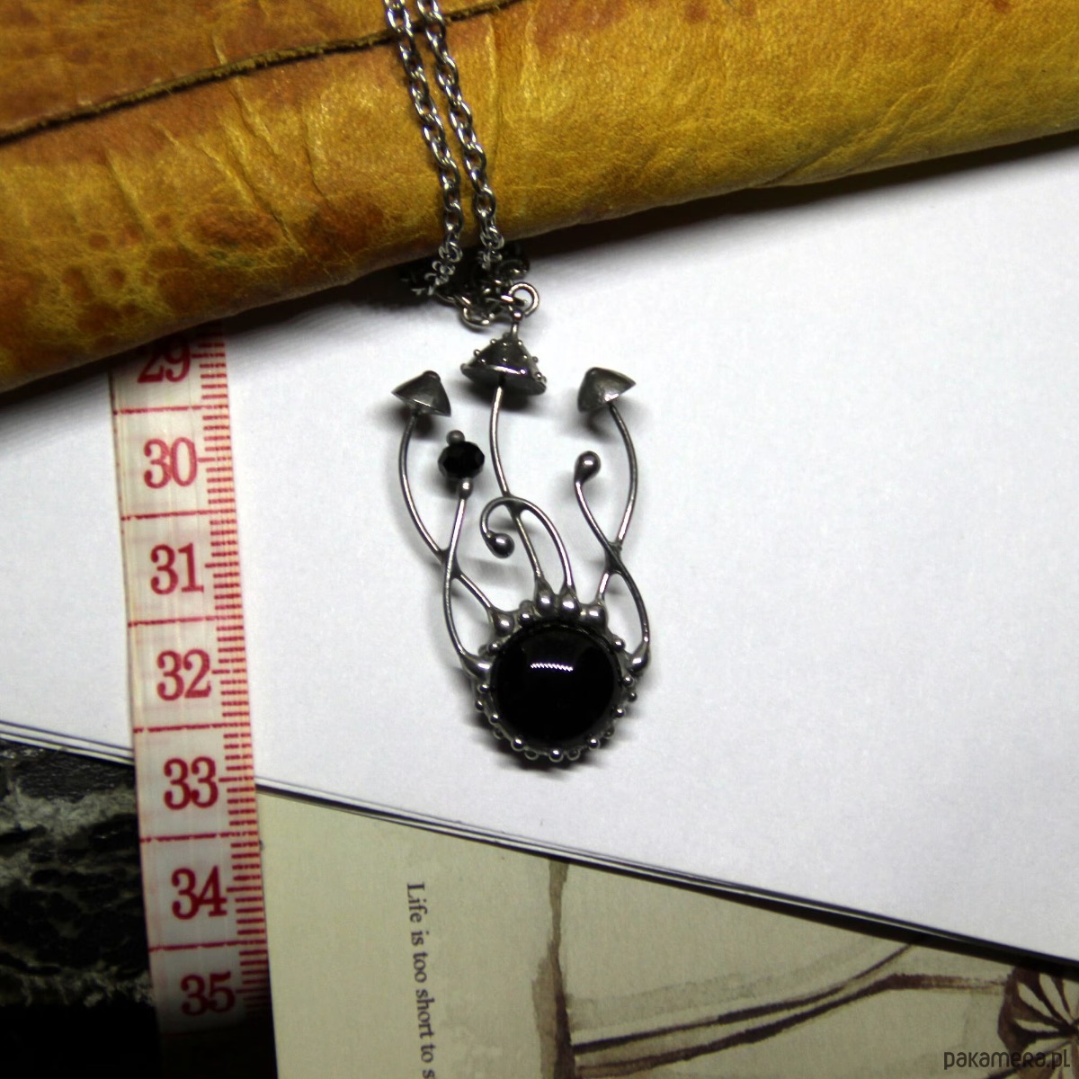 Biżuteria leśna z grzybami magicznymi, wisiorek z czarnego szkła, wykonany ręcznie z miedzi, cyny, stali i czarnego szkła. Pokryty czarną patyną i zabezpieczony środkiem przeciwutleniającym. Naszyjnik jest lekki i cienki, ale mimo to wytrzymały. Wszystkie elementy są wykonane ręcznie, co zapewnia indywidualność każdego produktu wytworzonego w warsztacie Yadovito. Stop cyny i miedzi jest polerowany roztworem wykończeniowym, aby nadać biżuterii szlachetny wygląd, a jednocześnie zapobiec utlenianiu się metalu. Niezwykły i solidny wisiorek hippisowski z motywem muchomora czerwonego. Rozmiar około 4,5/2,5 cm. Kolor srebrny/czarny.