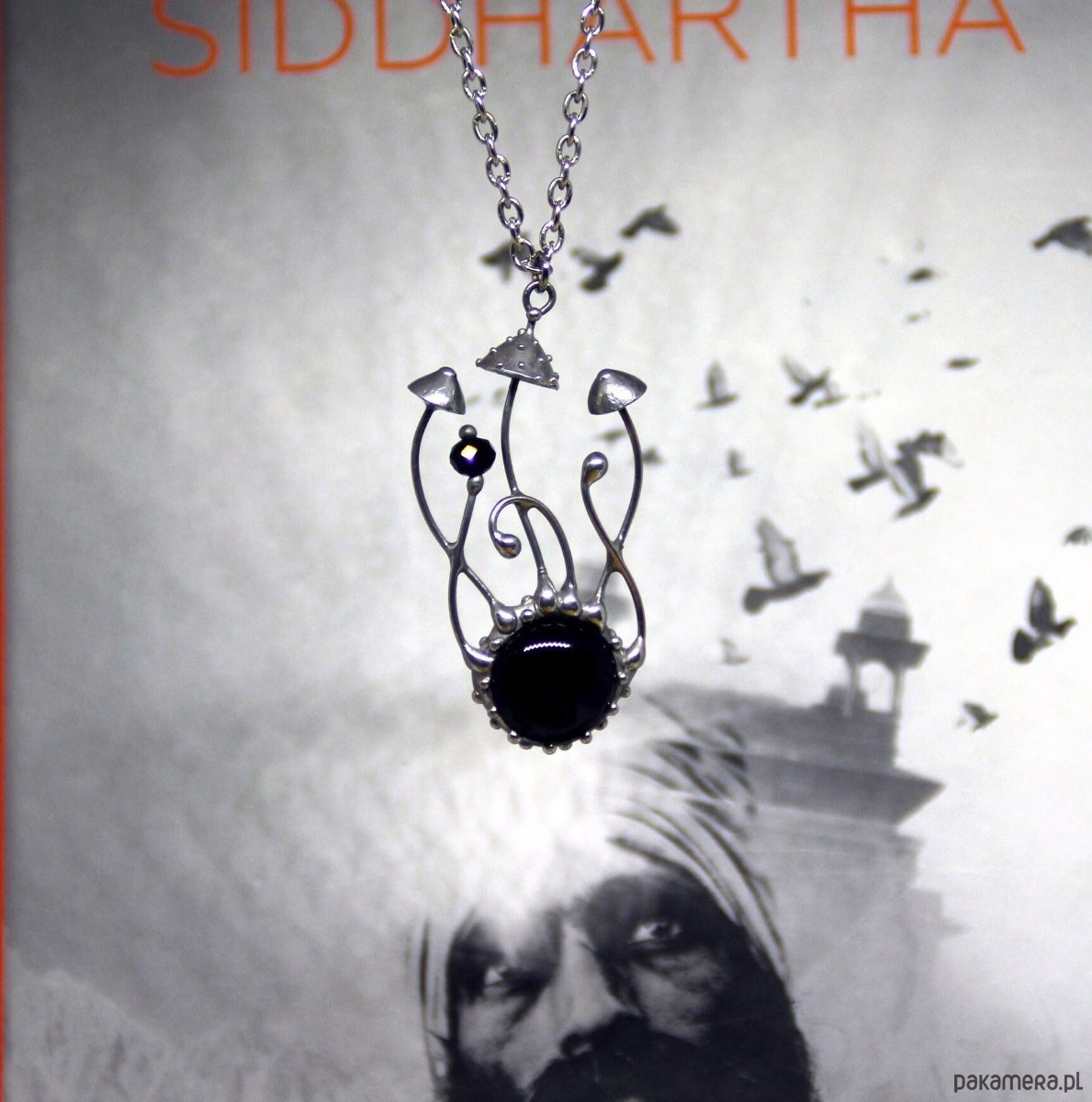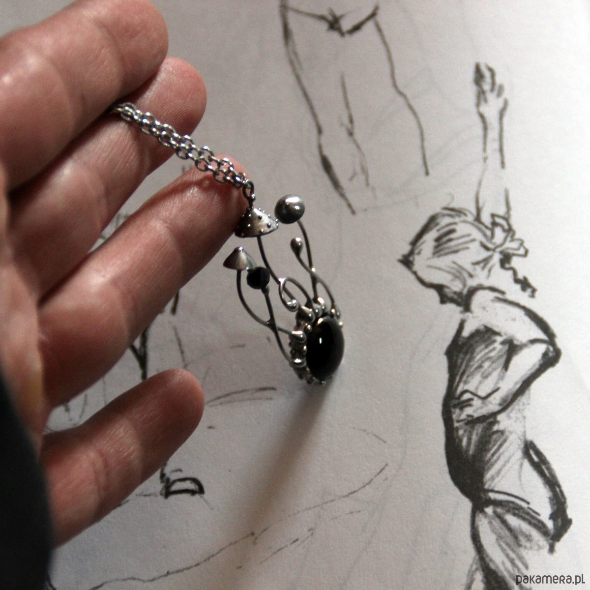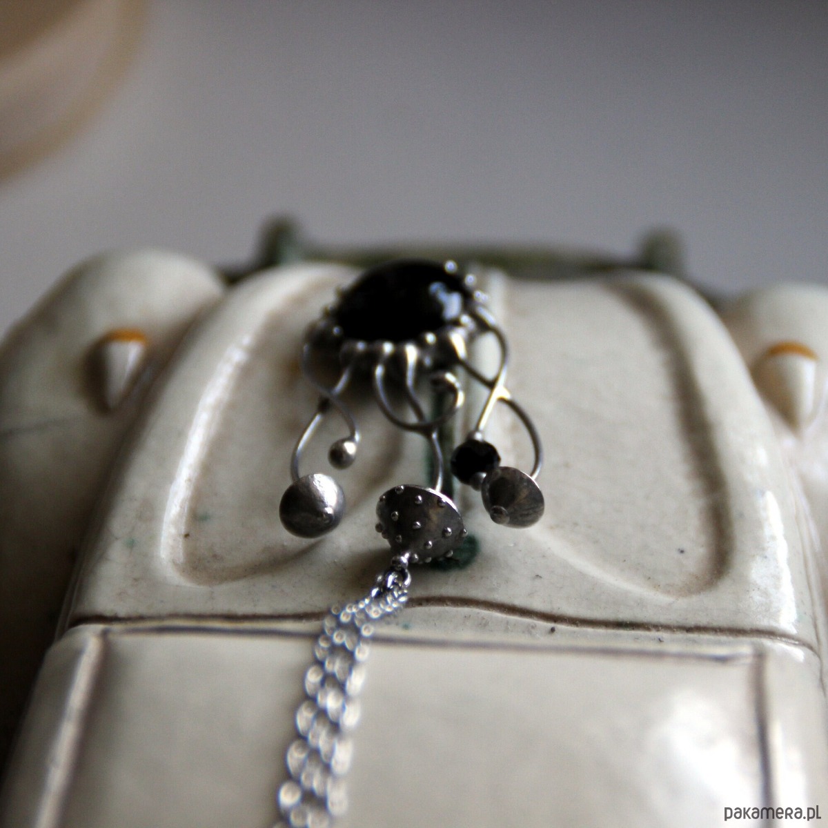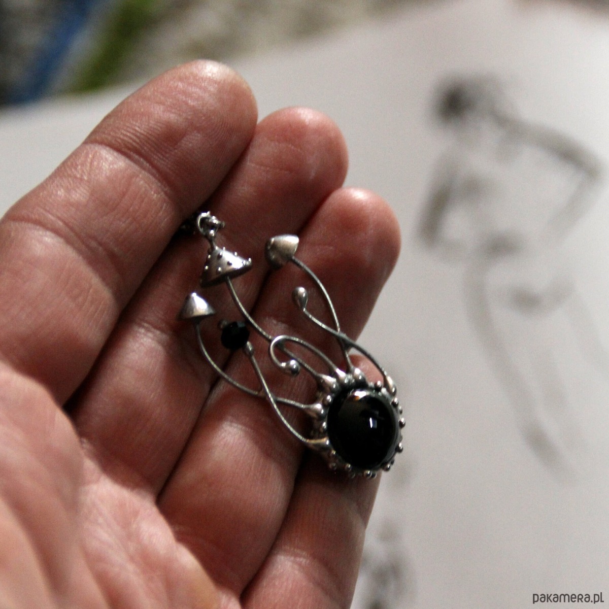 Biżuteria leśna z grzybami magicznymi, wisiorek z czarnego szkła, wykonany ręcznie z miedzi, cyny, stali i czarnego szkła. Pokryty czarną patyną i zabezpieczony środkiem przeciwutleniającym. Naszyjnik jest lekki i cienki, ale mimo to wytrzymały. Wszystkie elementy są wykonane ręcznie, co zapewnia indywidualność każdego produktu wytworzonego w warsztacie Yadovito. Stop cyny i miedzi jest polerowany roztworem wykończeniowym, aby nadać biżuterii szlachetny wygląd, a jednocześnie zapobiec utlenianiu się metalu. Niezwykły i solidny wisiorek hippisowski z motywem muchomora czerwonego. Rozmiar około 4,5/2,5 cm. Kolor srebrny/czarny.