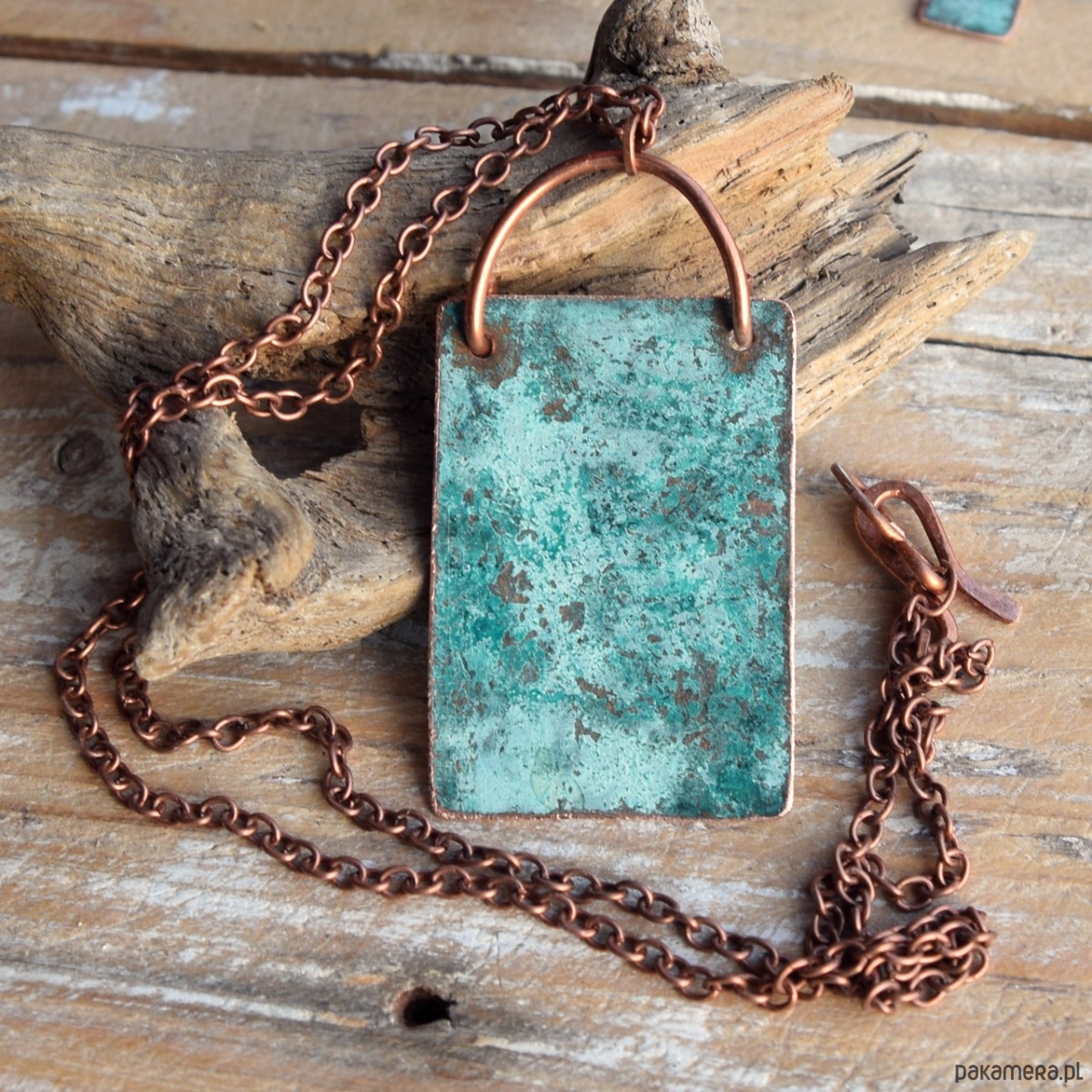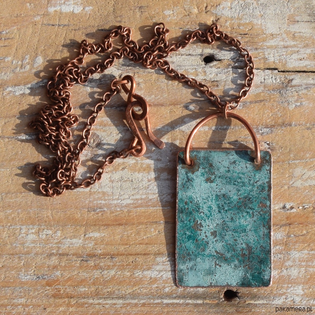 Wisior - naszyjnik wykonany z patynowanej miedzi (naturalna patyna) na łąńcuszku w kolorze starej miedzi. Zapięcie wykonane ręcznie z kutej miedzi.