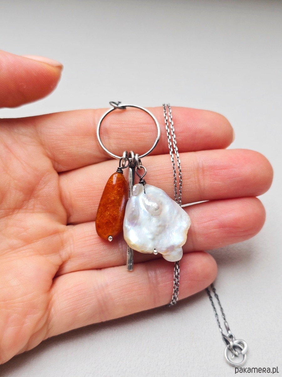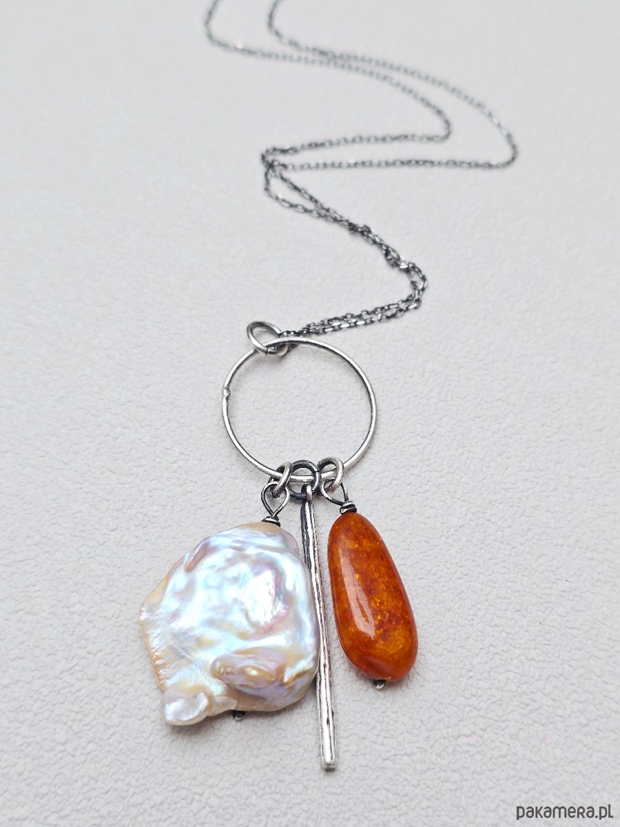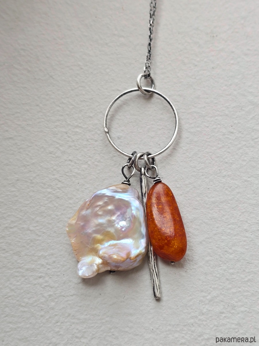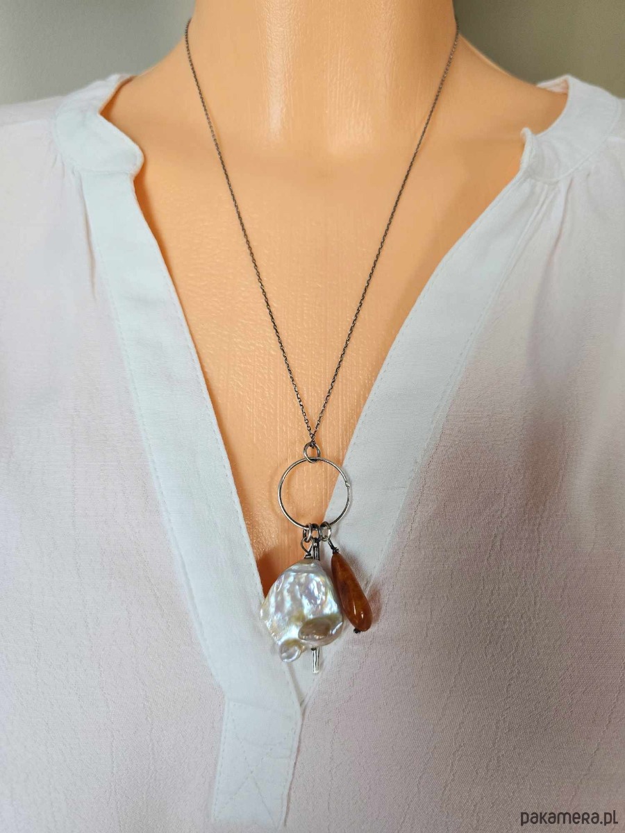 Piękny wisior z unikatową nieregularną perłą i bryłką bursztynu.