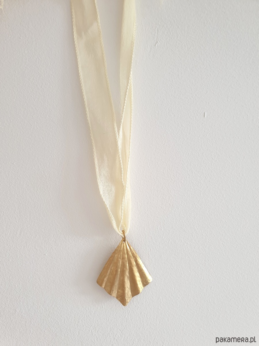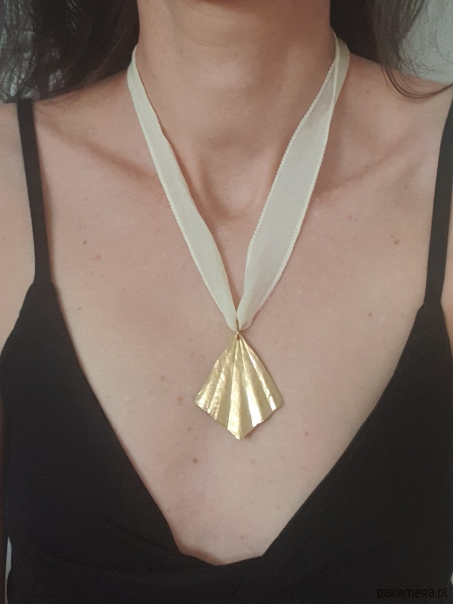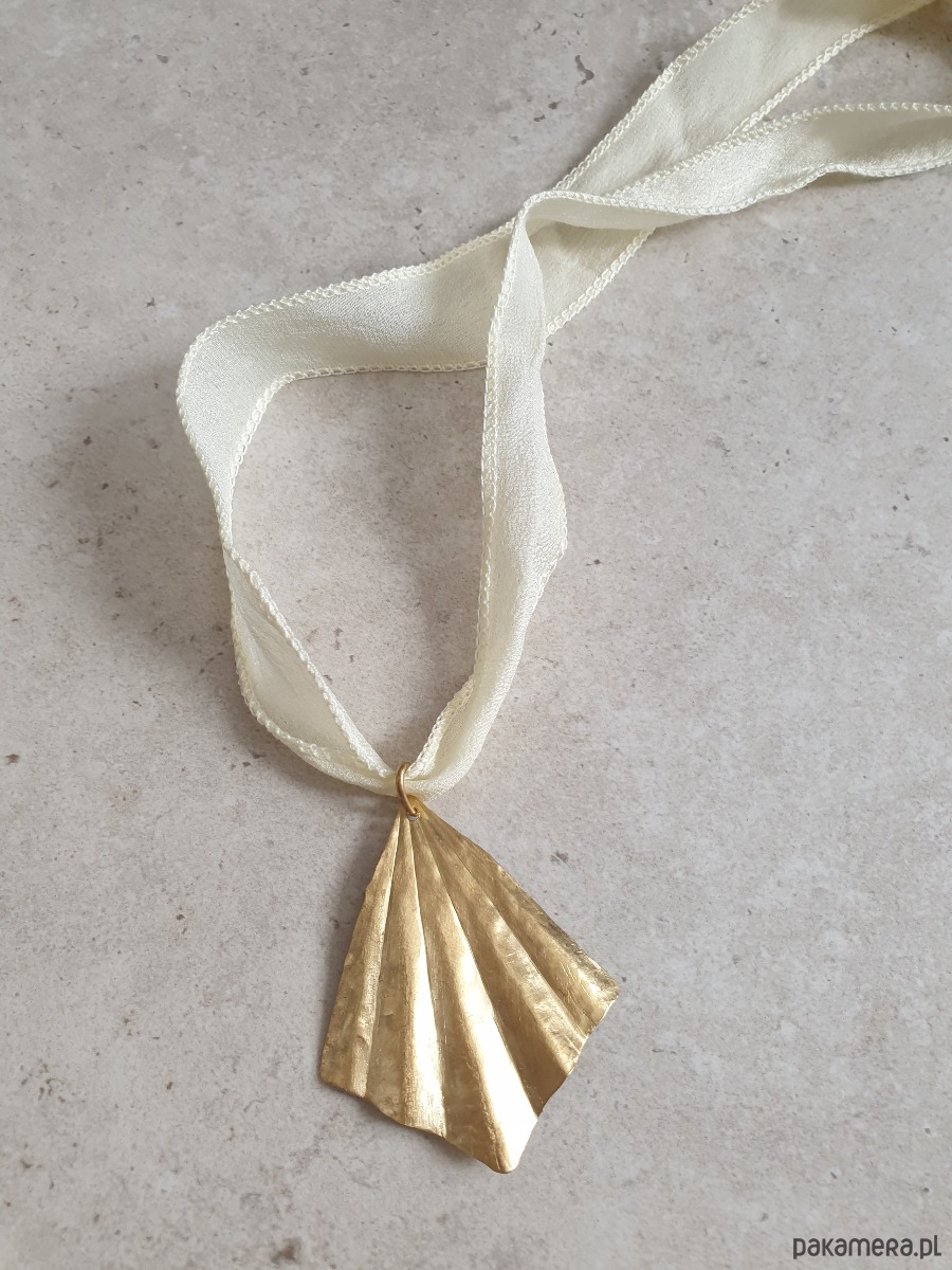 Minimalistyczny duży, elegancki naszyjnik, w surowym, rustykalnym stylu, wisior z kolekcji ORIGAMI w kształcie wachlarza, z surowego mosiądzu ręcznie wycinany, młotkowany i delikatnie matowiony. Wisior jest na jedwabnej ręcznie barwionej szerokiej wstążce. Wstążka jest do zawiązania na dowolnej długości. Naszyjnik tworzony na zamówienie, każdy jest unikatowy