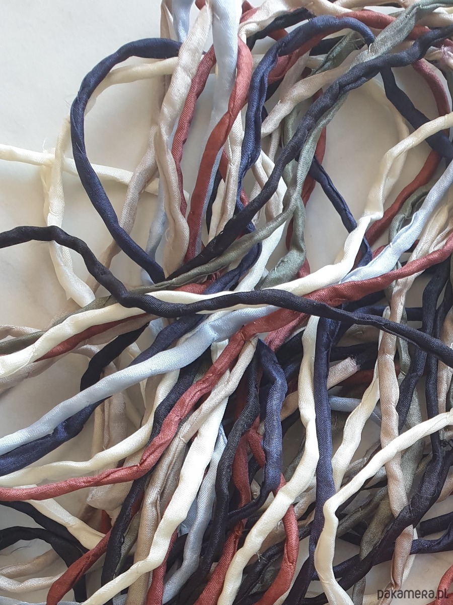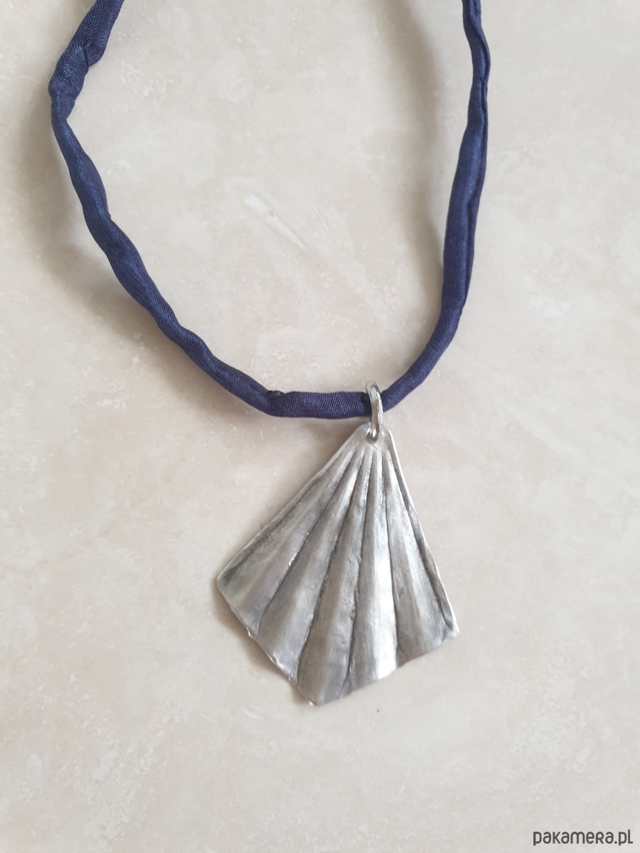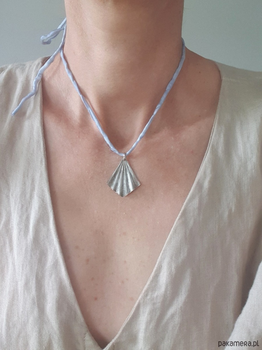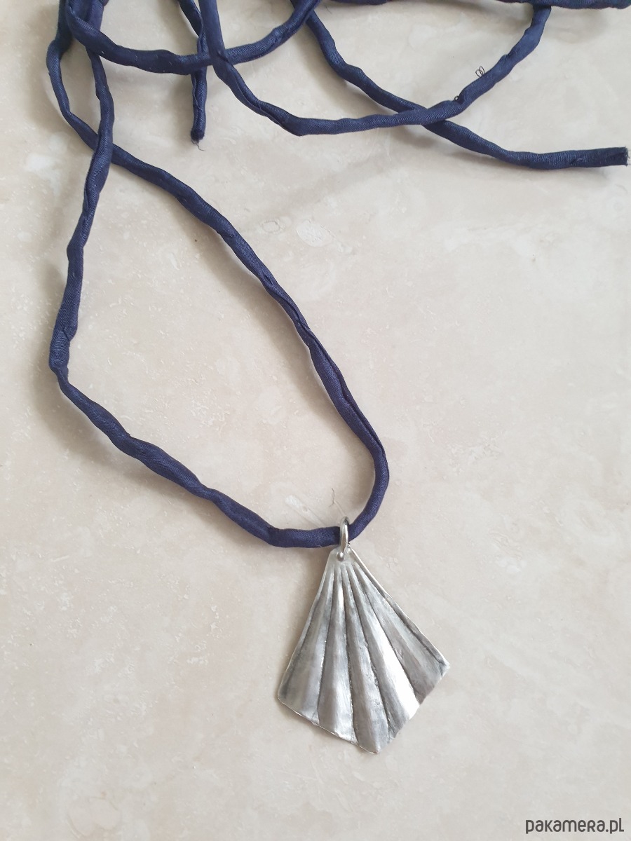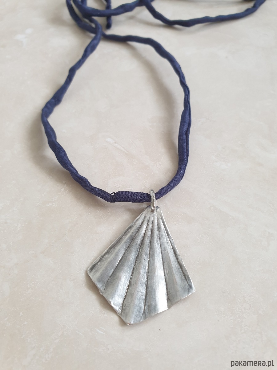 Wisior z surowego mosiądzu posrebrzanego na stare srebro, ręcznie wycinany, młotkowany i delikatnie matowiony. Wisior jest na jedwabnej ręcznie barwionej i zszywanej wstążce. Wstążka jest do zawiązania na dowolnej długości. Naszyjnik tworzony na zamówienie, każdy jest unikatowy