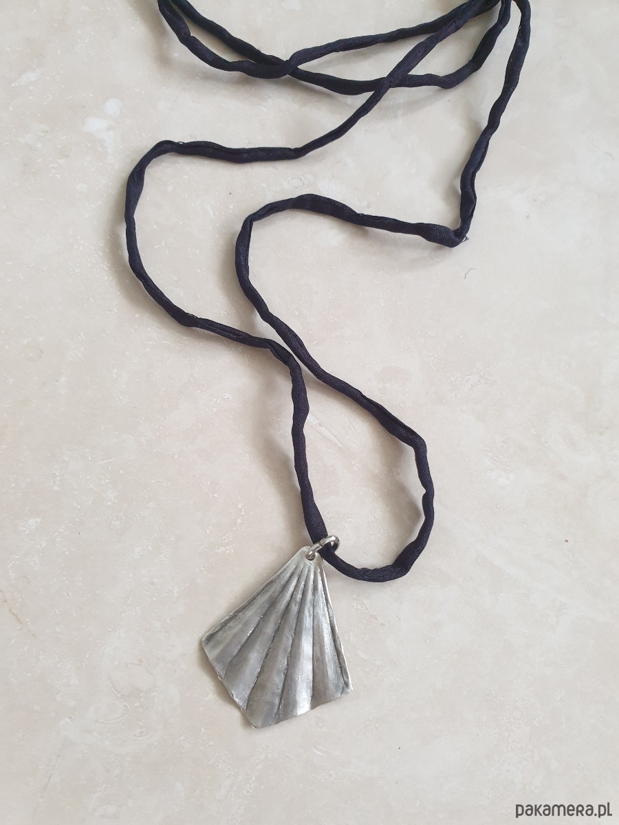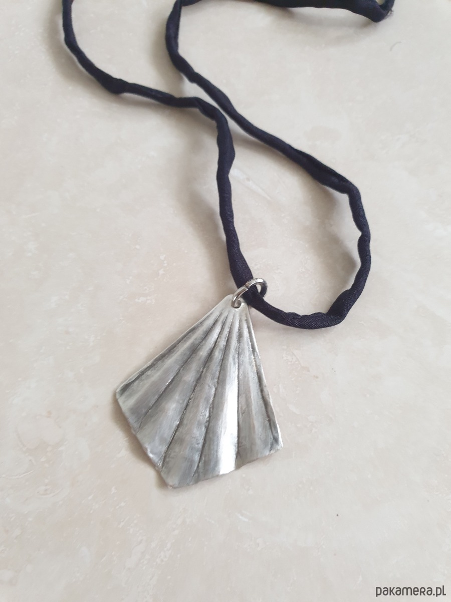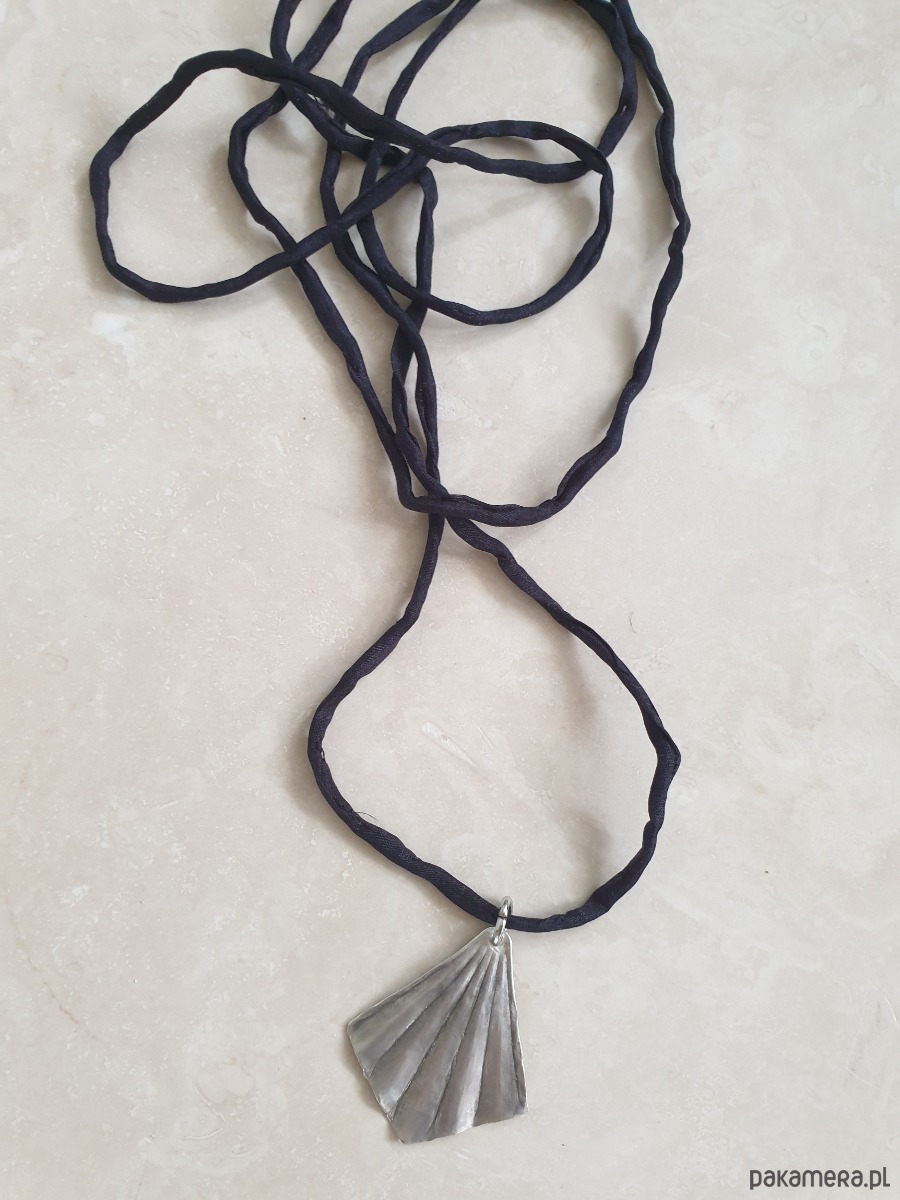 Minimalistyczny delikatny, elegancki naszyjnik, w surowym, rustykalnym stylu, wisior z kolekcji ORIGAMI w kształcie wachlarza, z mosiądzu posrebrzanego na stare srebro, ręcznie wycinany, młotkowany i delikatnie matowiony. Wisior jest na jedwabnej ręcznie barwionej i zszywanej wstążce. Wstążka jest do zawiązania na dowolnej długości. Naszyjnik tworzony na zamówienie, każdy jest unikatowy