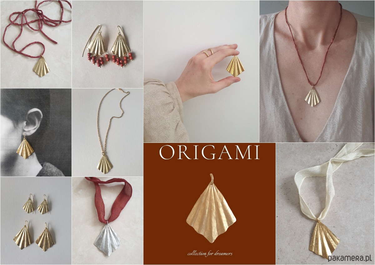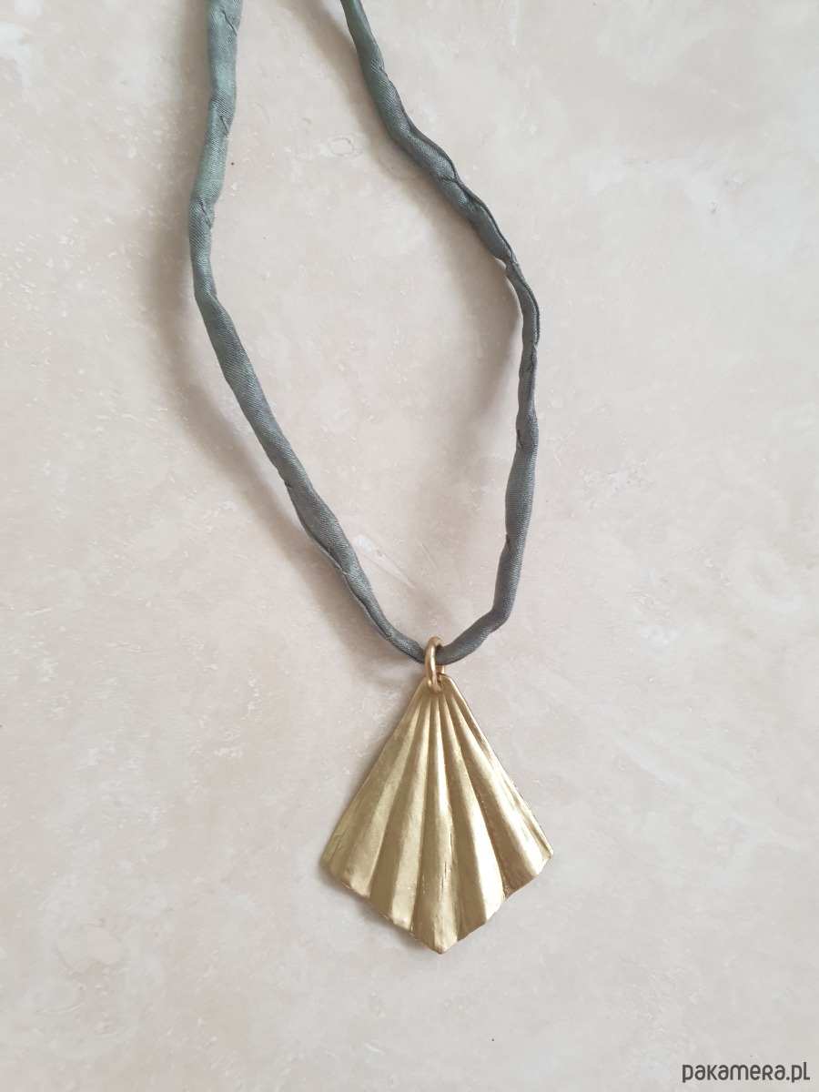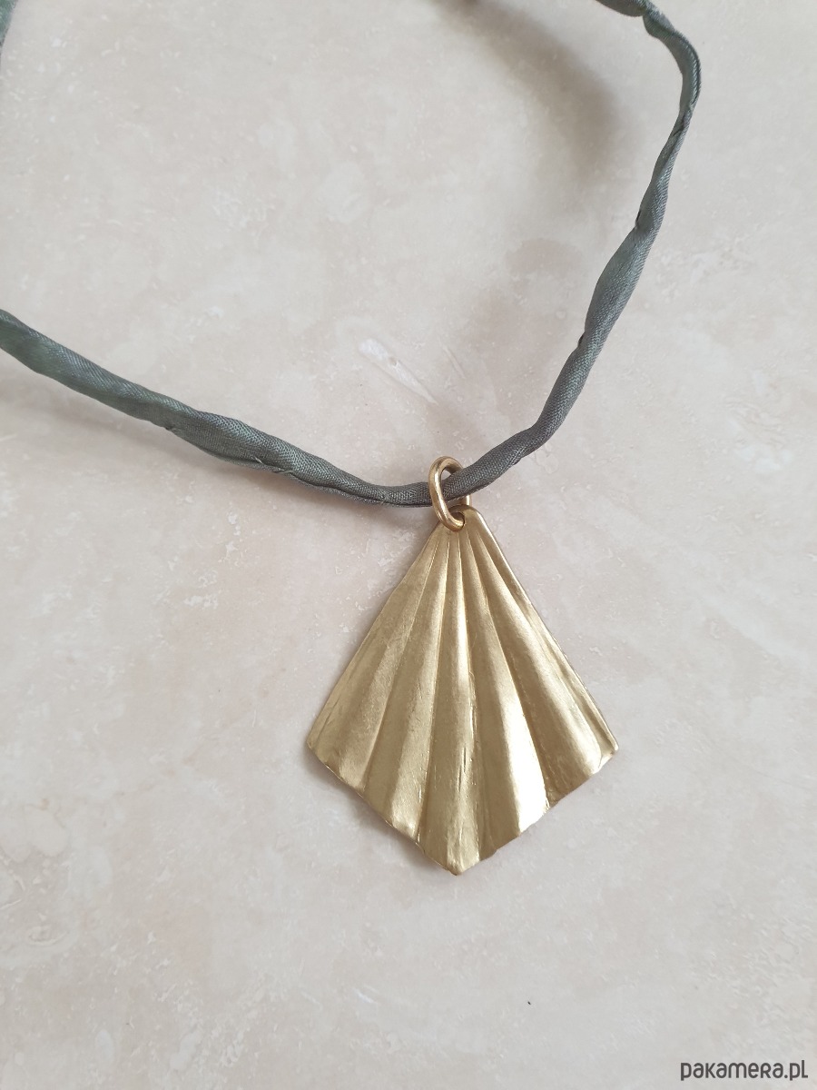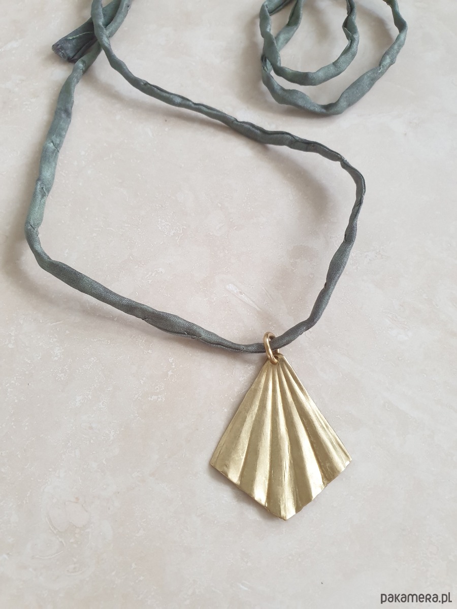 Minimalistyczny delikatny, elegancki naszyjnik, w surowym, rustykalnym stylu, wisior z kolekcji ORIGAMI z surowego mosiądzu, ręcznie wycinany, młotkowany i delikatnie matowiony. Wisior jest na jedwabnej ręcznie barwionej i zszywanej wstążce. Wstążka jest do zawiązania na dowolnej długości. Naszyjnik tworzony na zamówienie, każdy jest unikatowy