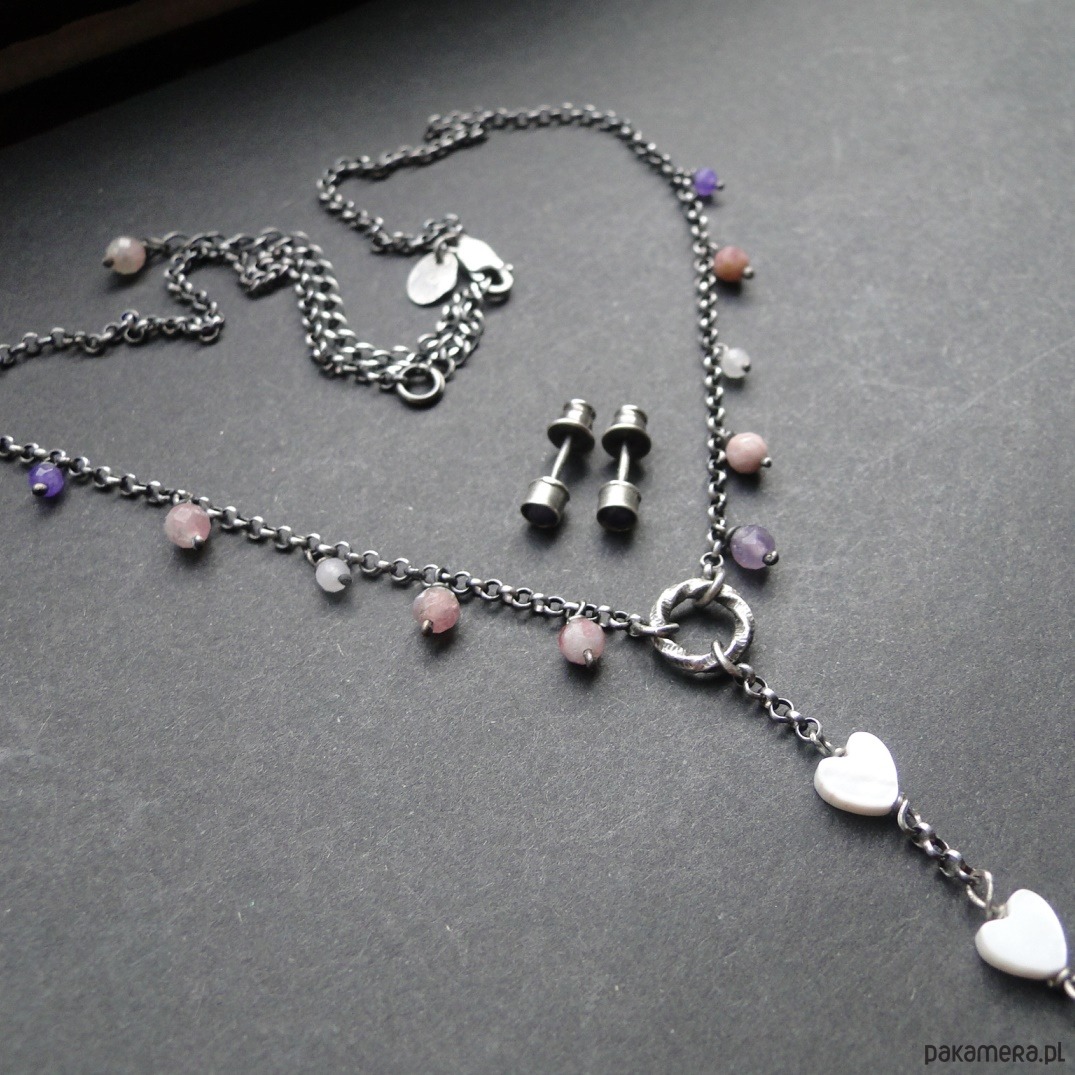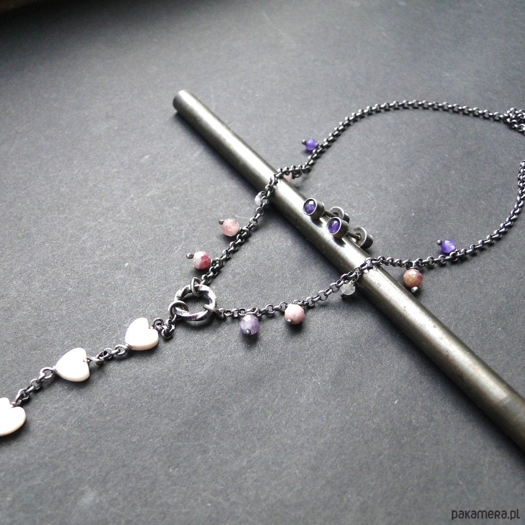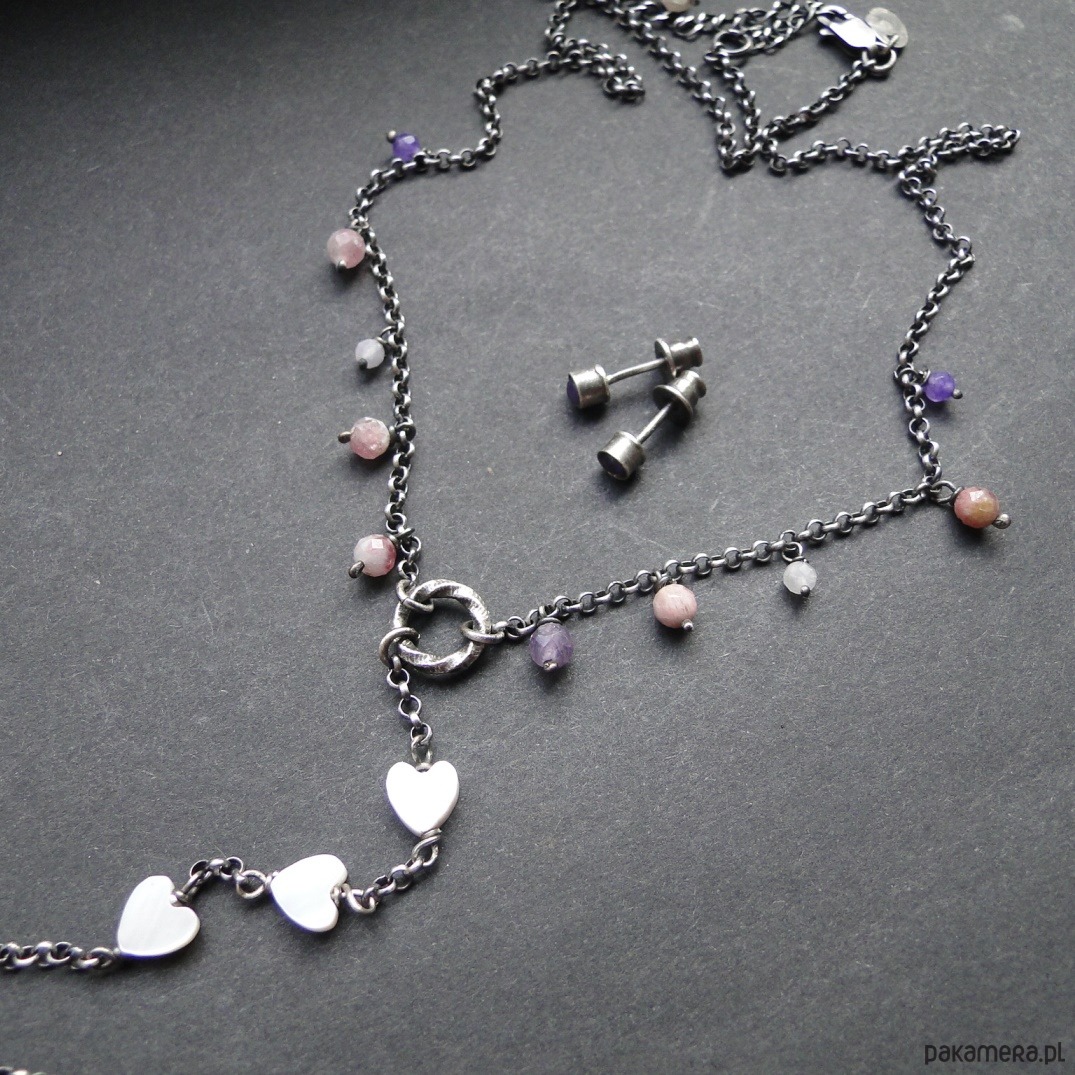 Prosty naszyjnik w kobiecym stylu. Srebro 925,oksydowane i szorowane. Kamienie: naturalne turmaliny i ametysty śr.3-4mm; serca z masy perłowej. Naszyjnik delikaty, lekko surowy. Do zestawu z naszyjnikiem są widoczne na zdjęciu ręcznie wykonane sztyfty z malutkim ametystem. Naszyjnik ma długość 43 cm plus przedłużka 9 cm.