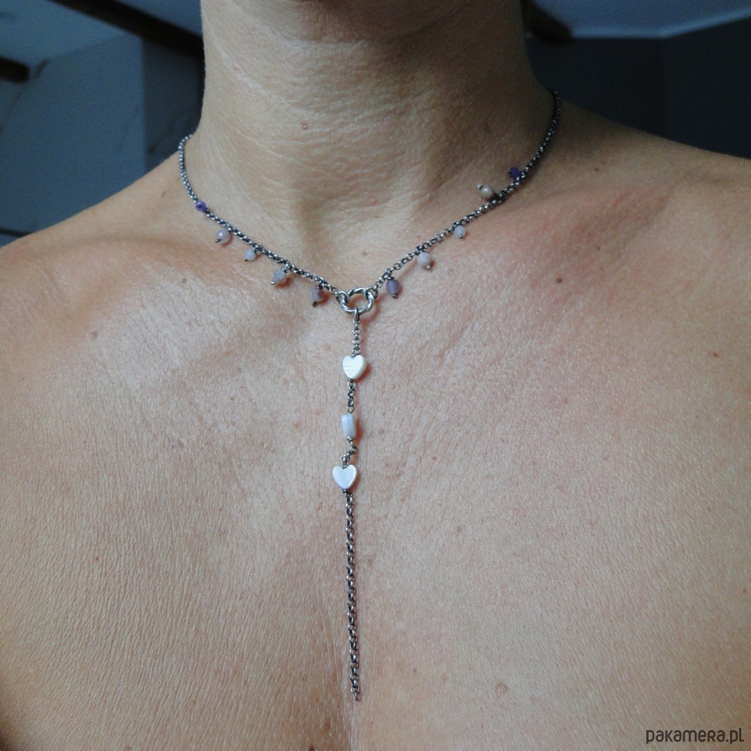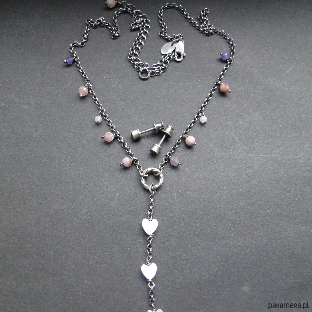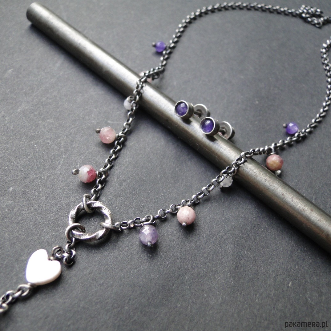 Prosty naszyjnik w kobiecym stylu. Srebro 925,oksydowane i szorowane. Kamienie: naturalne turmaliny i ametysty śr.3-4mm; serca z masy perłowej. Naszyjnik delikaty, lekko surowy. Do zestawu z naszyjnikiem są widoczne na zdjęciu ręcznie wykonane sztyfty z malutkim ametystem. Naszyjnik ma długość 43 cm plus przedłużka 9 cm.