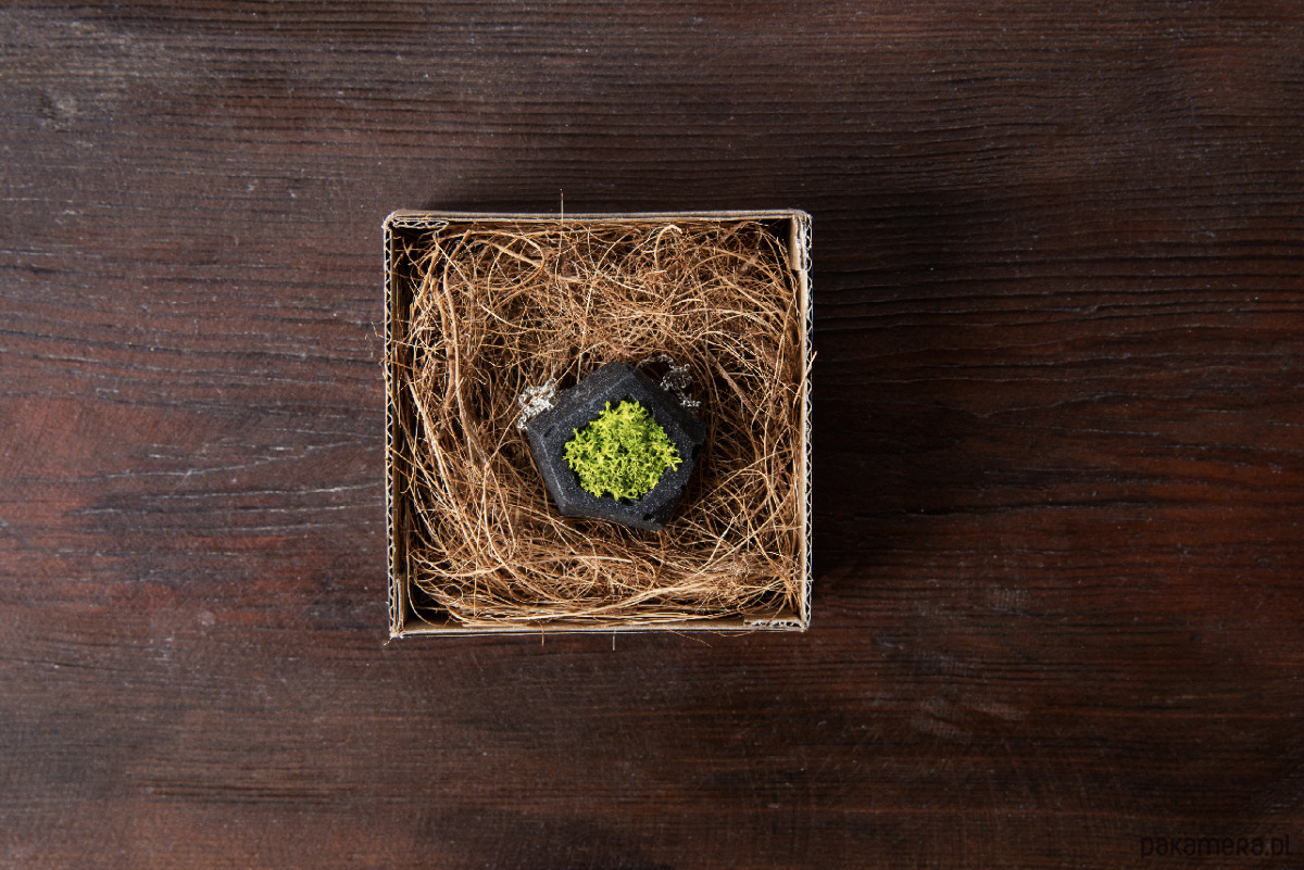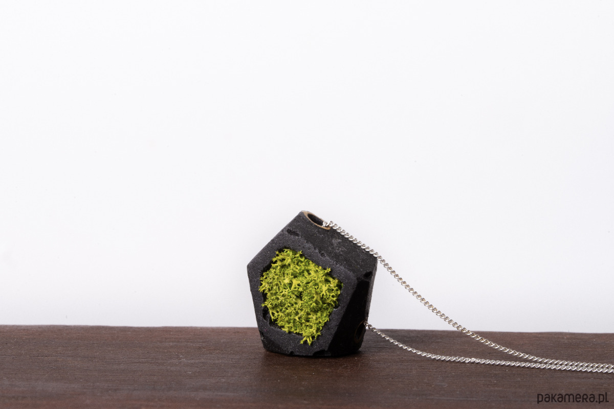 Wisior z betonu architektonicznego (barwionego na kolor ciemnografitowy) z chrobotkiem
