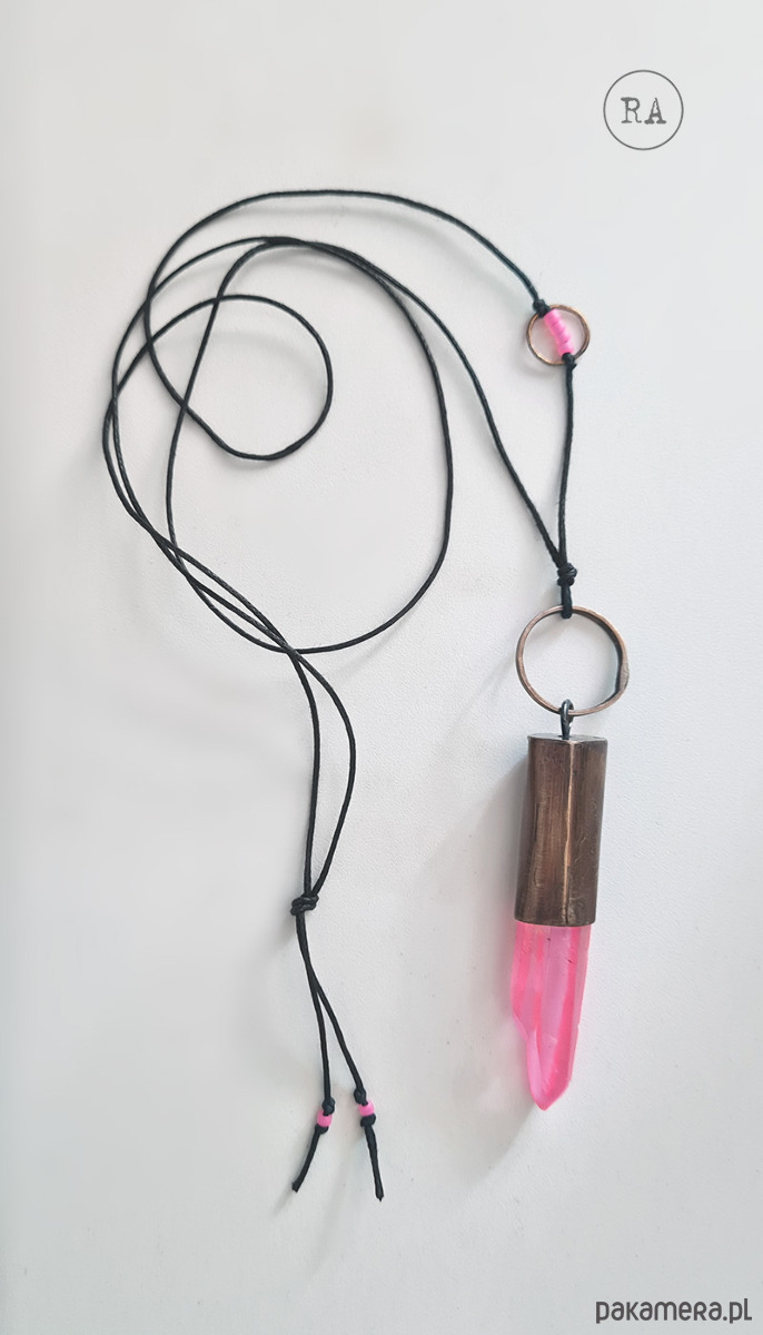 Naszyjnik z kryształem górskim "Pink Aura", mosiądz.