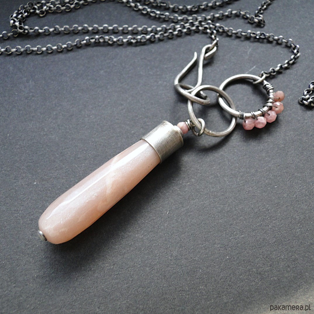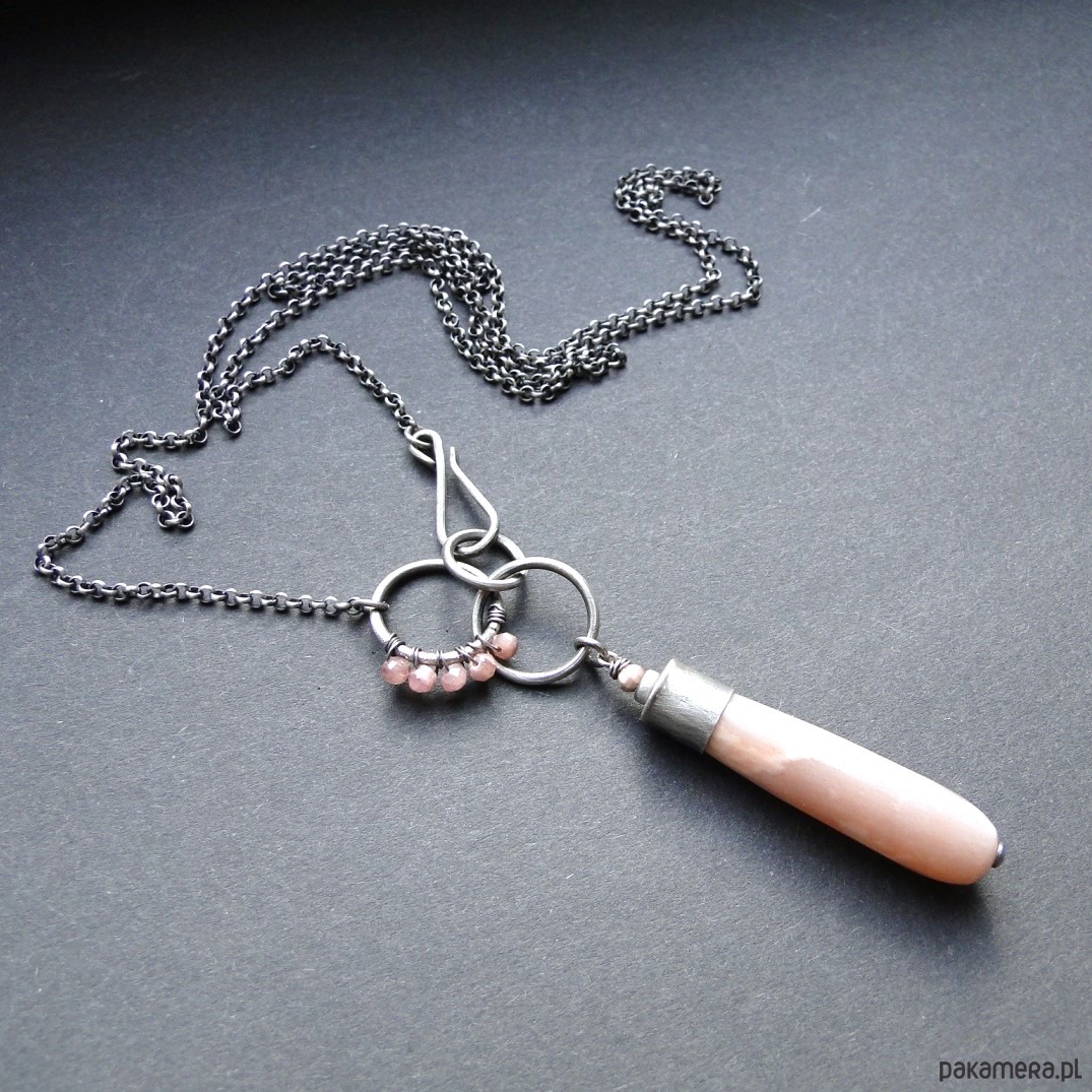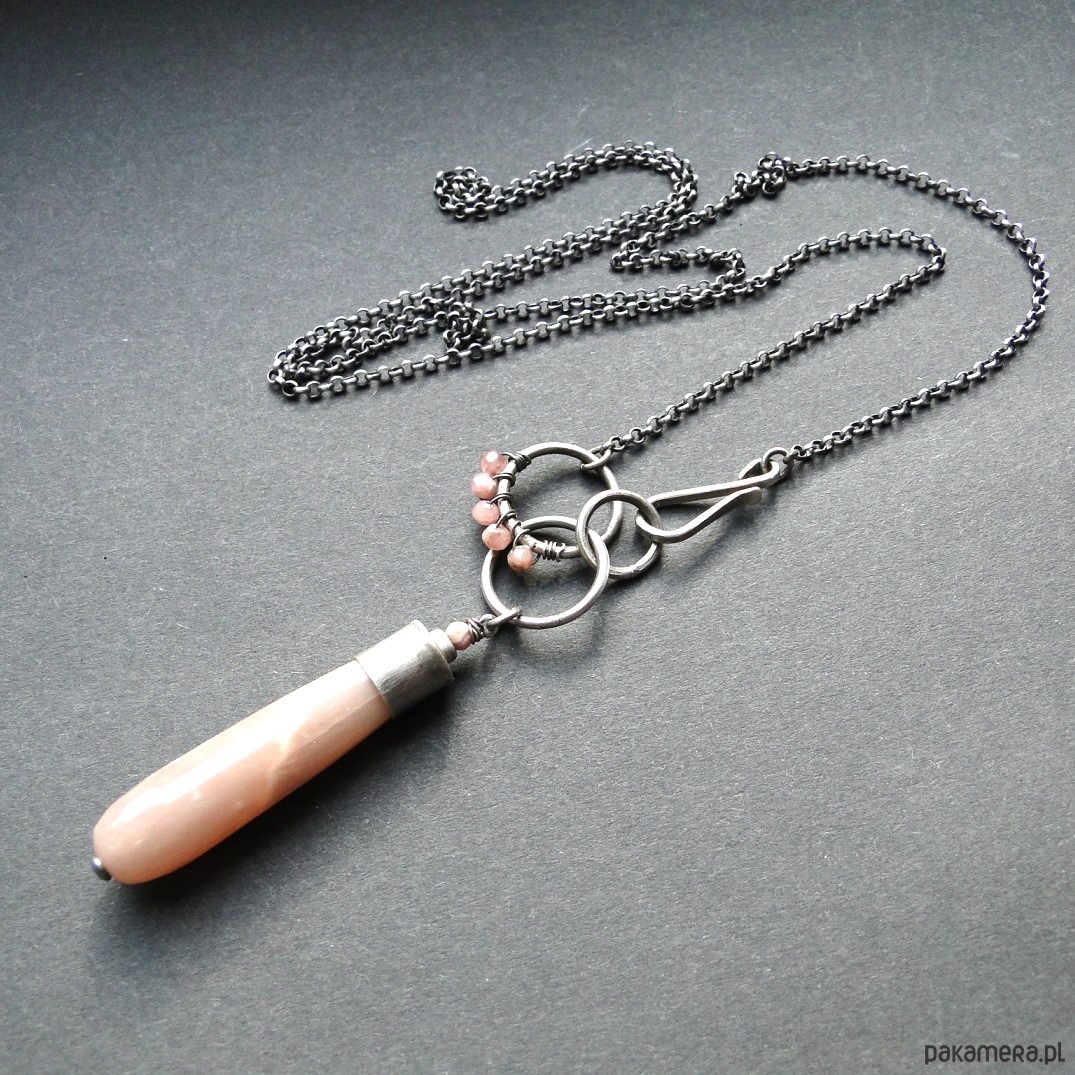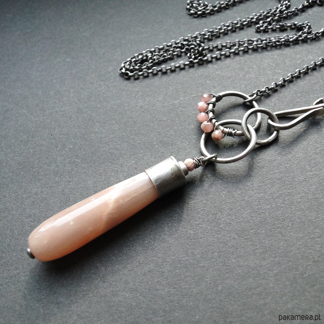 Surowy wisior w subtelnym kolorze pudrowego różu. Srebro 930,oksydowane i szorowane. Wszystkie elementy srebrne prócz łańcucha zostały ręcznie przeze mnie wykonane. Kamienie: imponujący kamień słoneczny dł.4 cm z piękną poświatą typową dla tego minerał; małe kulki rodochrozytu śr. 3,8mm. Wszystkie minerały są fasetowne. Łańcuch dł. aż 78 cm, zapięcie na hak. Polecam kolczyki do kompletu (na zdjęciu).