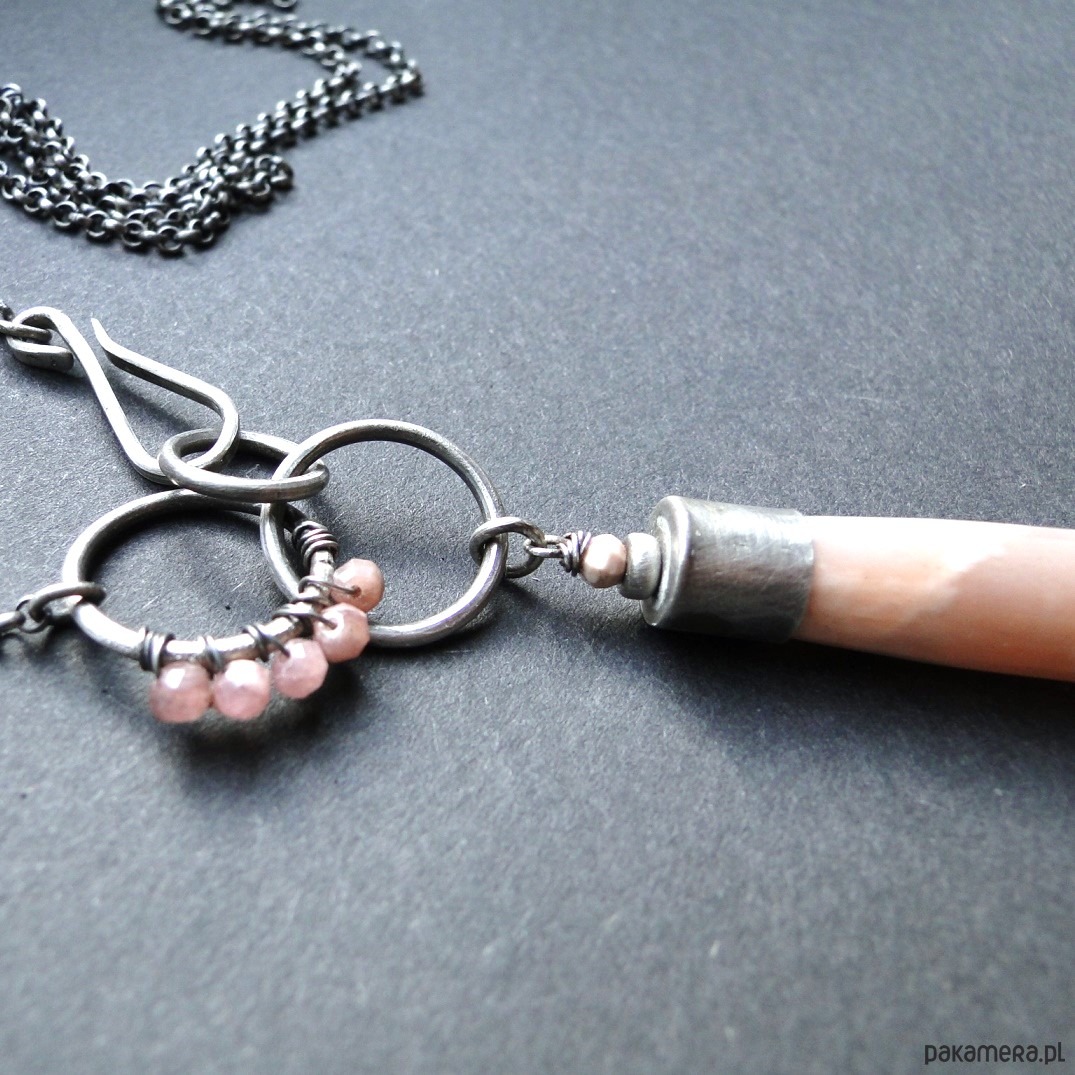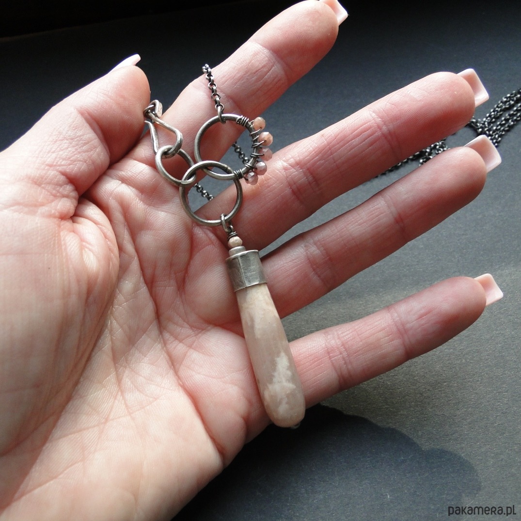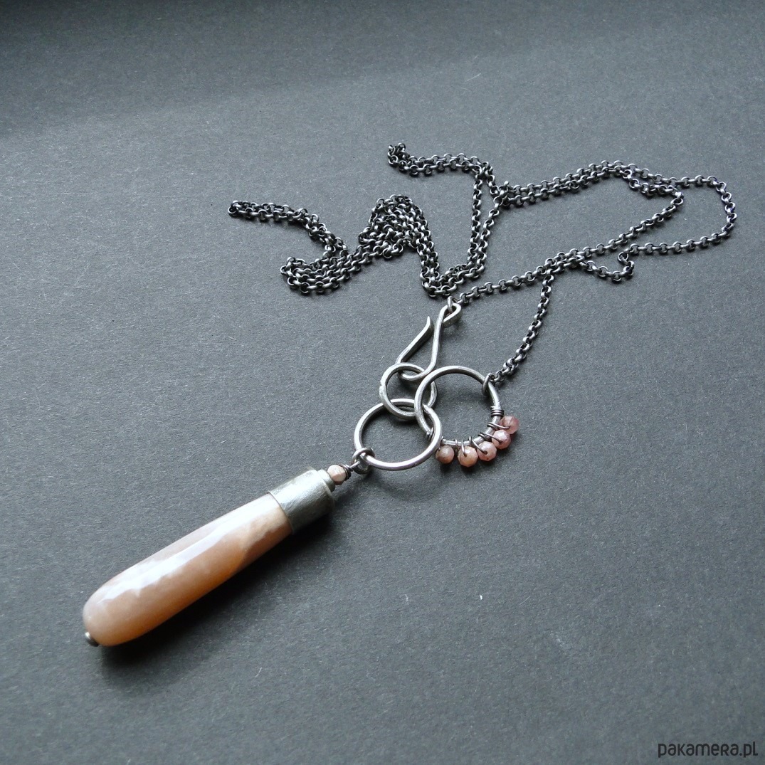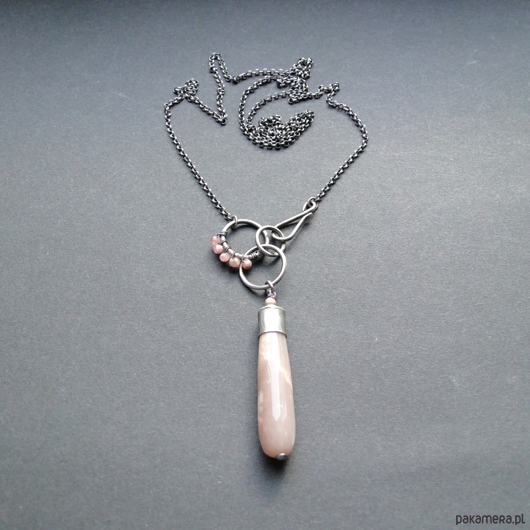 Surowy wisior w subtelnym kolorze pudrowego różu. Srebro 930,oksydowane i szorowane. Wszystkie elementy srebrne prócz łańcucha zostały ręcznie przeze mnie wykonane. Kamienie: imponujący kamień słoneczny dł.4 cm z piękną poświatą typową dla tego minerał; małe kulki rodochrozytu śr. 3,8mm. Wszystkie minerały są fasetowne. Łańcuch dł. aż 78 cm, zapięcie na hak. Polecam kolczyki do kompletu (na zdjęciu).