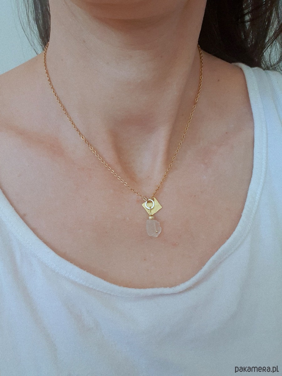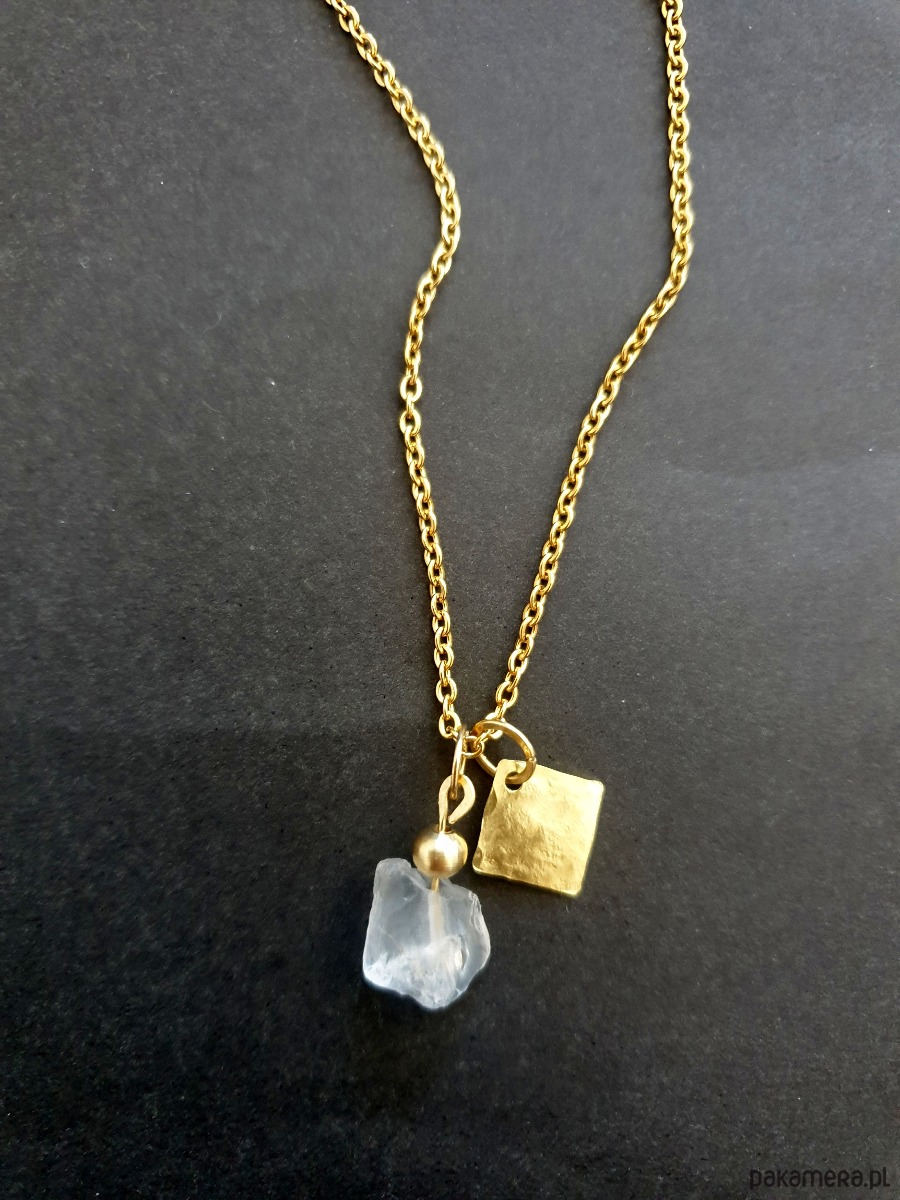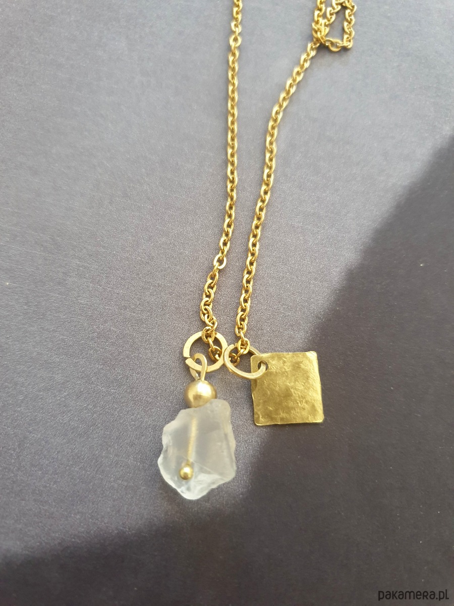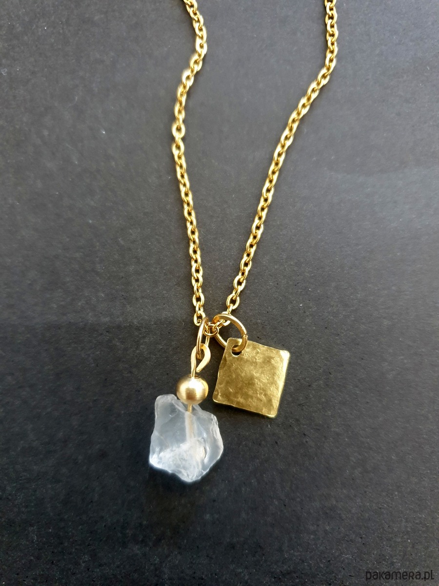 Minimalistyczny delikatny wisior na łańcuchu z kolekcji RAW ANTYK inspirowanej starożytnymi mozaikami, neolitycznymi płaskorzeźbami i starymi rycinami. Łańcuszek ze stali szlachetnej pozłacany z zawieszką ręcznie młotkowaną z surowego mosiądzu, oraz nieregularnym surowym, matowym kryształem górskim.