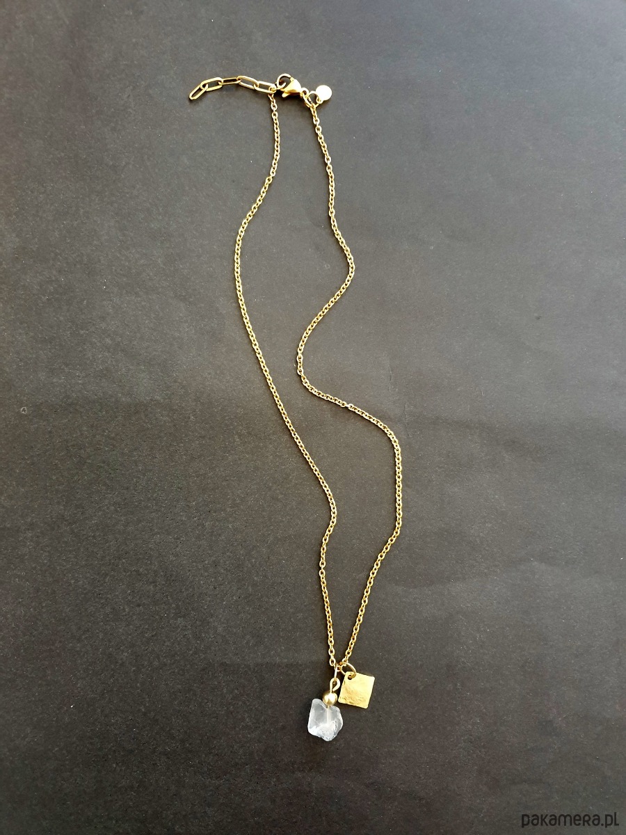 Długość łańcuszka 42 cm z łańcuszkiem przedłużającym 45 cm. Wielkość zawieszki rombu z mosiądzu ok 10/10 mm, kryształu ok. 0,8 mm. Potrzebujesz inną długość łańcuszka, napisz.
