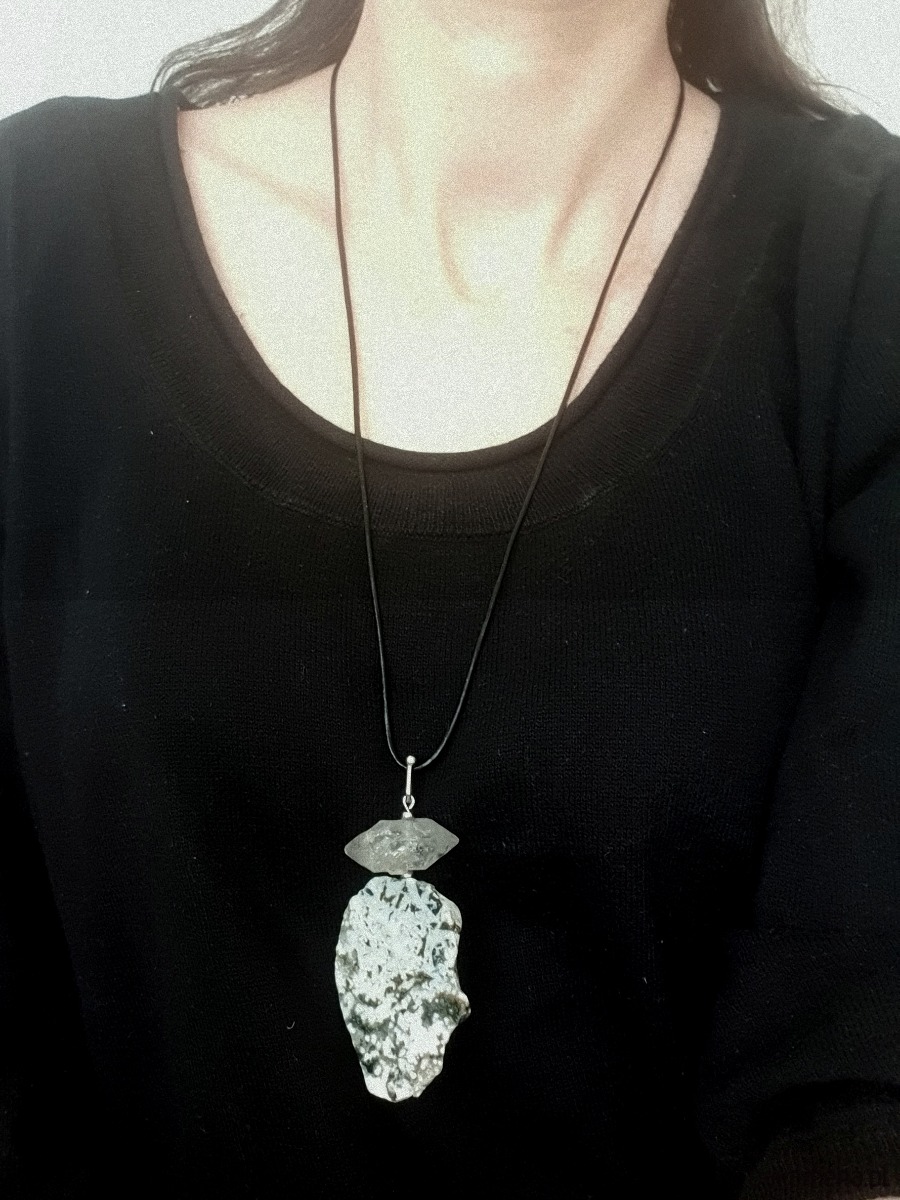 Minimalistyczny, modernistyczny, unikatowy duży wisior na czarnym rzemyku z kolekcji RAW z wyjątkowym surowym, lekko oszlifowanym kryształem herkimer i jaspisem oceanicznym. Elementy ze stali szlachetnej.